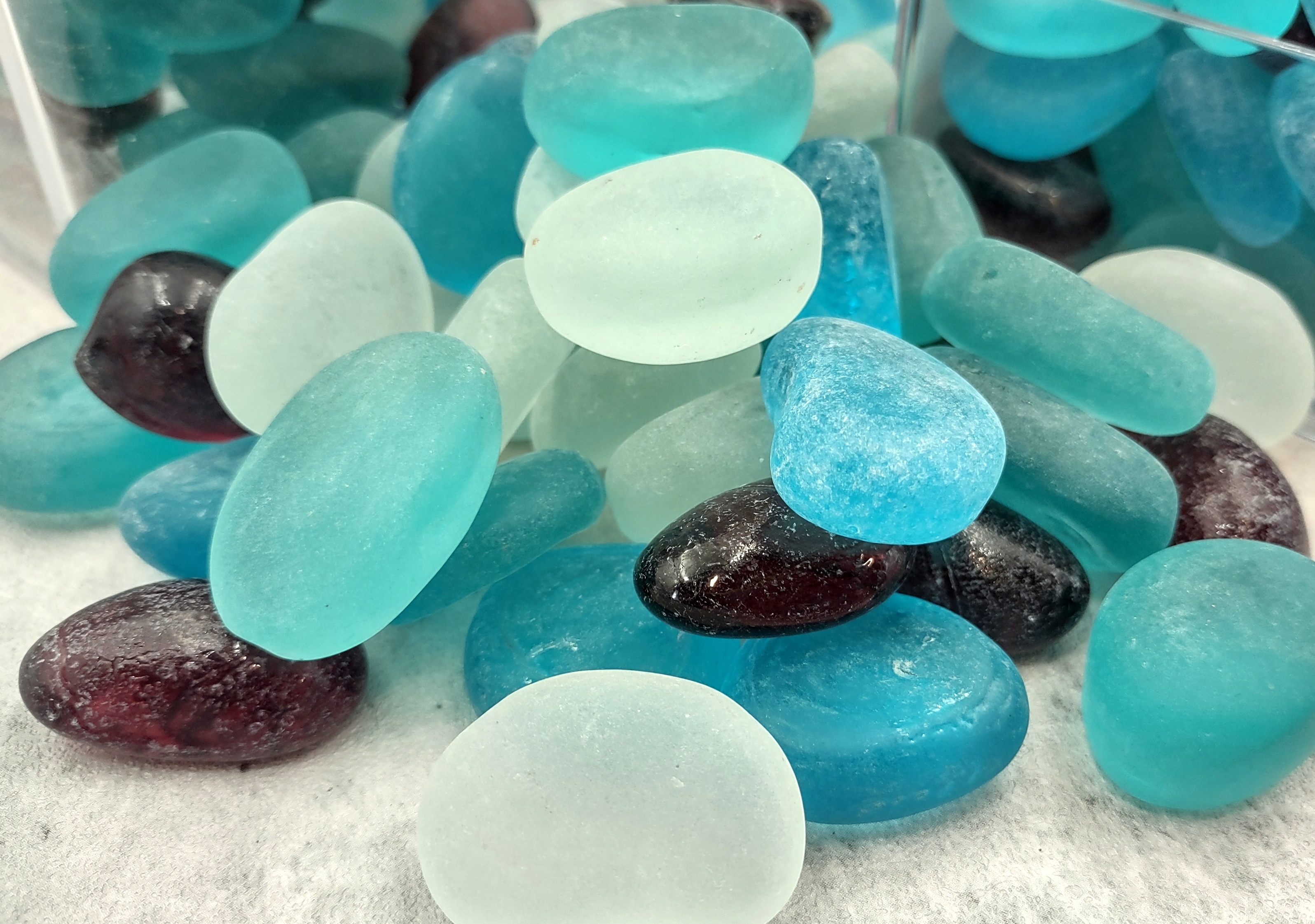 These rounded assorted blue, purple and white glass beach pebbles are machine tumbled recycled/re-manufactured glass pebbles. Lightly frosted when dry from the tumbling, and really "pop" with translucent color when wet. Use our Sea Glass Pebbles to bring a distinctive touch to any craft project or special event arrangements. Can be used as an accent in vases, aquariums, mosaic tile installations, etc.