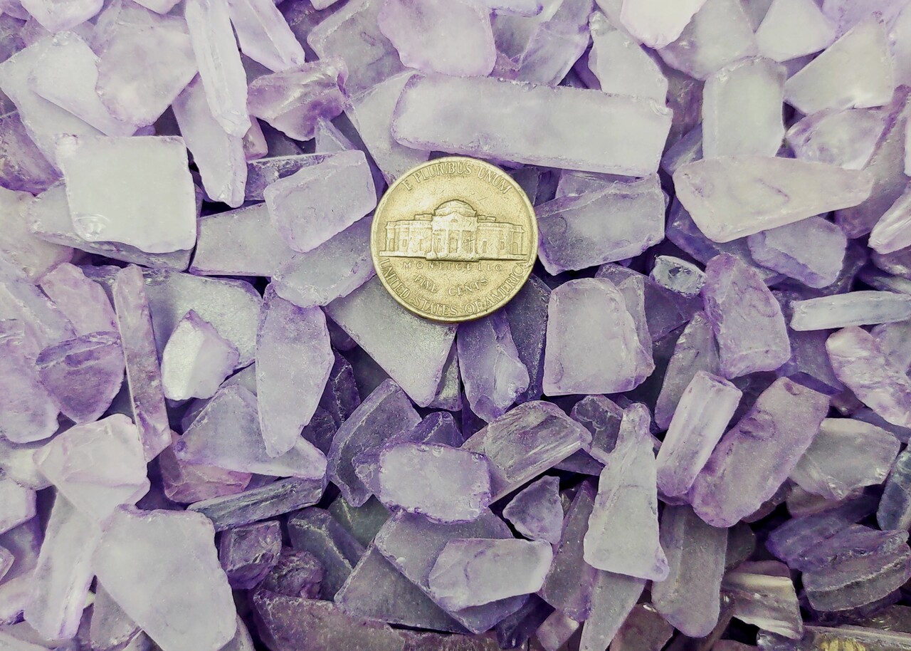 These medium lavender tumbled rough beach glass pieces are machine tumbled recycled/re-manufactured glass pieces. Use our tumbled beach glass to bring a distinctive touch to any craft project or special event arrangements. Can be used as an accent in vases, aquariums, mosaic tile installations, etc.