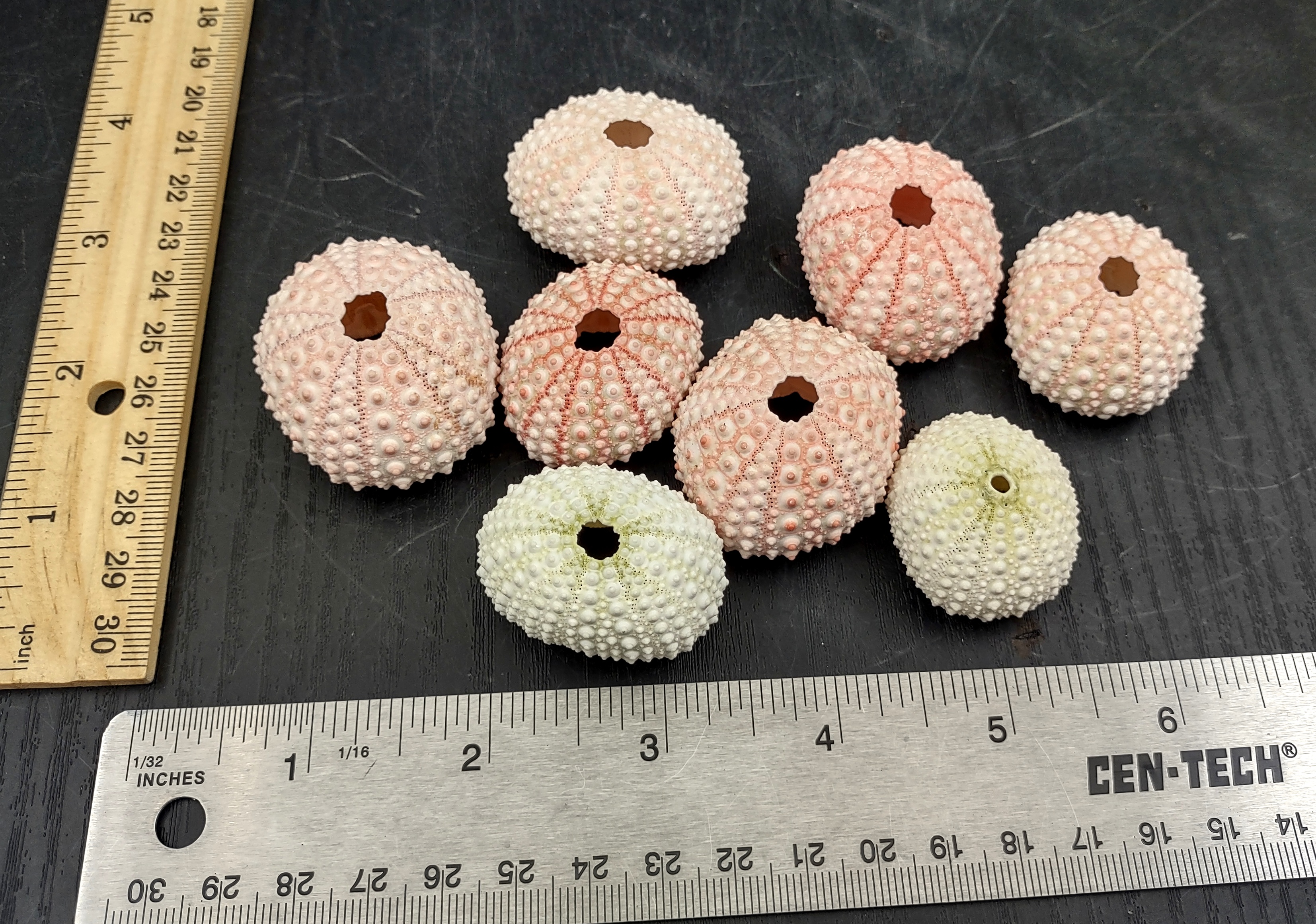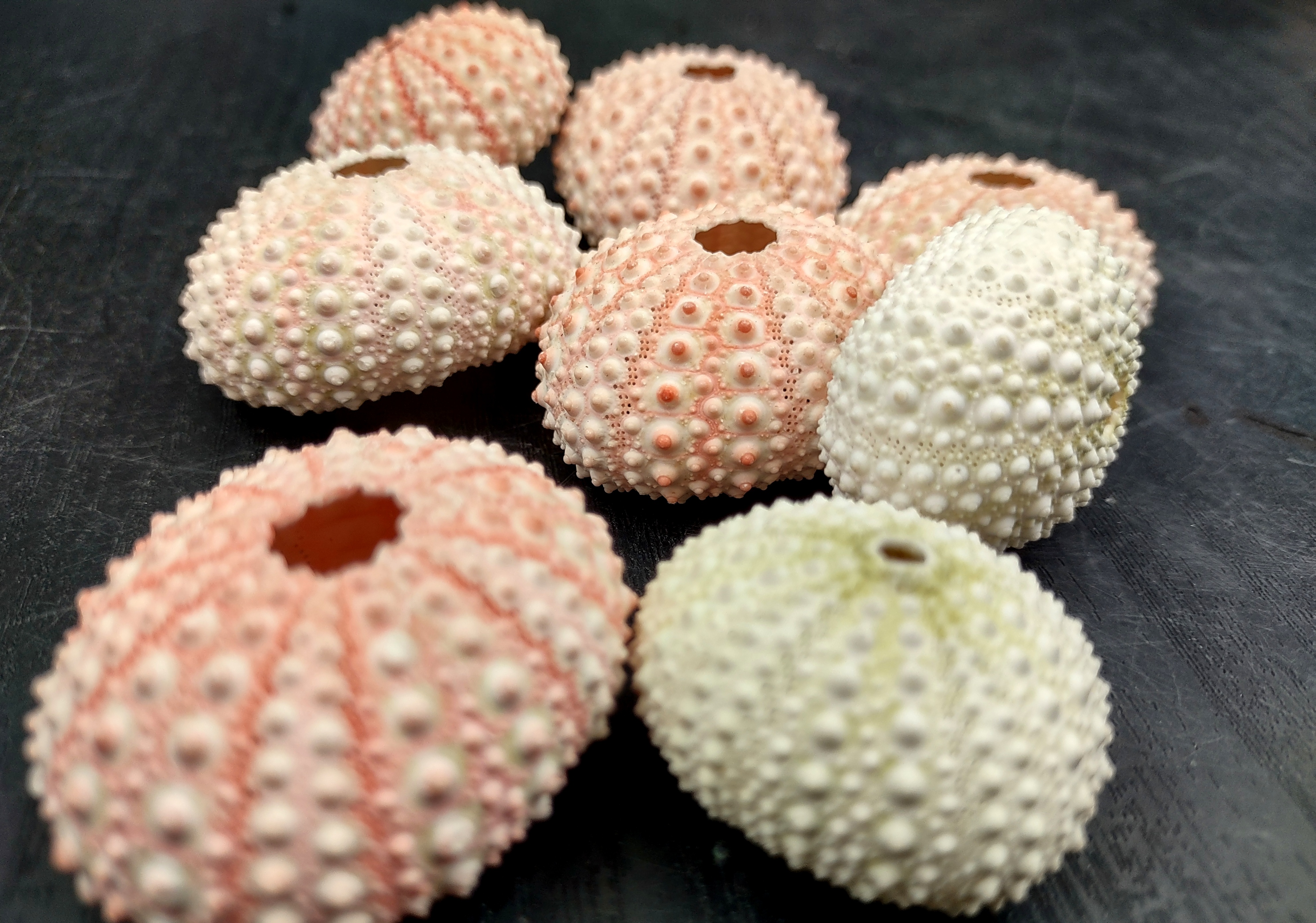 Sea Urchins are found in all oceans. They are small, globular, spiny sea creatures. They come in all kinds of pretty colors. These Urchins are a soft pink color and some have a richer pink coloration running down the grooves (please note that the color can range from almost white to even a hint of green in some cases). Normally with top and bottom holes after harvesting roe.