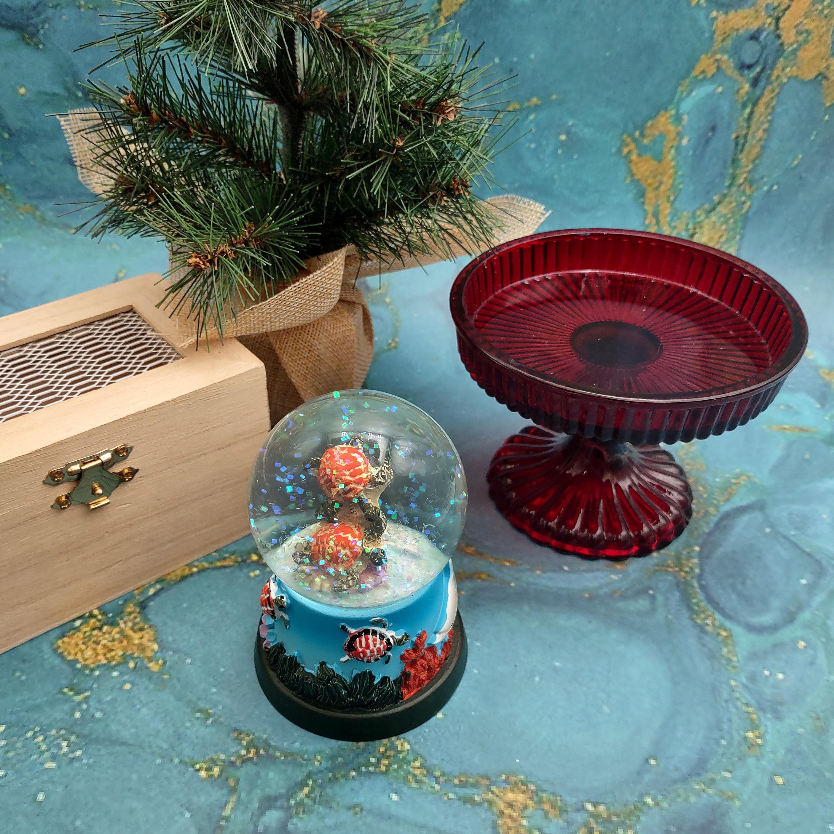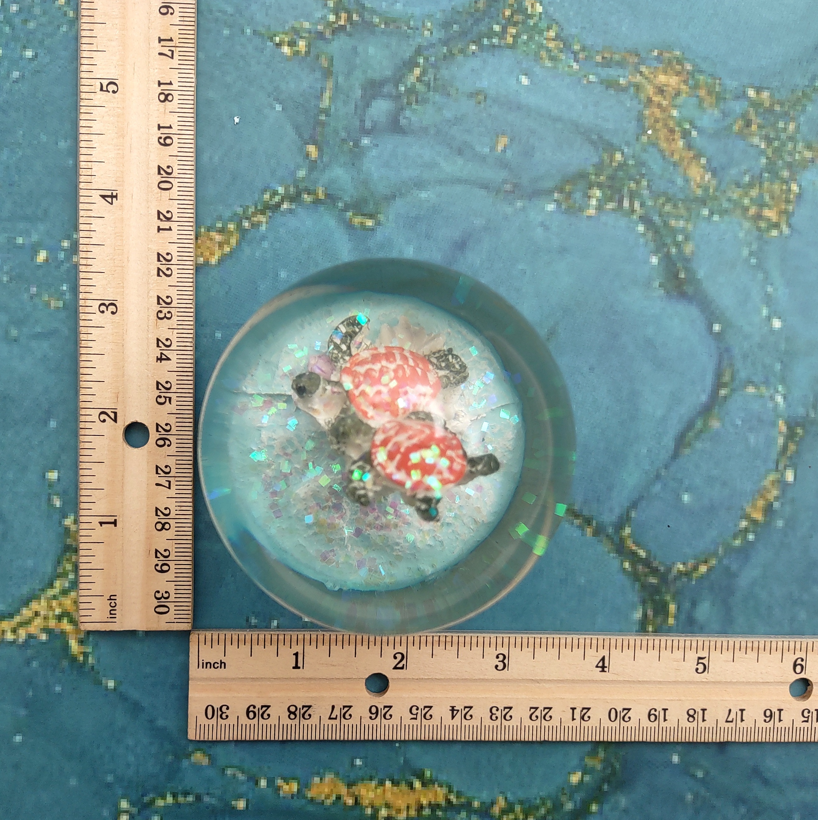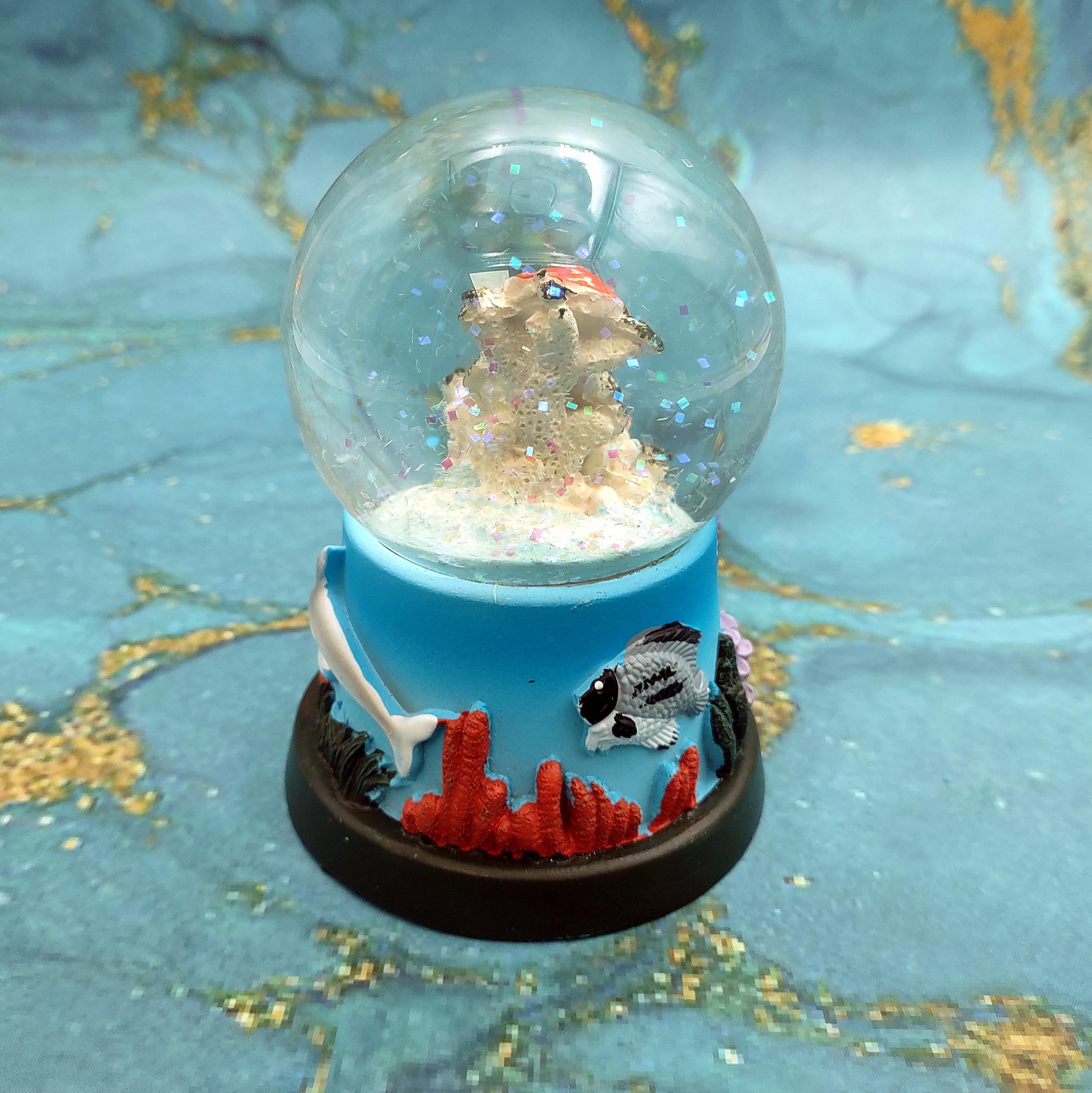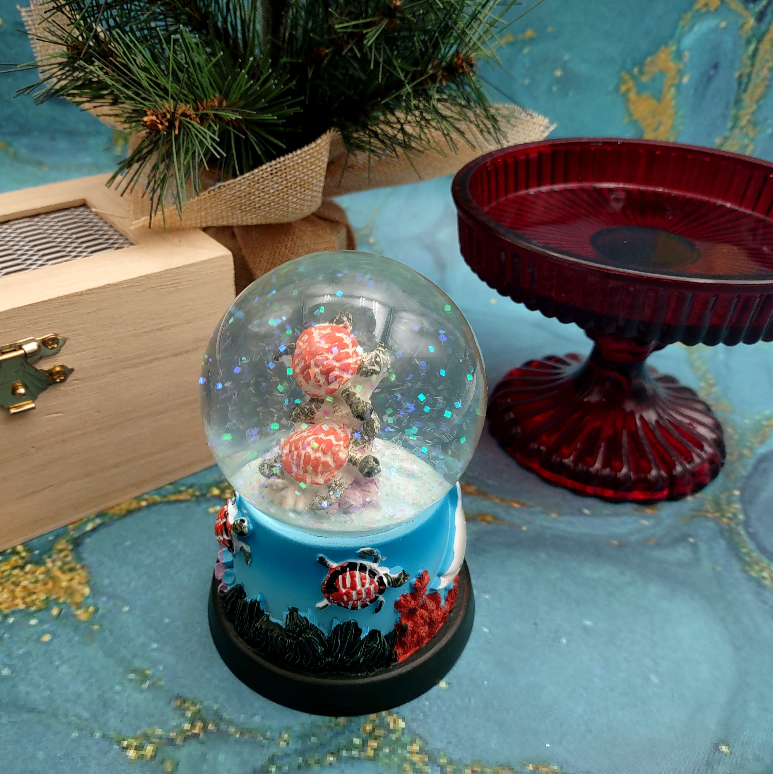 The globe rests on a vibrant blue base decorated with additional sea turtles, coral, and aquatic plants, adding a lively touch of seaside charm. Measuring approximately 2.5 inches tall, this water globe makes a perfect gift for ocean lovers, collectors, or anyone who appreciates nautical decor. Add a tranquil and whimsical touch to your shelves, desk, or mantel with this enchanting sea turtle water globe, bringing the calming spirit of the sea into any space.