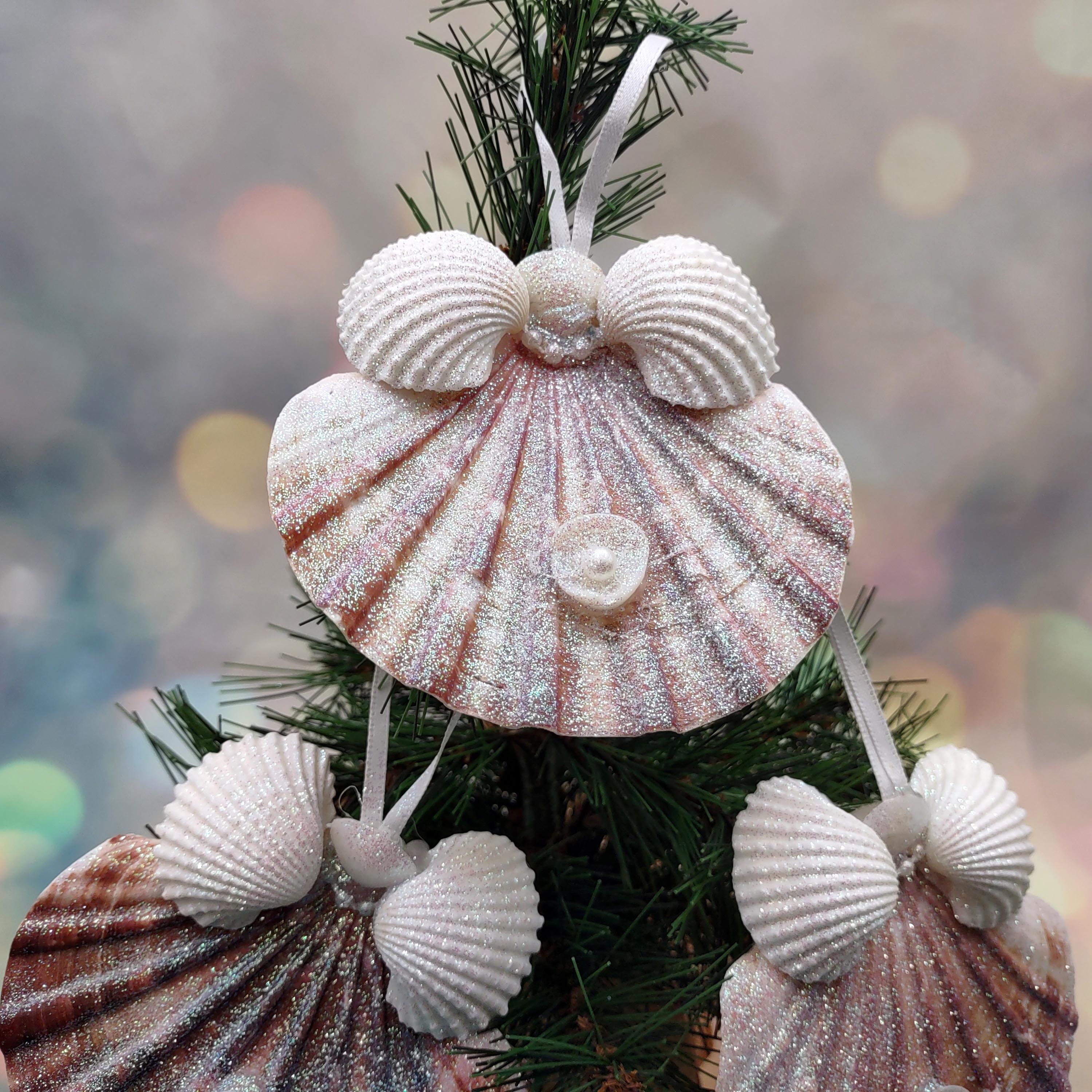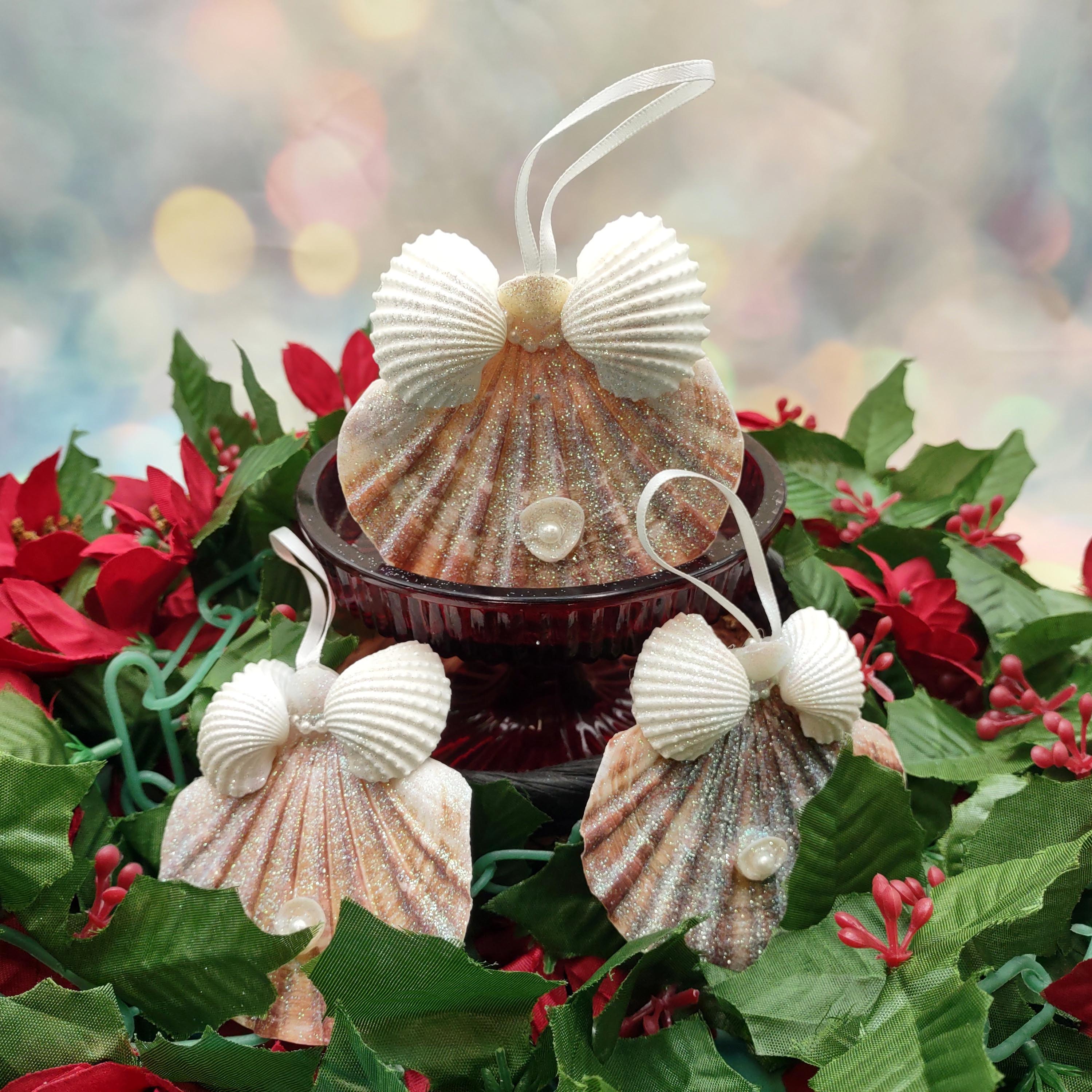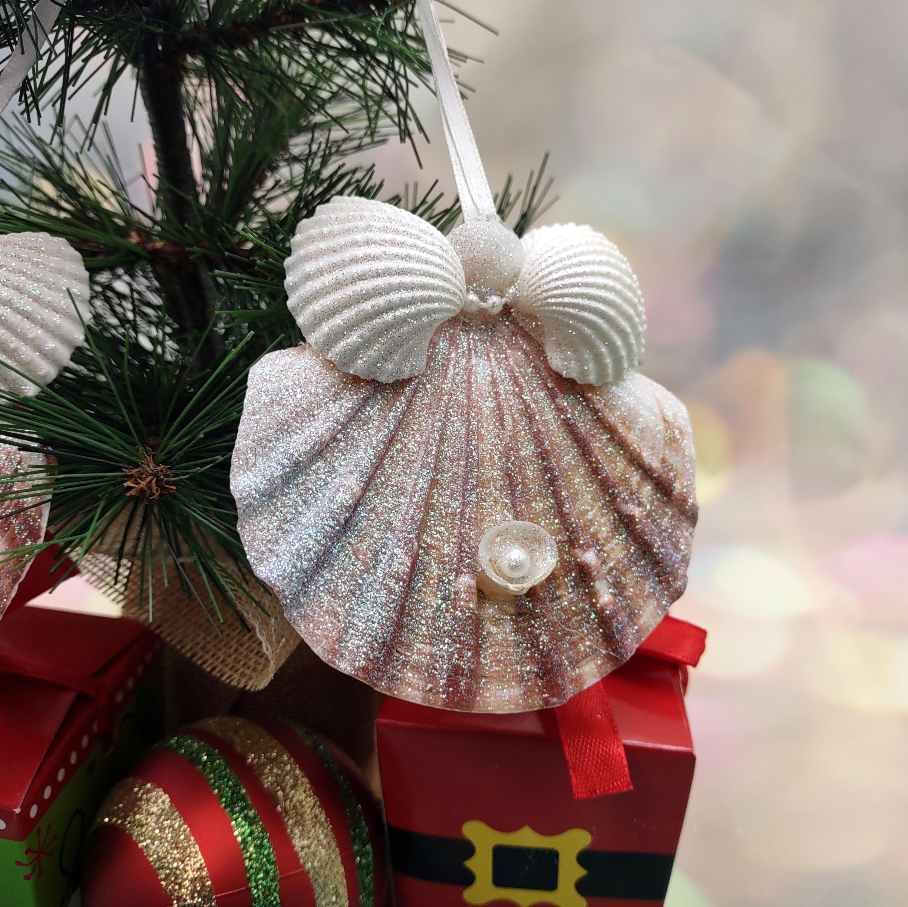 This beautiful angel ornament is crafted from a scallop shell with arca clam shells for the wings, head and body decoration. then it is lightly dusted with fine glitter for an ethereal shimmering look. There is a small white ribbon on the hat that you can use to hang from a christmas tree, a wall hook, or give as a gift! Perfect for your holiday decor.
