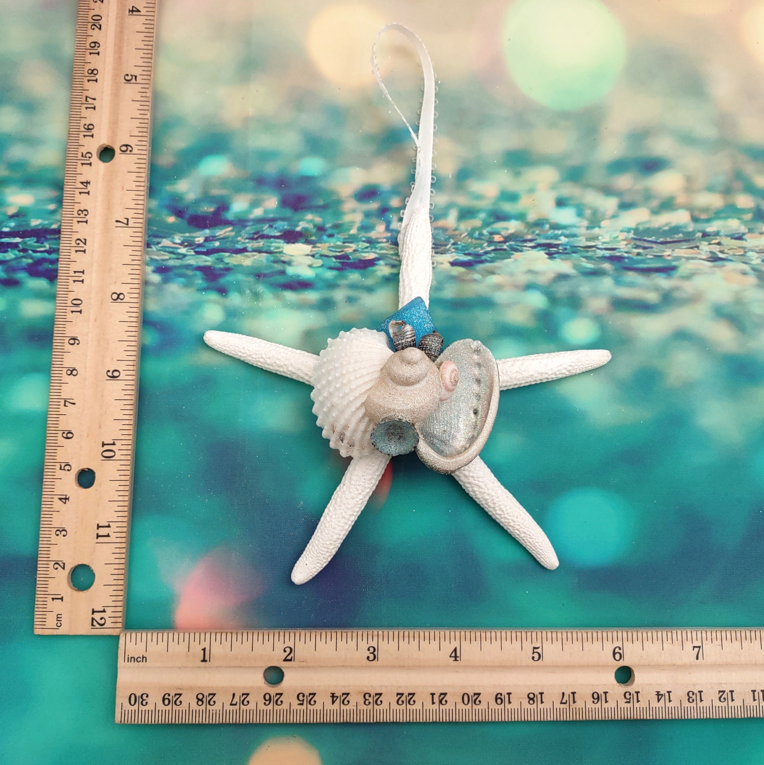White linckia finger starfish is adorned with frosted sea glass, various small shells and is dusted with iridescent glitter and a satin ribbon to hang on your holiday decor.