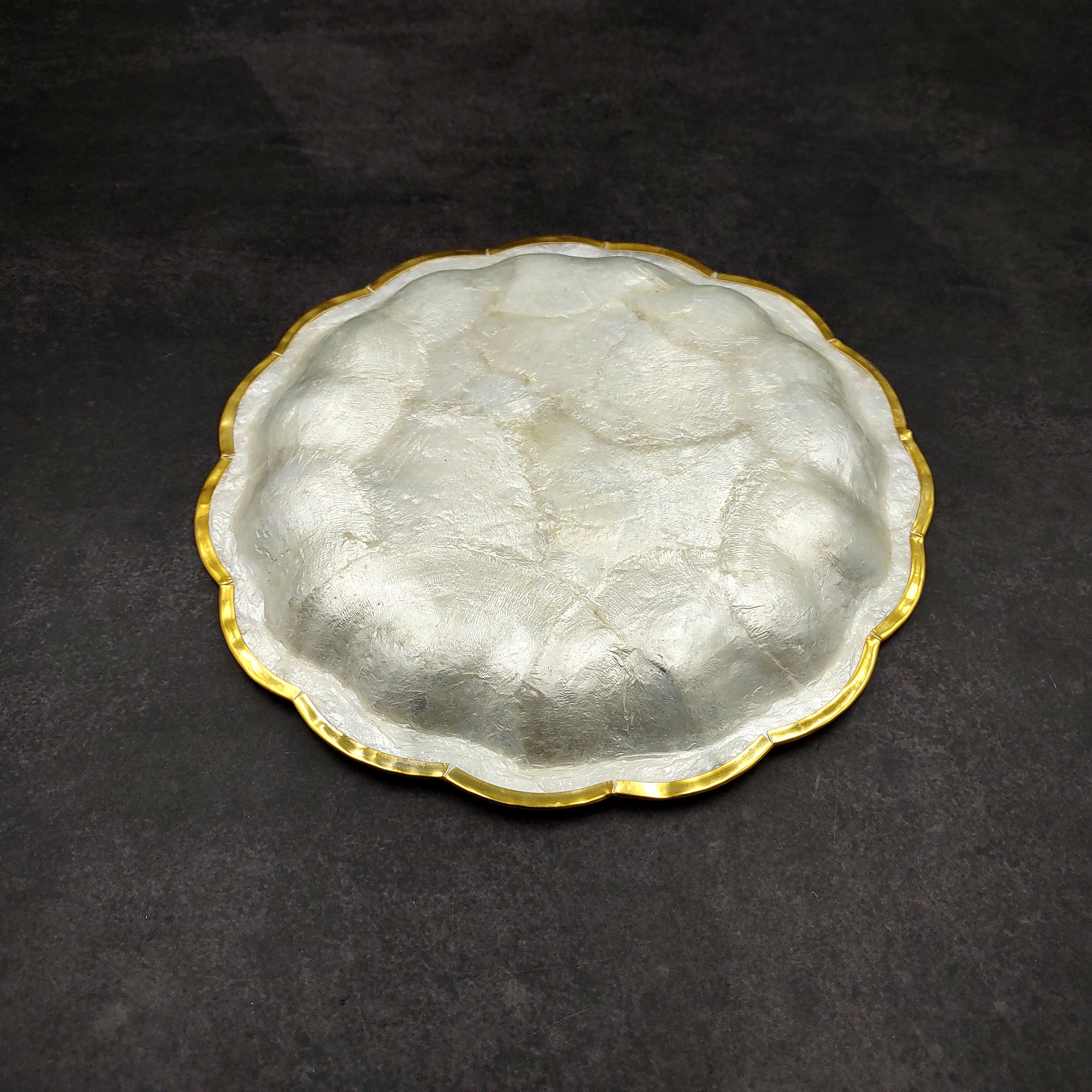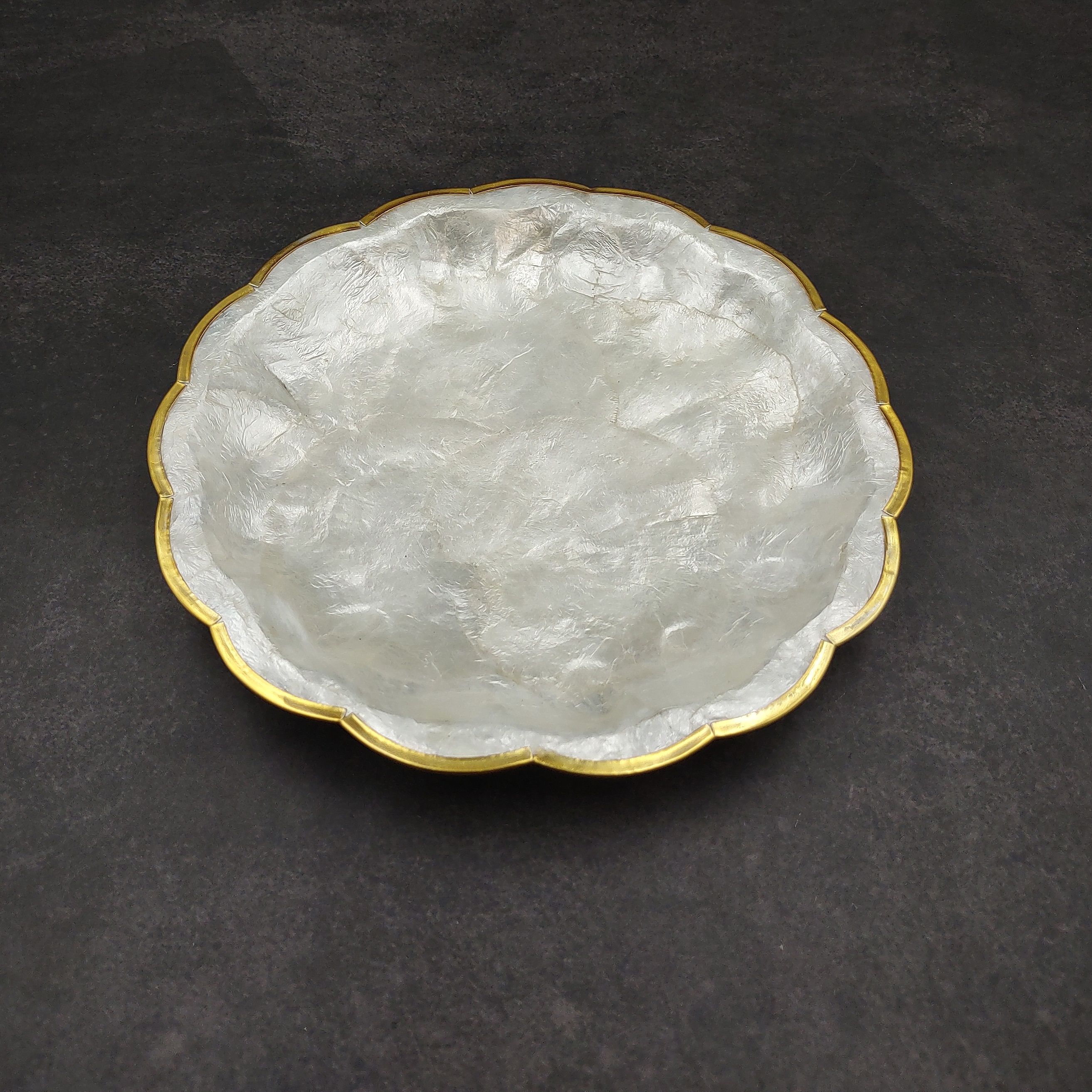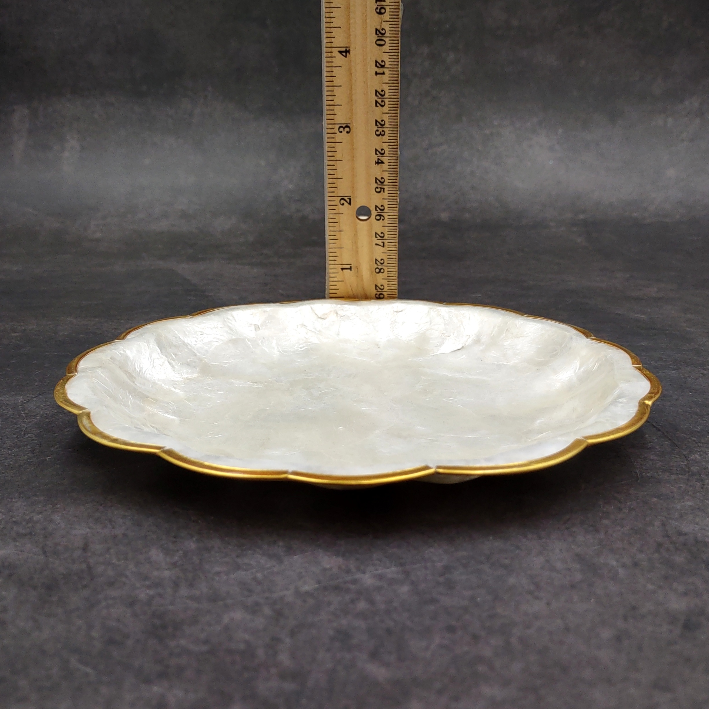 Single translucent white capiz shell dish with gold edging (not real gold). Very stylish and unique. Great for trinkets or jewelry, this coastal themed dish will be a wonderful addition to any decor. Thin delicate capiz decorative shell bowl is not for rough use and is not dishwasher safe.