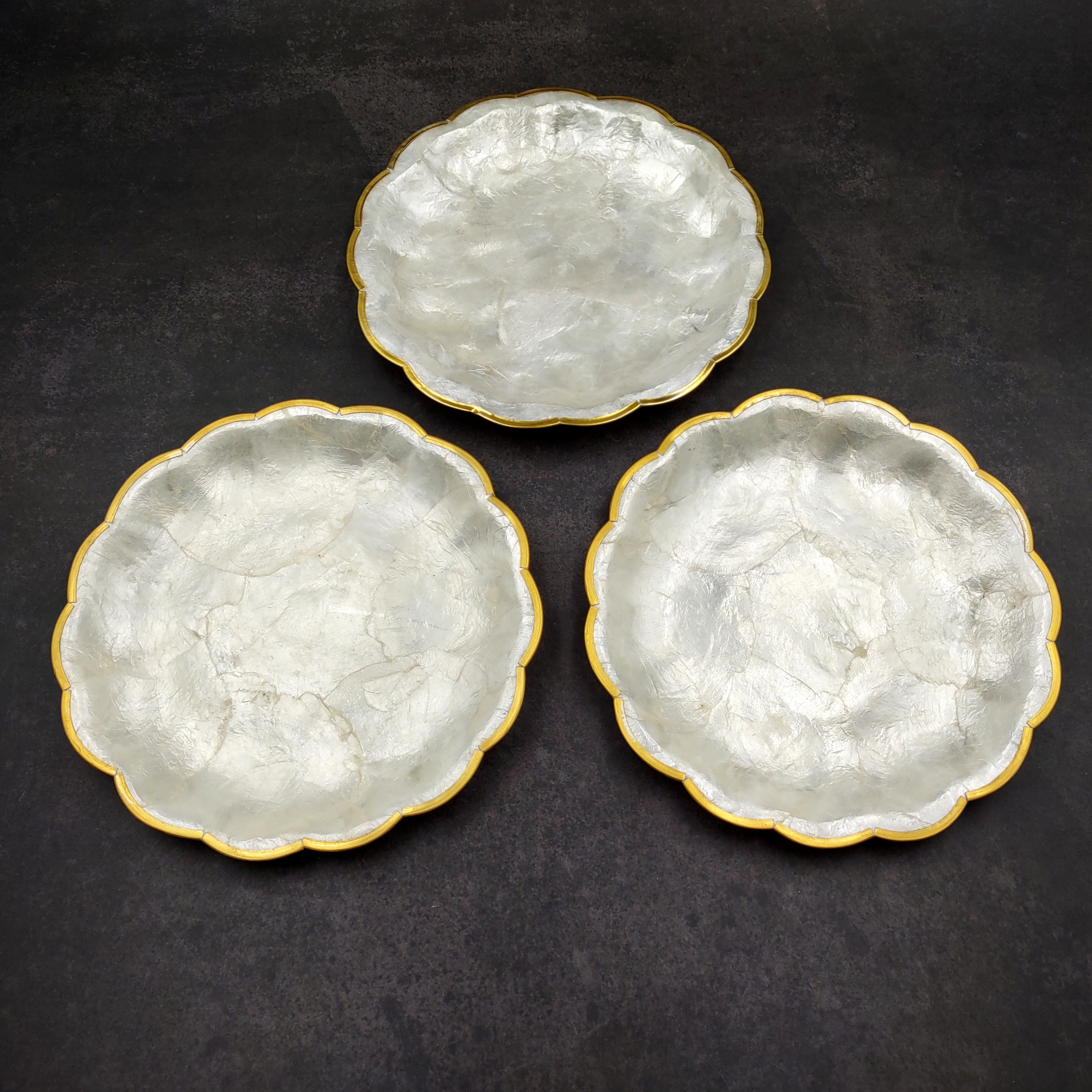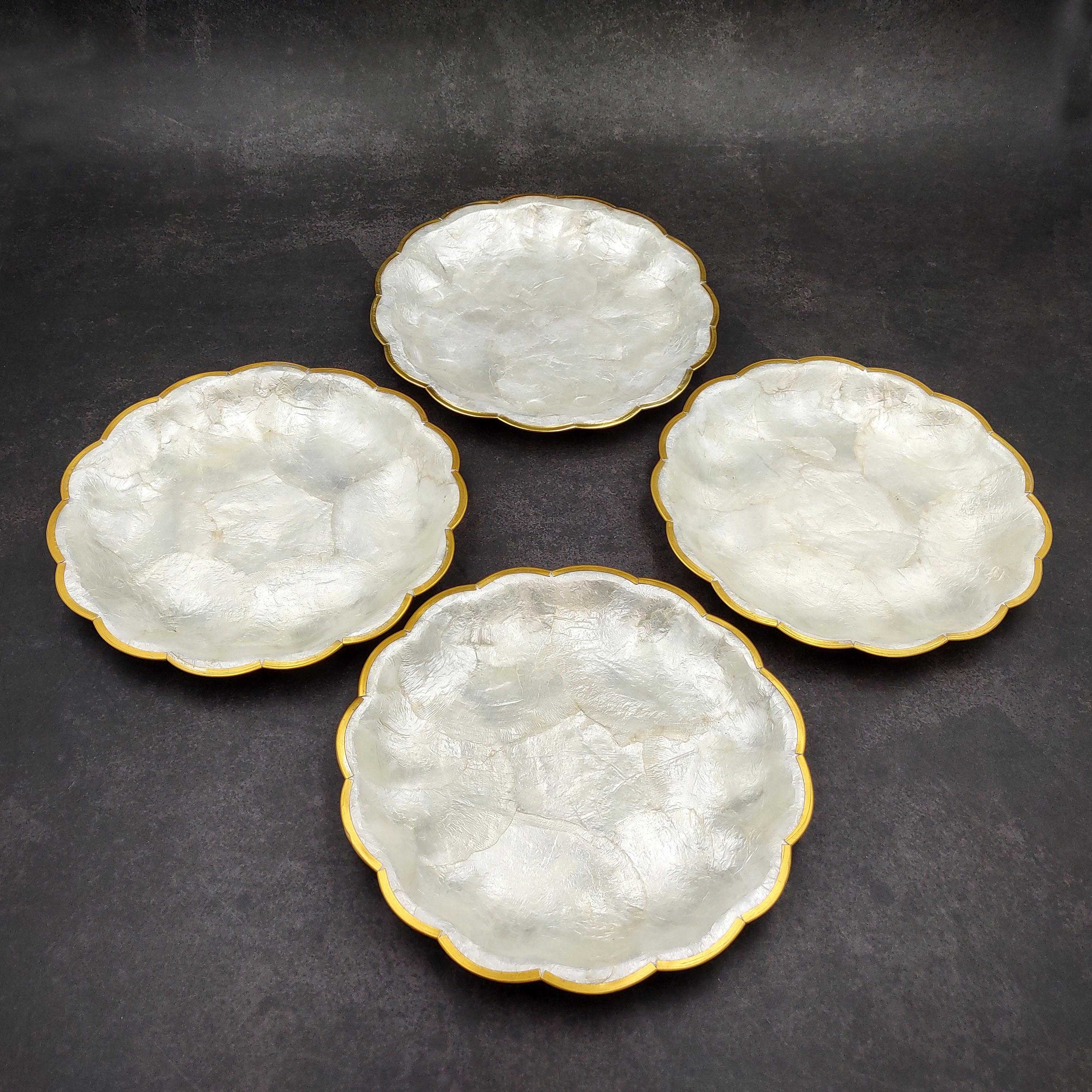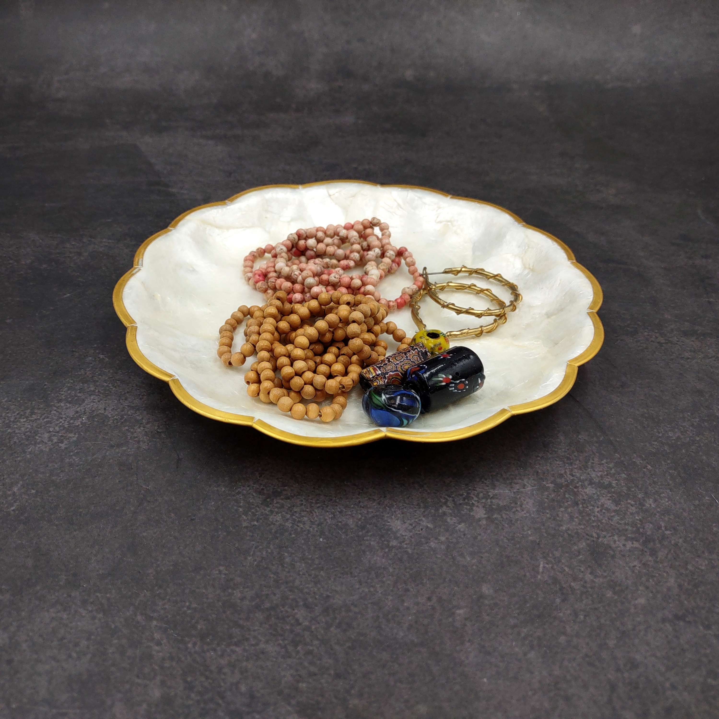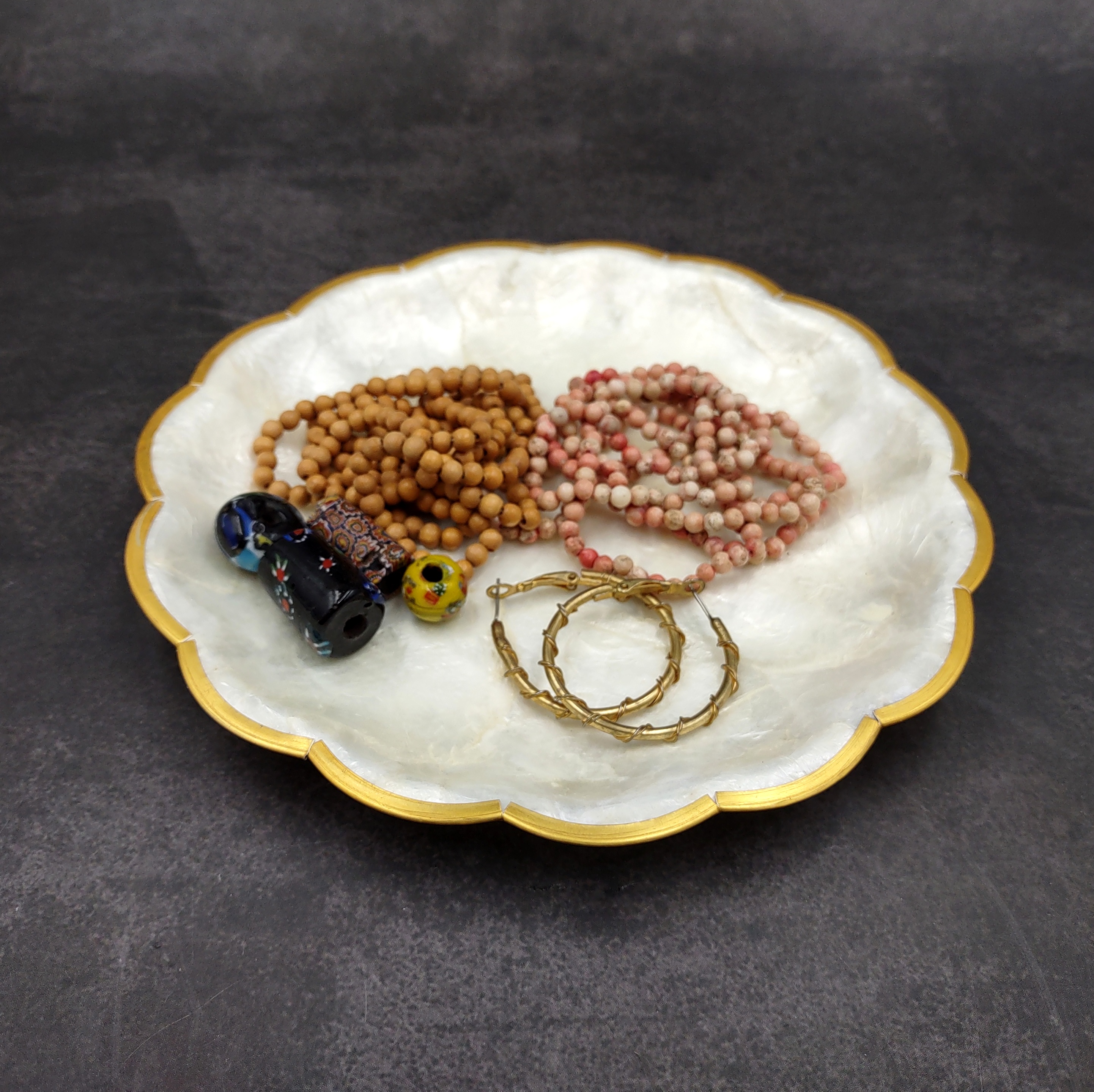 Single translucent white capiz shell dish with gold edging (not real gold). Very stylish and unique. Great for trinkets or jewelry, this coastal themed dish will be a wonderful addition to any decor. Thin delicate capiz decorative shell bowl is not for rough use and is not dishwasher safe.