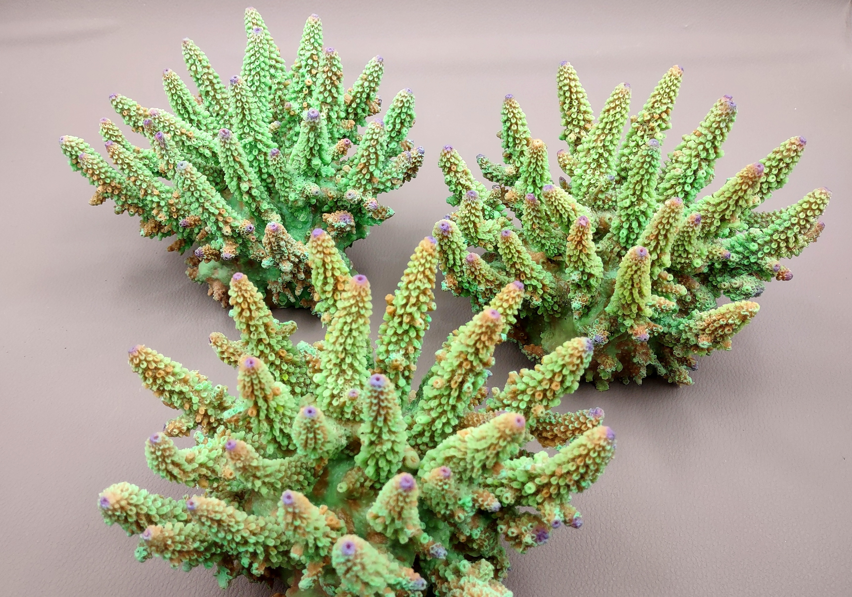 Acropora Humilis (finger staghorn) Branches are thick, gradually tapering to large dome-shaped axial corallites. Small branchlets or incipient axial corallites usually occur at the base of main branches. Radial corallites are of two sizes, the larger are usually in rows, have thick walls and only increase slightly down the sides of branches. Color: Many colors, but most usually cream, brown, purple or blue (which may photograph purple) with blue or cream tips.