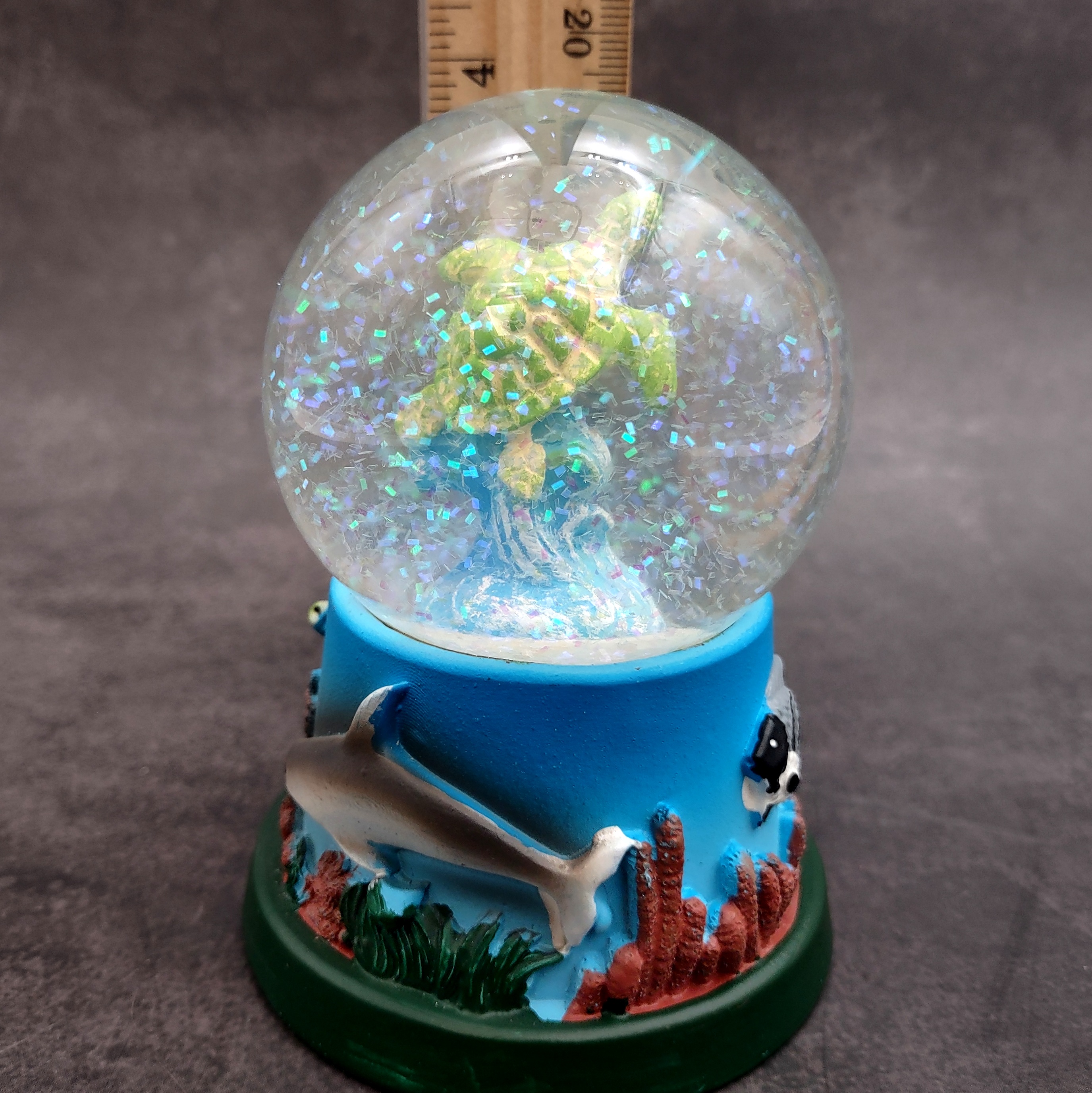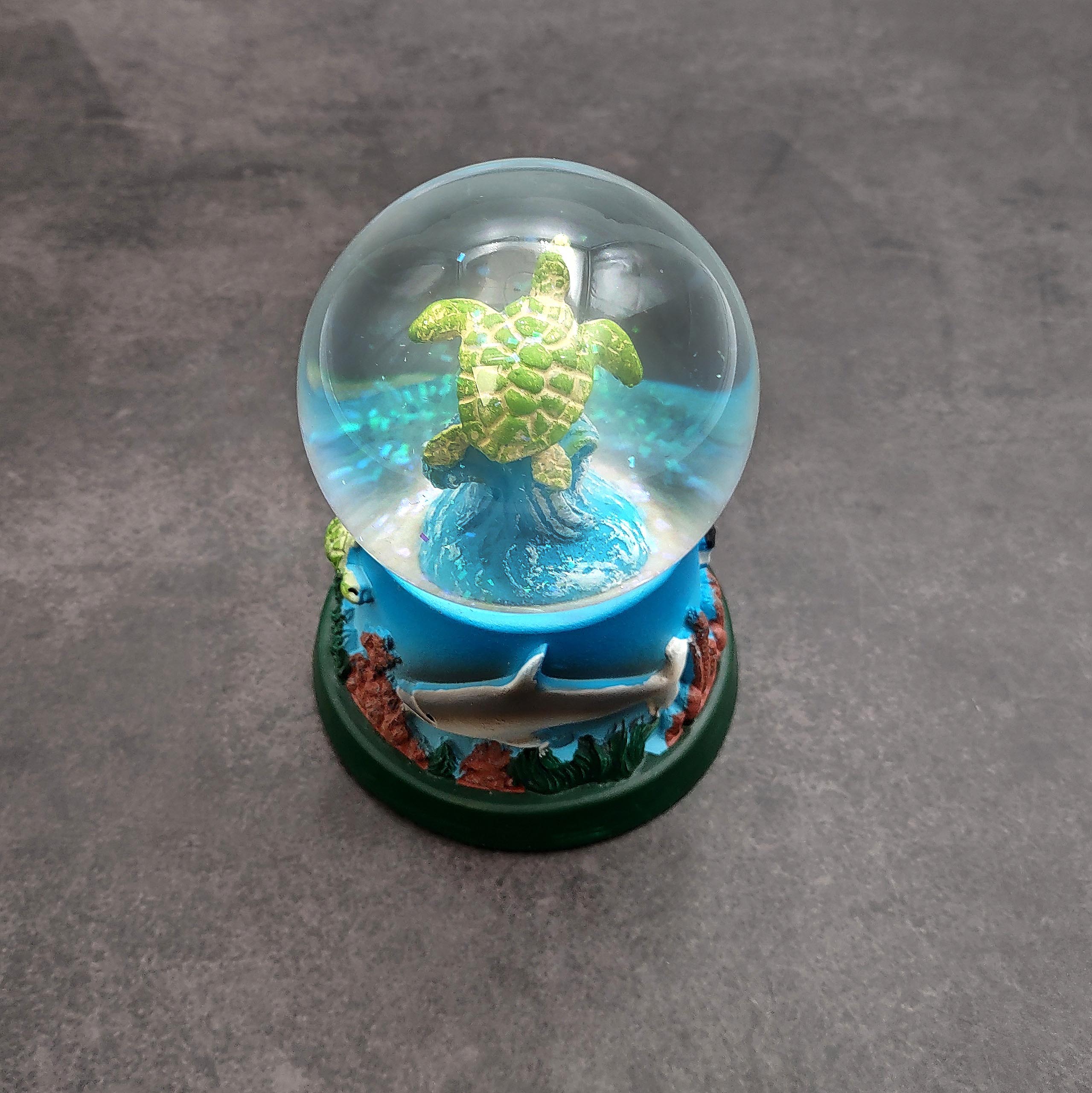 Set on a colorful base decorated with coral, seaweed, and additional turtles, this water globe adds a whimsical nautical touch to any space. Ideal for ocean lovers, collectors, or as a thoughtful gift, it measures approximately [insert size if needed] and makes a delightful addition to shelves, desks, or mantelpieces. Infuse your decor with calming ocean vibes with this enchanting green sea turtle water globe.
