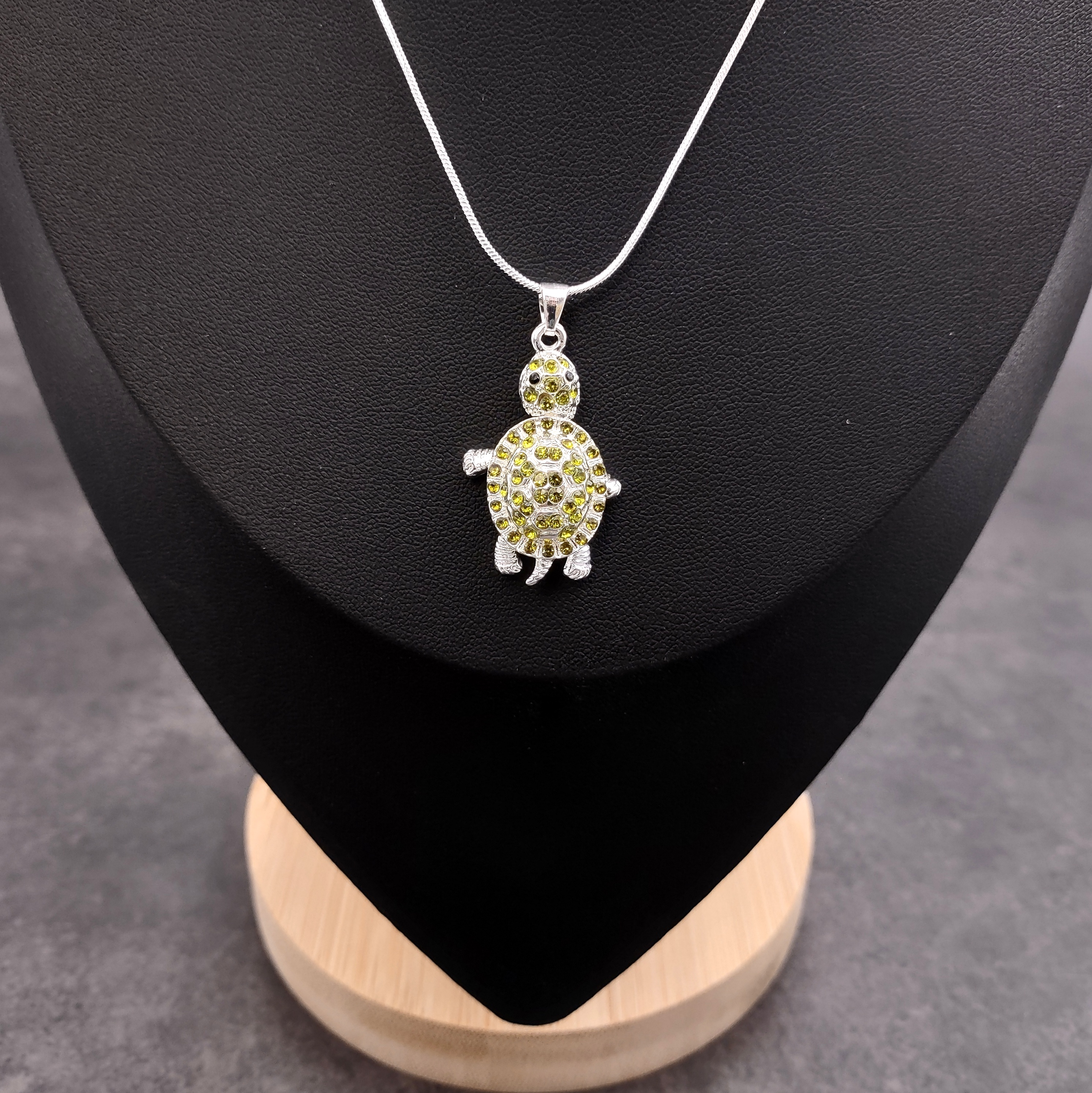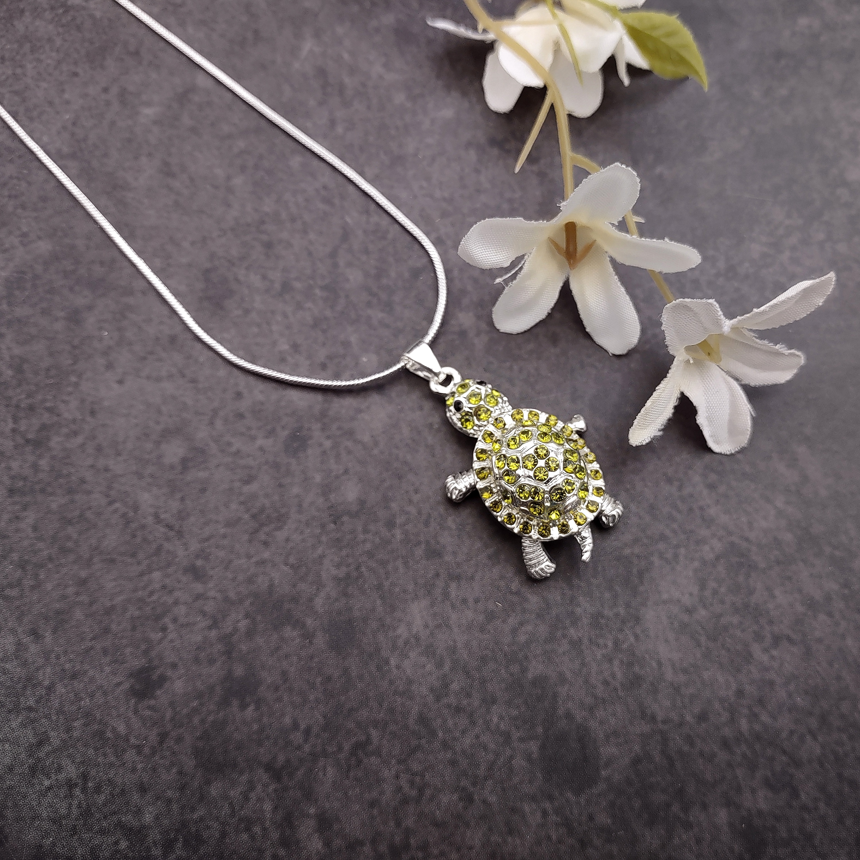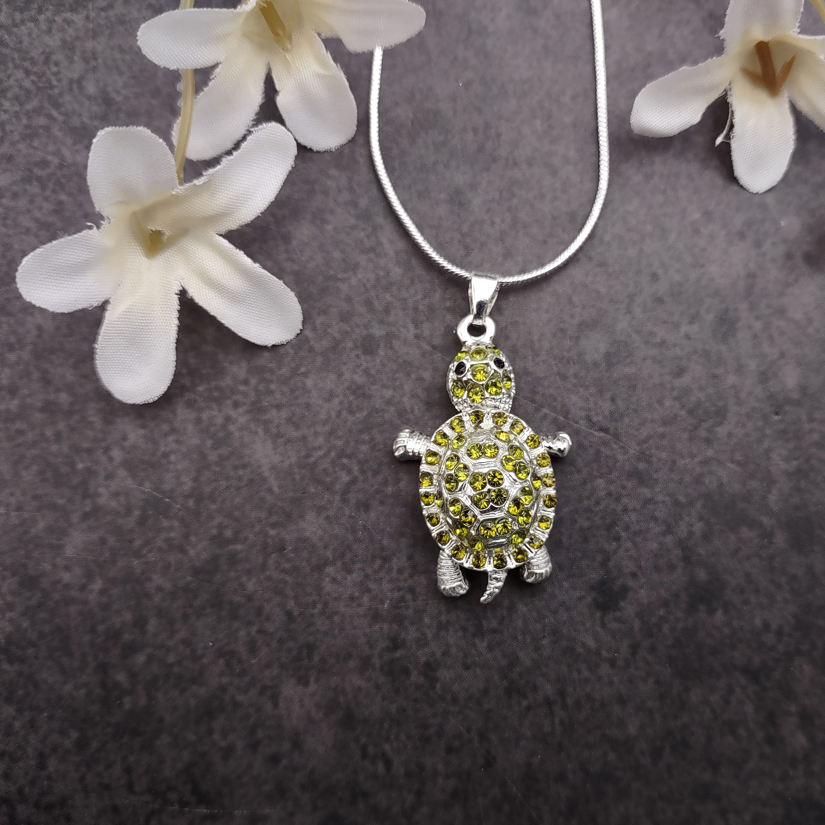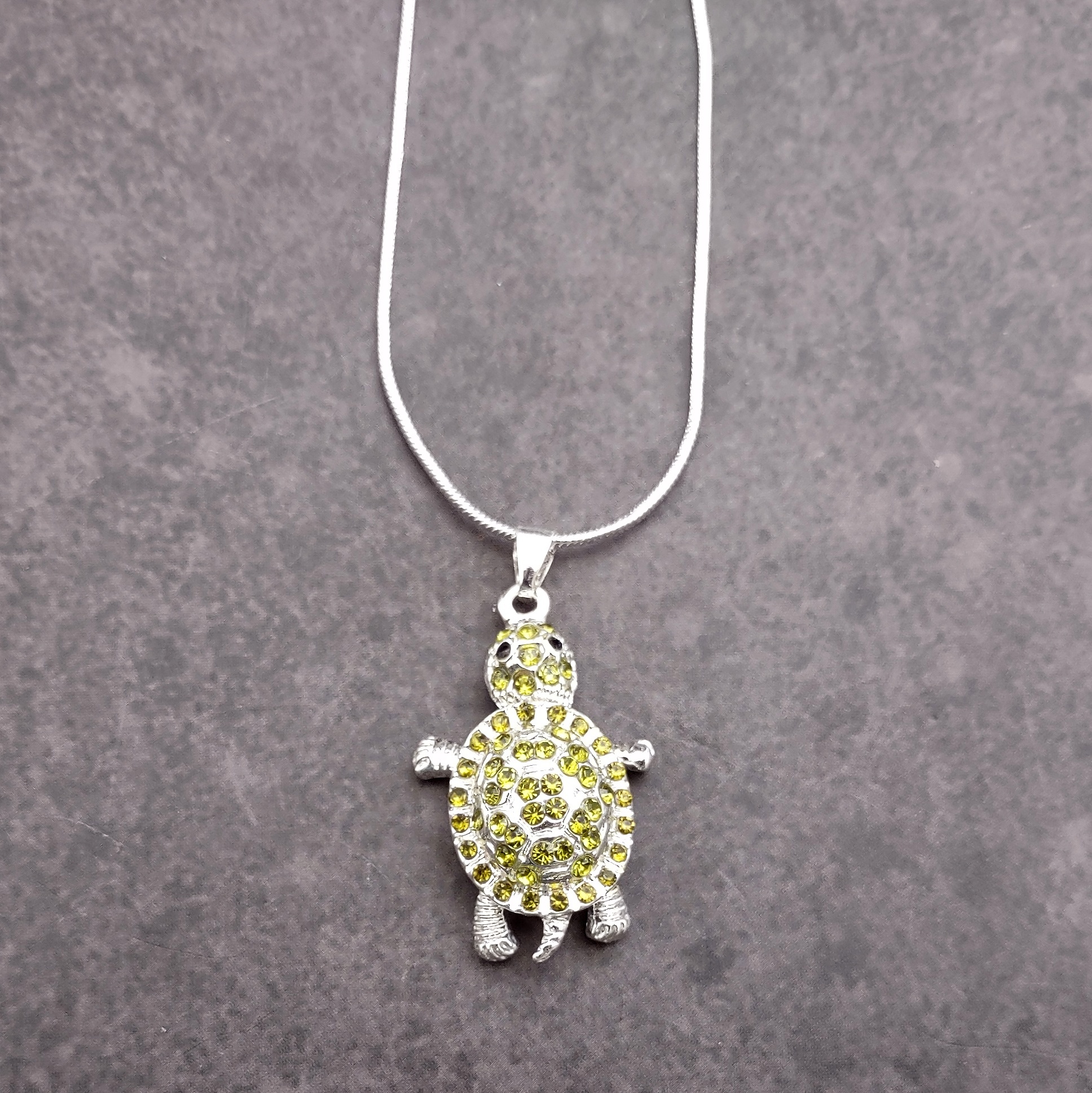 Customers often search for: rhinestone turtle, green rhinestone, silver tone chain, sea turtle jewelry, sea turtle necklace, beach jewelry, sea turtle gift, sea turtle charm, lime turtle pendant, silver tone jewelry, coastal jewelry, sea animal pendant, handmade jewelry