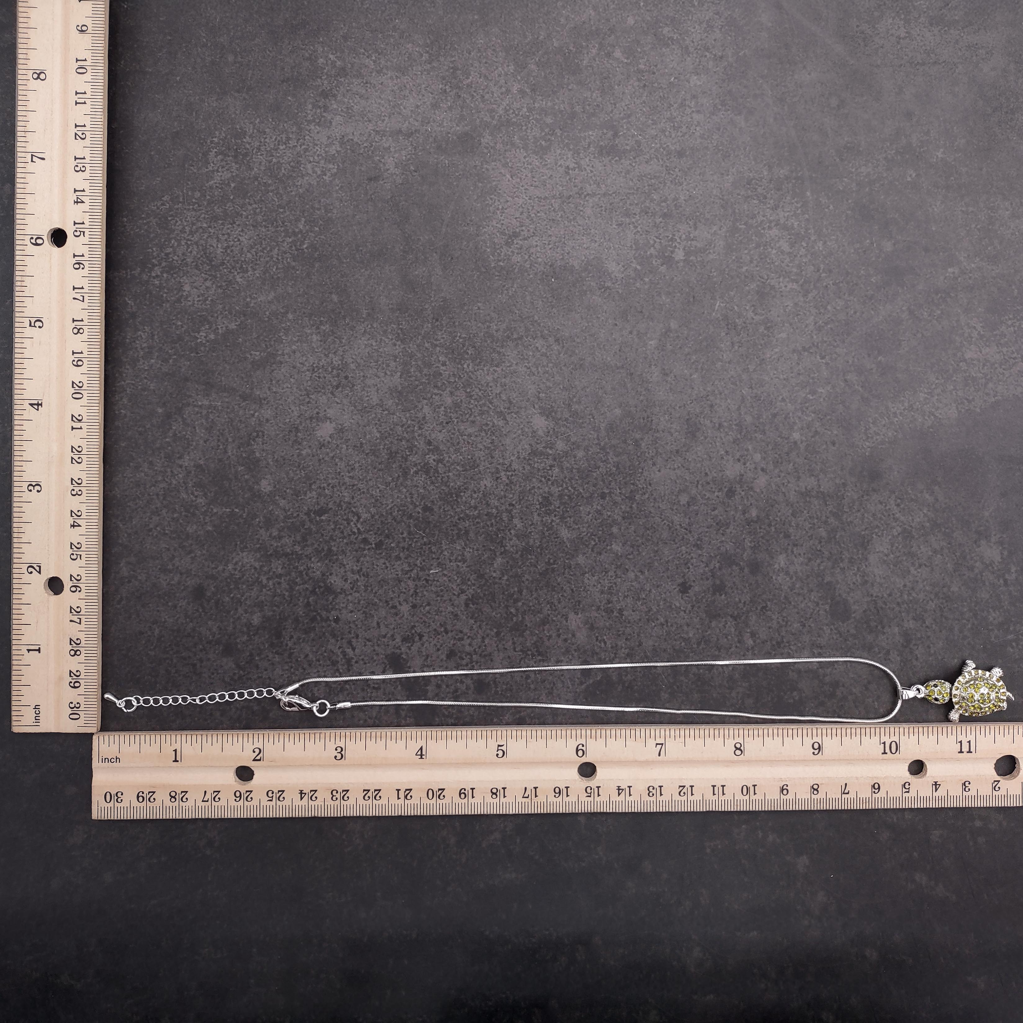 Add a touch of oceanic sparkle with this green rhinestone sea turtle pendant. Crafted with lime green rhinestones on a silver-tone base, it measures about 1 inch high and 3/4 inch wide, making it a stylish statement piece. The 16-inch silver-tone snake chain drapes smoothly around the neck, creating a comfortable and flattering fit.