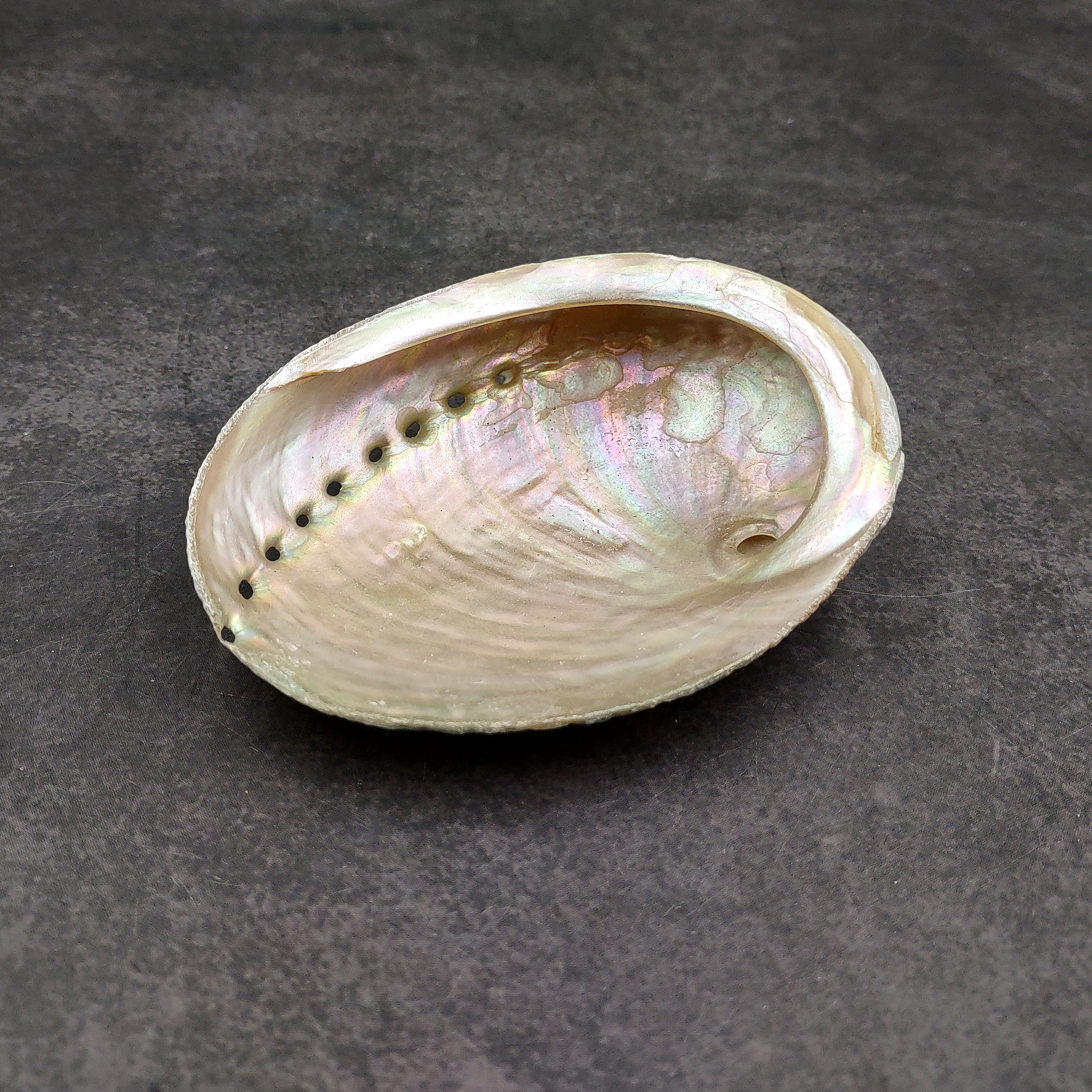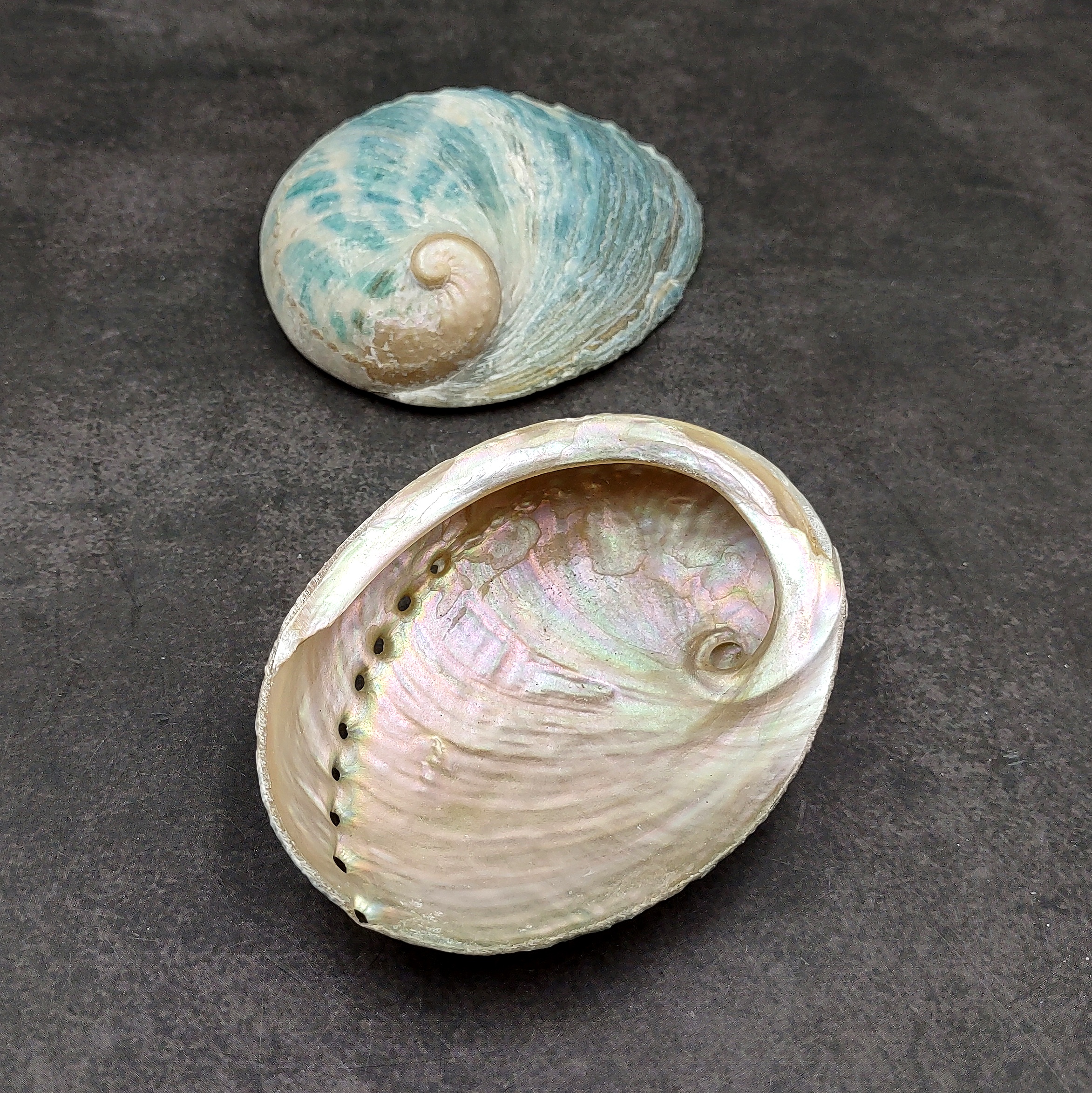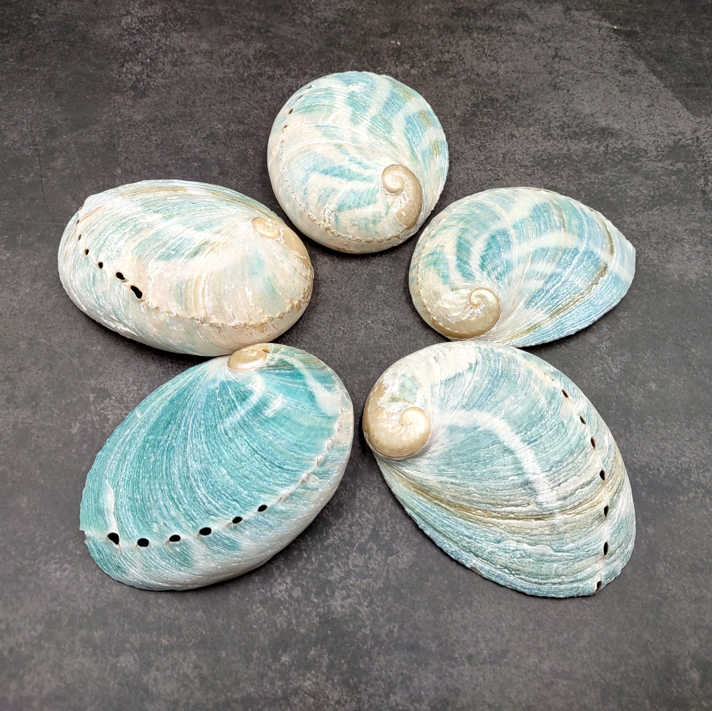 Bring the natural beauty of the ocean into your home with this Aqua Green Abalone Shell (Haliotis iris). Measuring about 3+ inches, each shell features a polished, shimmering interior that reflects aqua, green, and iridescent tones, while the outer surface remains natural, highlighting the authentic texture of the shell. These abalone shells come from the coastal waters of New Zealand, where Haliotis iris—also known as paua—naturally grows. Every shell has its own unique pattern and coloring.