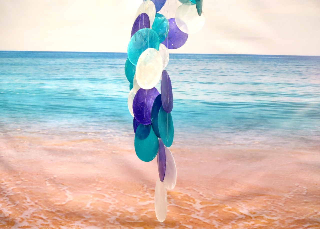 Add calm, natural charm, and simple elegance to your space with this ocean-colored Capiz shell wind chime. Ideal for creating a peaceful, coastal atmosphere.