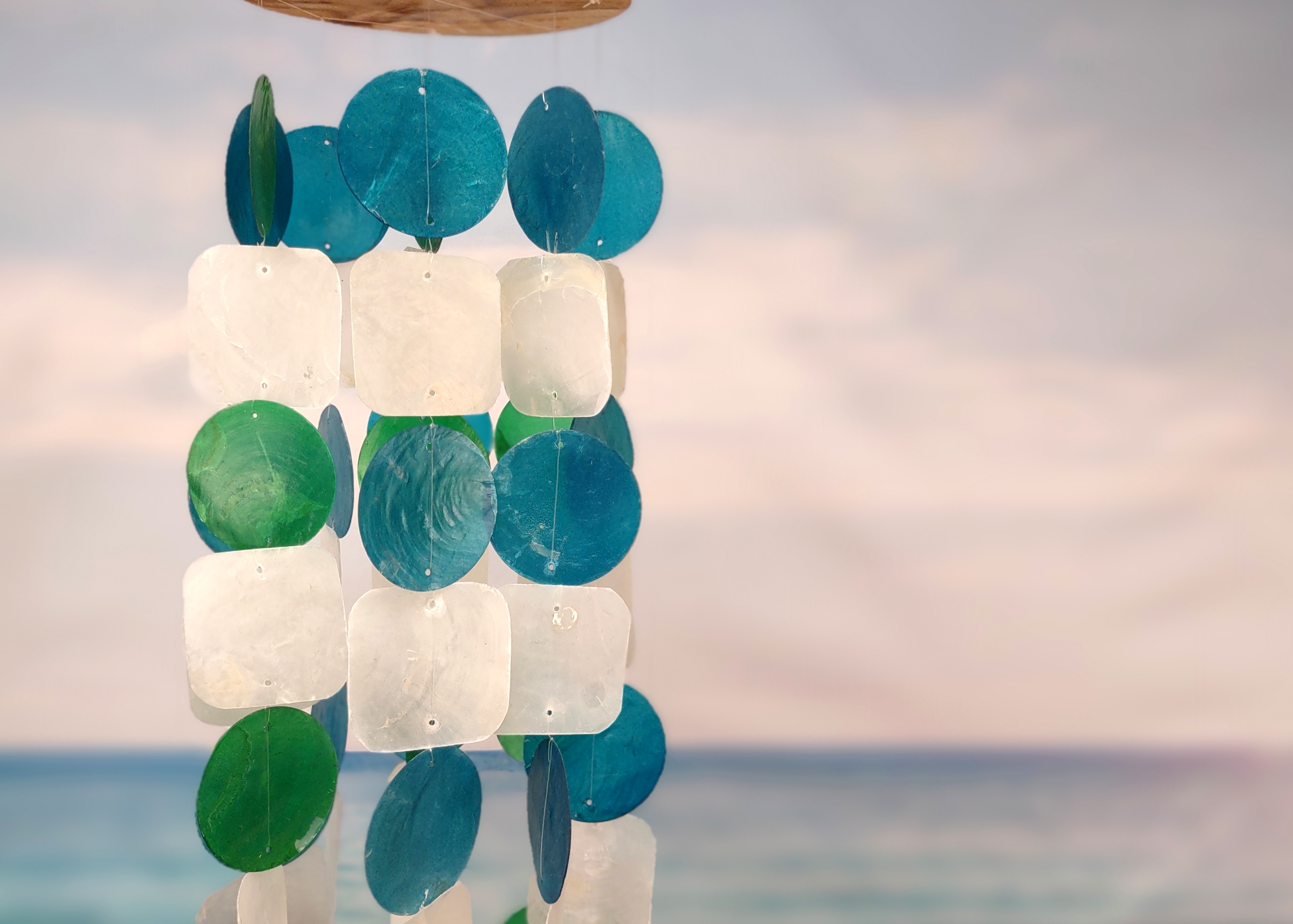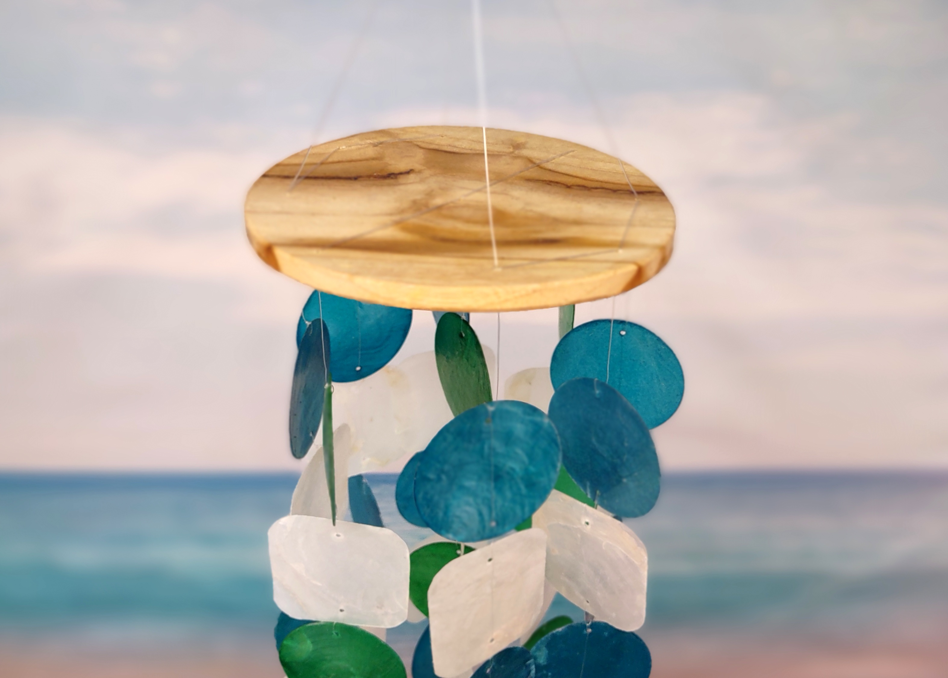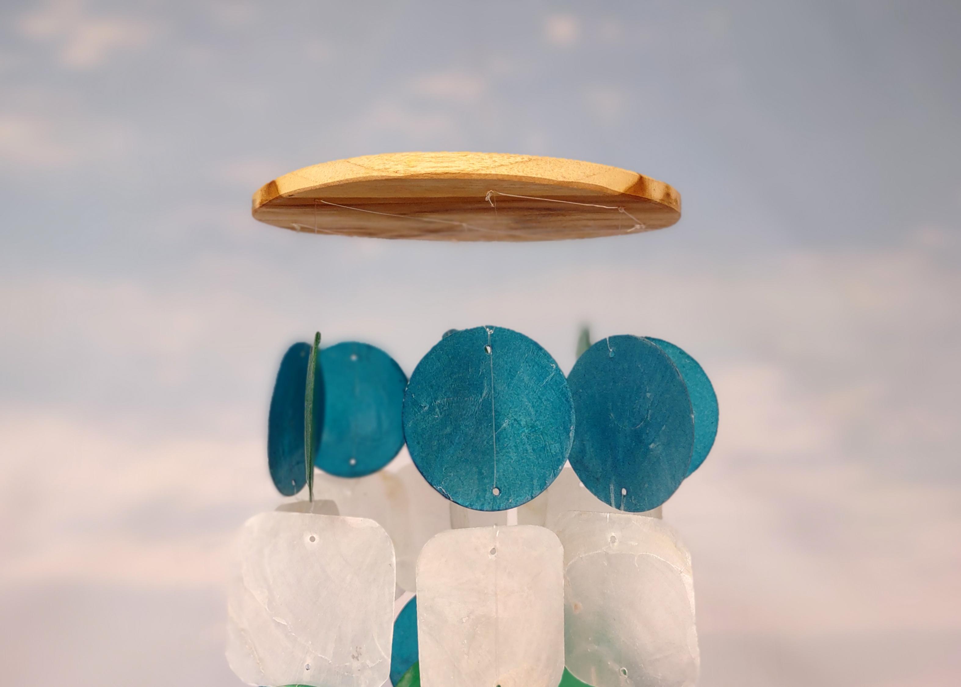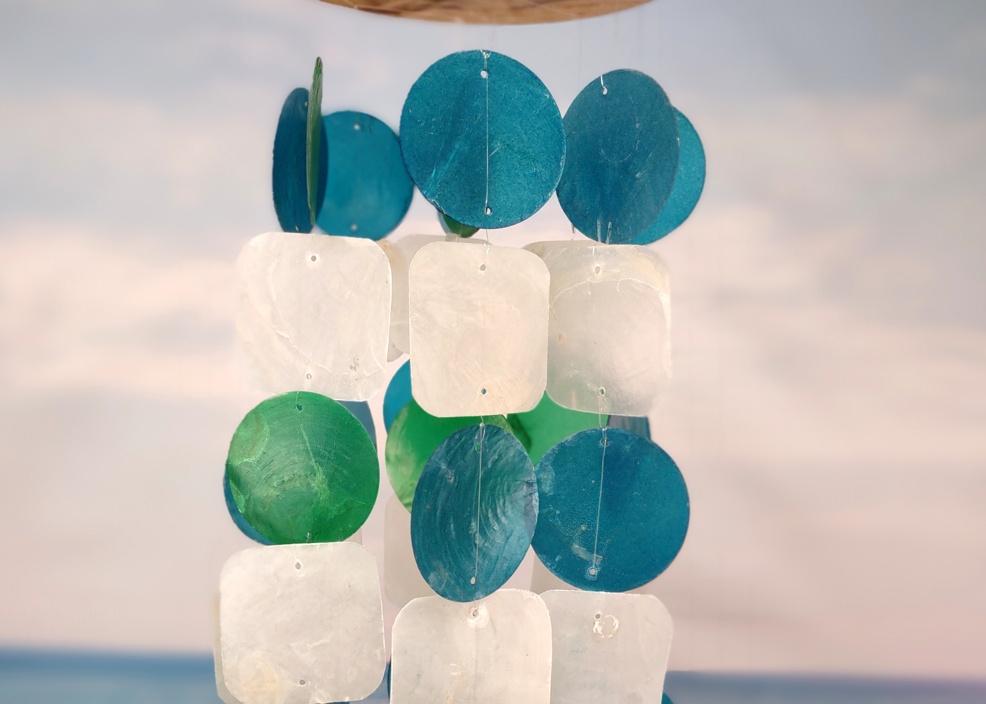 Bring a sense of tranquility, natural charm, and understated luxury to your interior decor with this ocean colored capiz shell windchime mobile—an ideal piece for a serene, coastal-inspired environment.