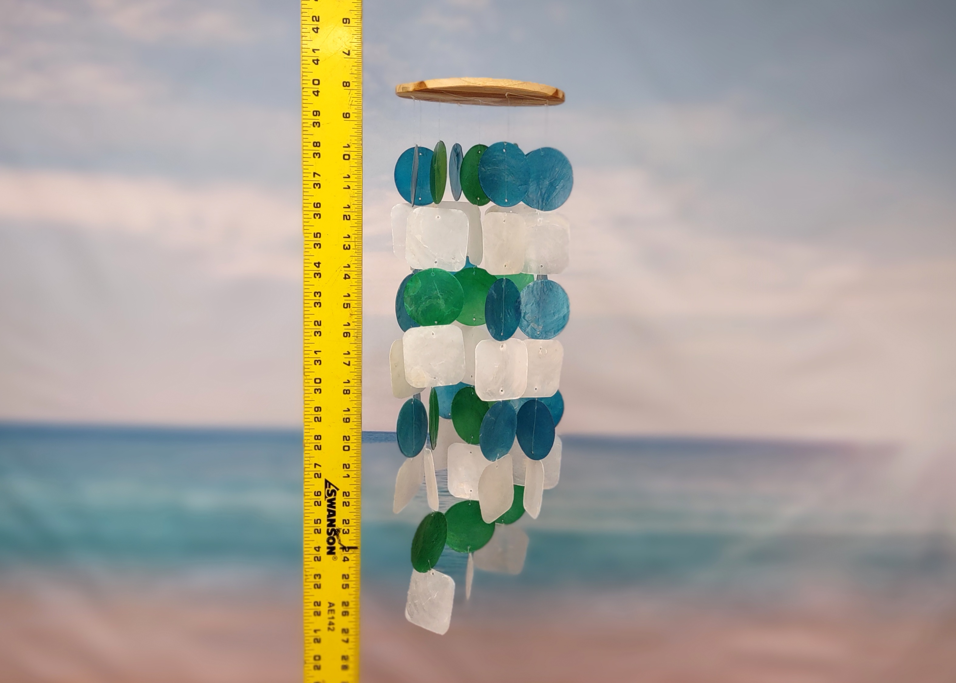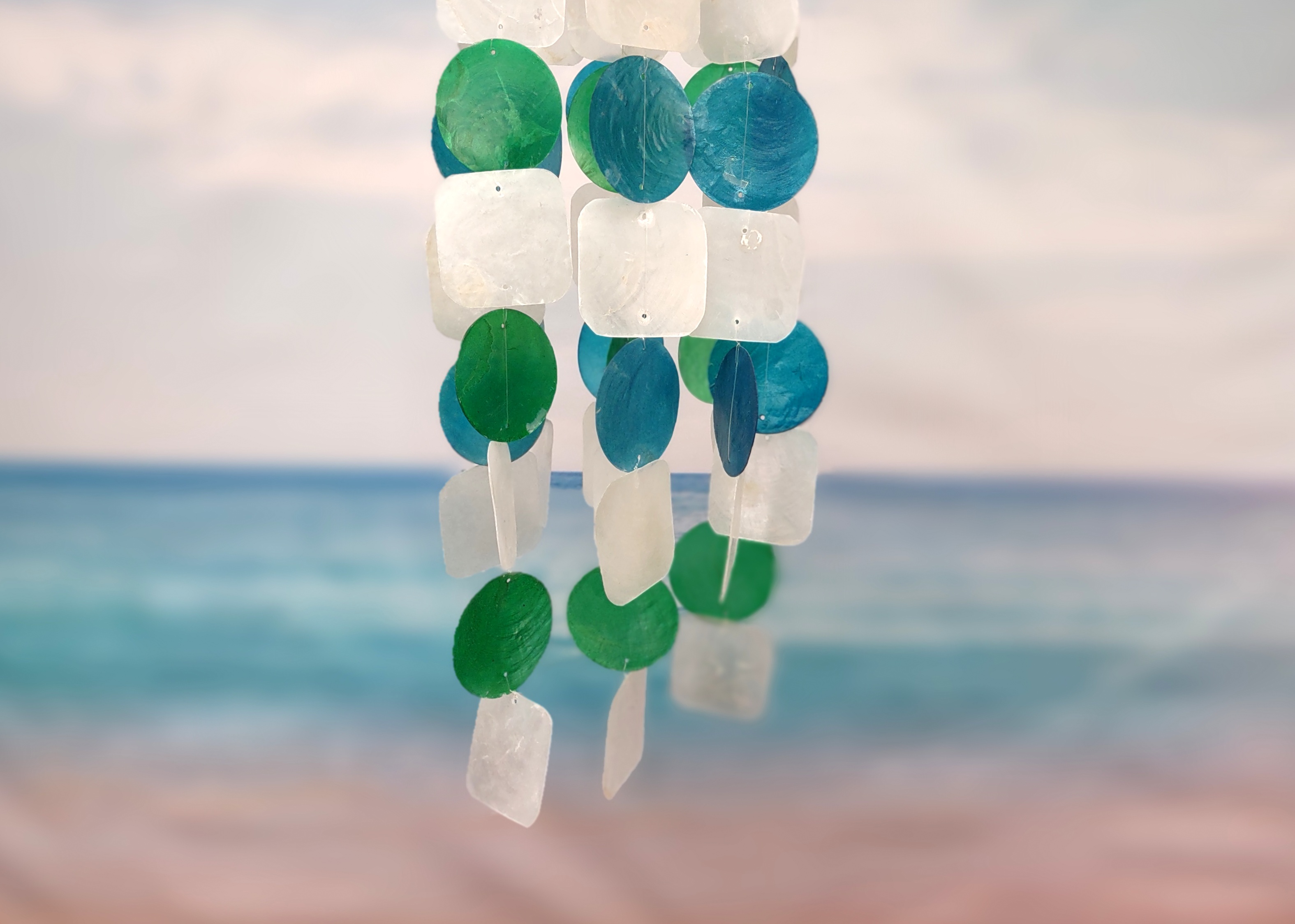 Elevate your coastal-inspired decor with our stunning multi-ocean colored capiz shell wind chime. This alluring windchime features delicately layered, shimmering aqua, green, and natural white capiz shells that catch the light beautifully, creating a soft, inviting glow. Each shell is meticulously crafted to showcase the organic, translucent beauty of nature, adding a touch of coastal elegance and breezy sophistication to any space. Its lightweight yet durable design creates a relaxed, beachy ambiance in your home, whether hung in living rooms, bedrooms, or sunlit patios.