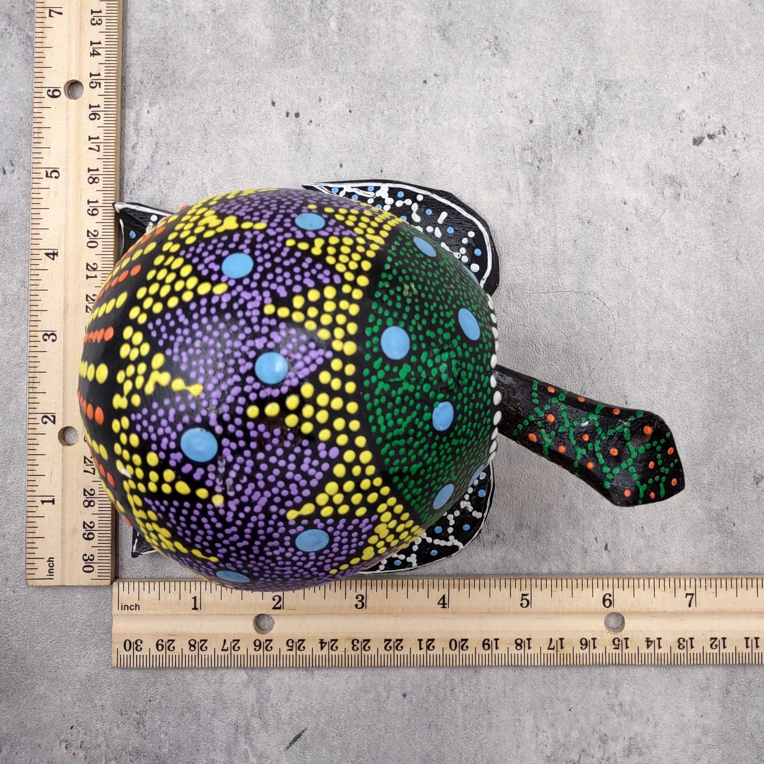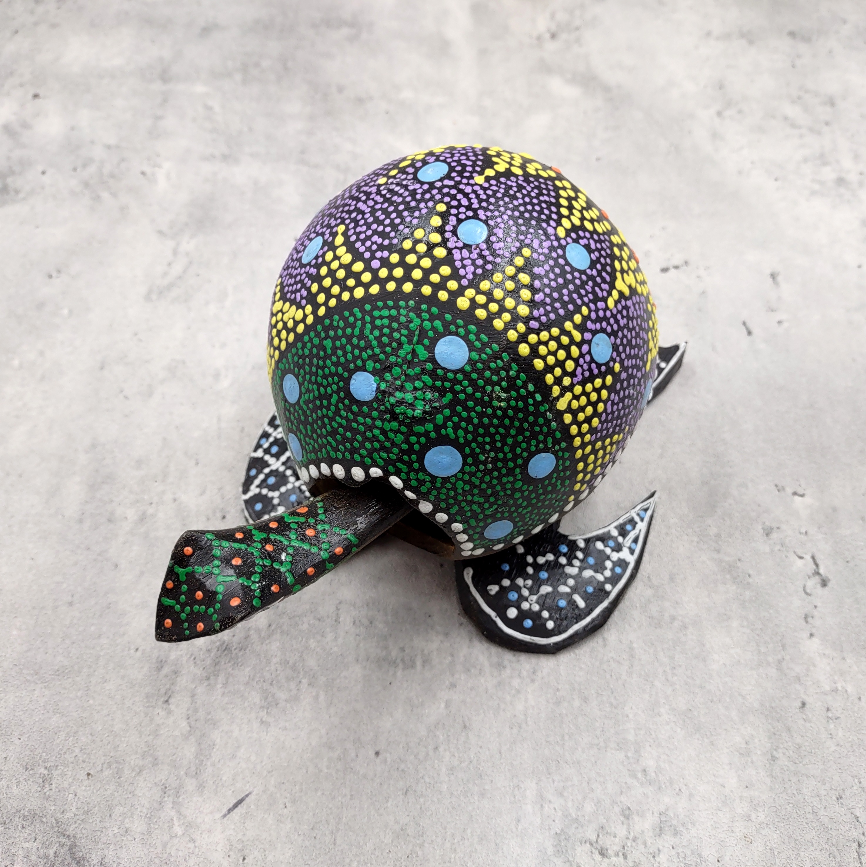 Inspired by sea turtles, this striking sculpture features a hand-painted tribal motif using a traditional dot art technique of purple, yellow, green, light blue, and white that adds a bold and artistic flair. The turtle has a whimsical bobbling head that enhances its playful and lively character. Whether displayed on a shelf, desk, or given as a gift, this eco-friendly figurine is sure to bring joy and a touch of the seaside into your home.