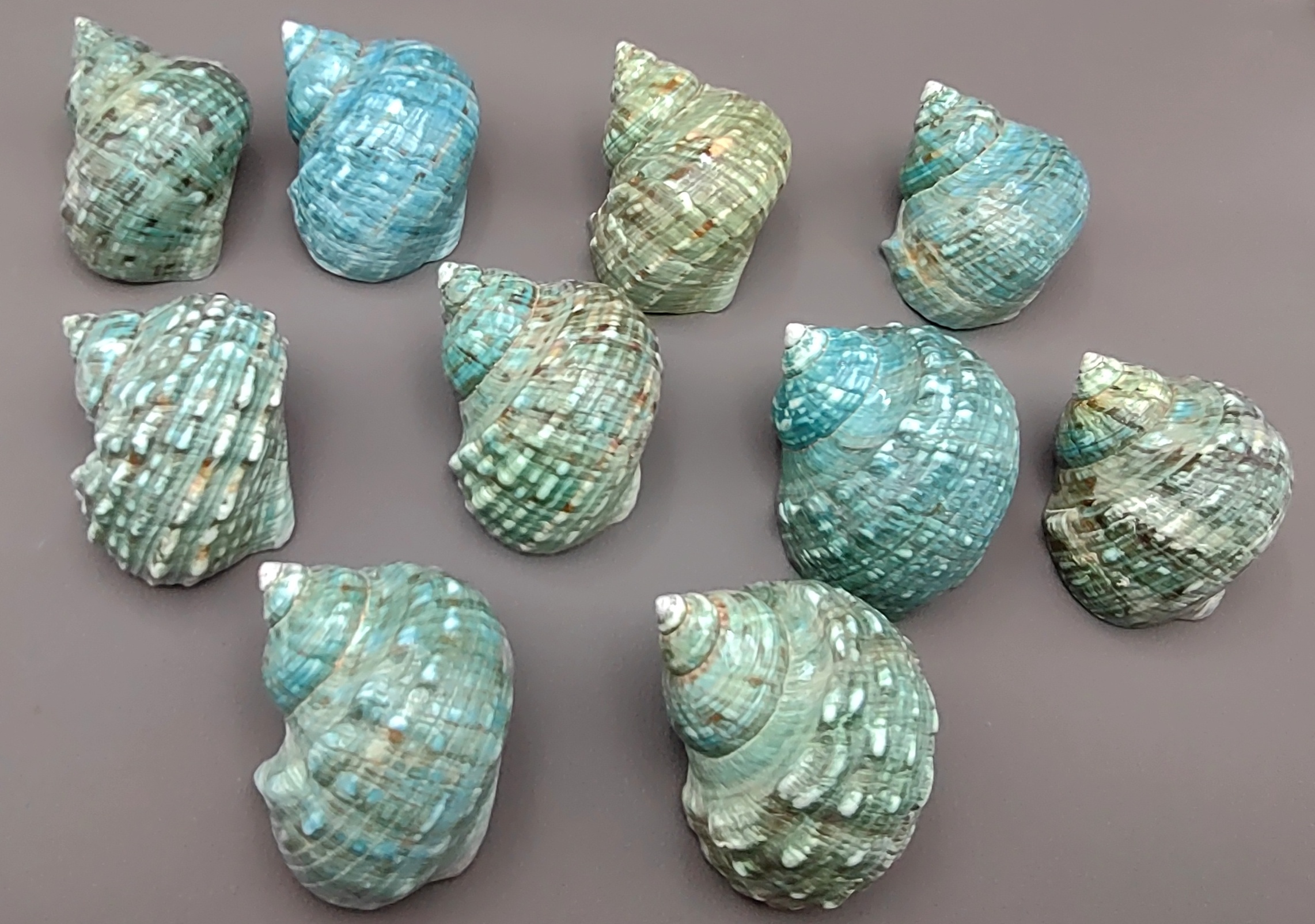 This beautiful specimen grade jade turbo shell's exterior can be a deep rich jade green or bright blue color. Shells can have smooth or knobby exteriors. The interior is commonly a creamy iridescent white.
