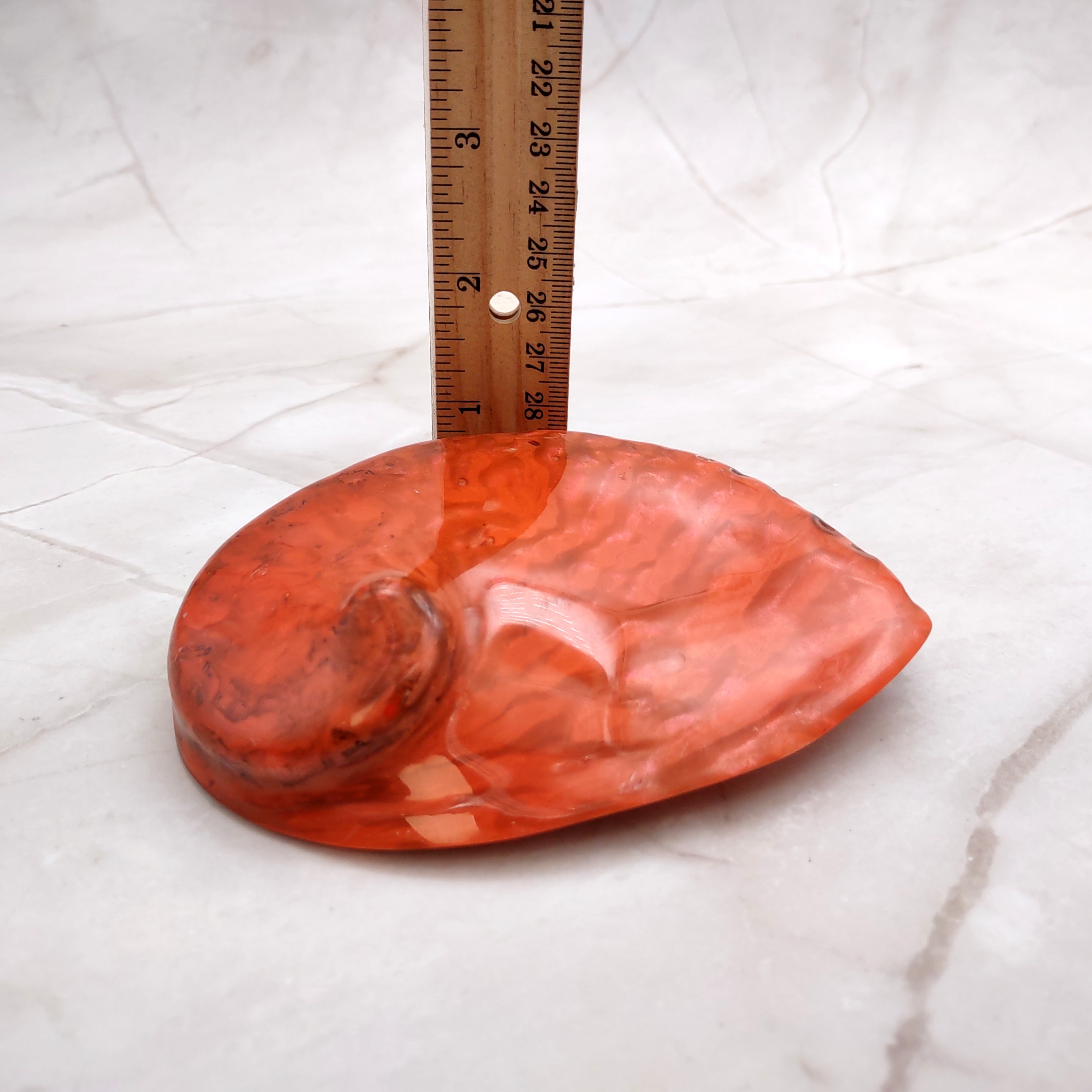 These shells are found on the shores of South Africa and are polished to reveal the beautiful design within the shell. These are dyed orange to reveal additional characteristics of the shell not normally seen.