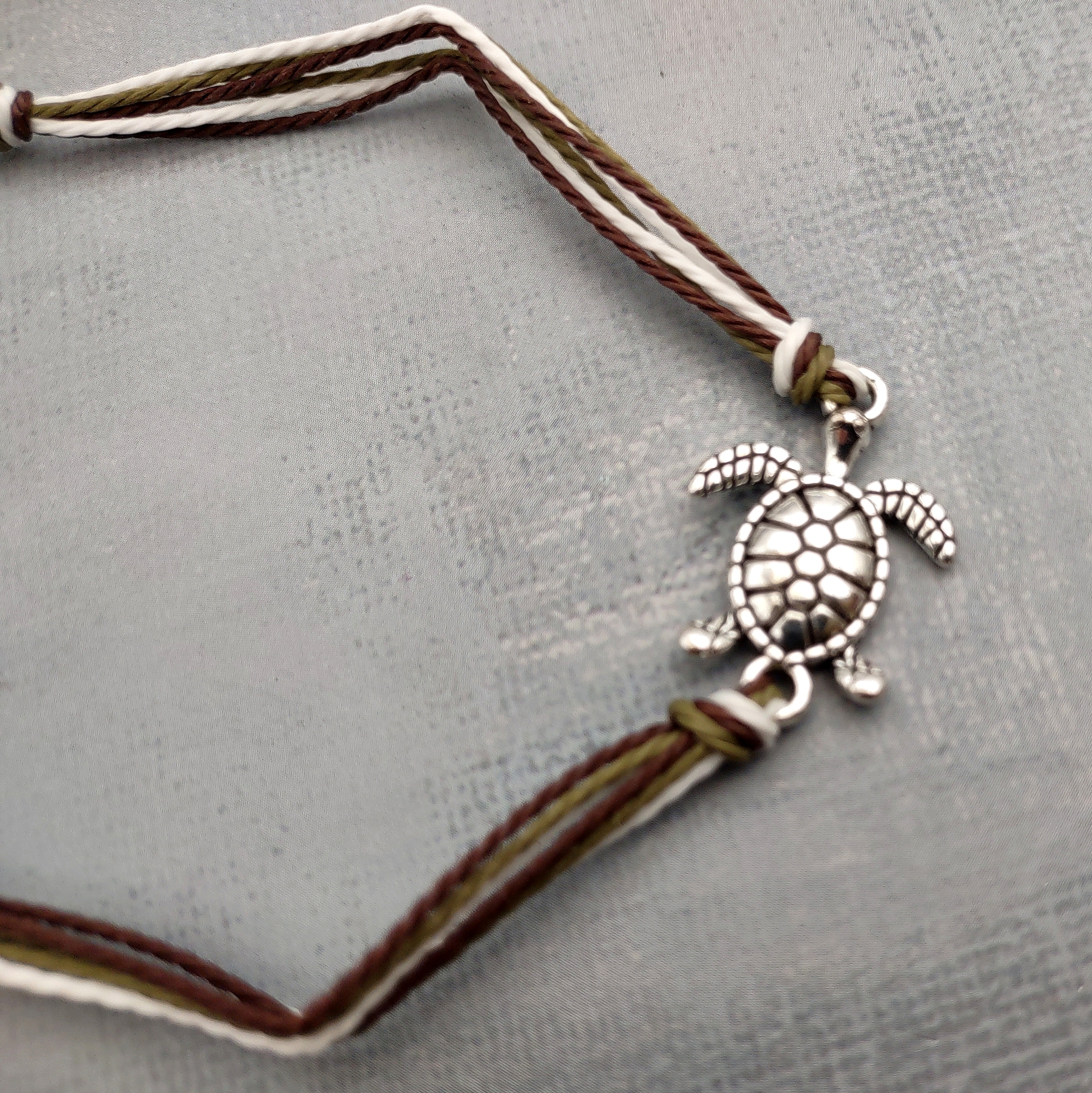 Discover our Sea Turtle Charm Bracelet, a beautifully crafted piece inspired by the ocean. Made with durable waxed cord in natural green, brown, and white tones, this adjustable jewelry can be worn as a bracelet or anklet. It features a charming sea turtle charm that symbolizes nature, longevity, and good luck. It's perfect for everyday wear or as a thoughtful gift for ocean lovers and sea turtle enthusiasts.