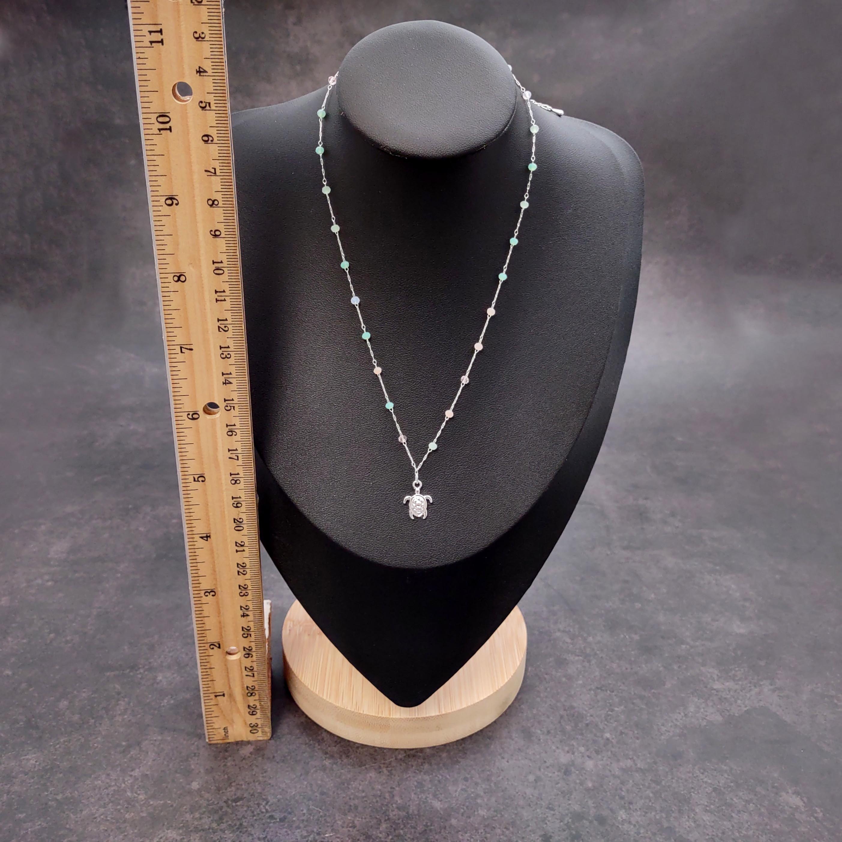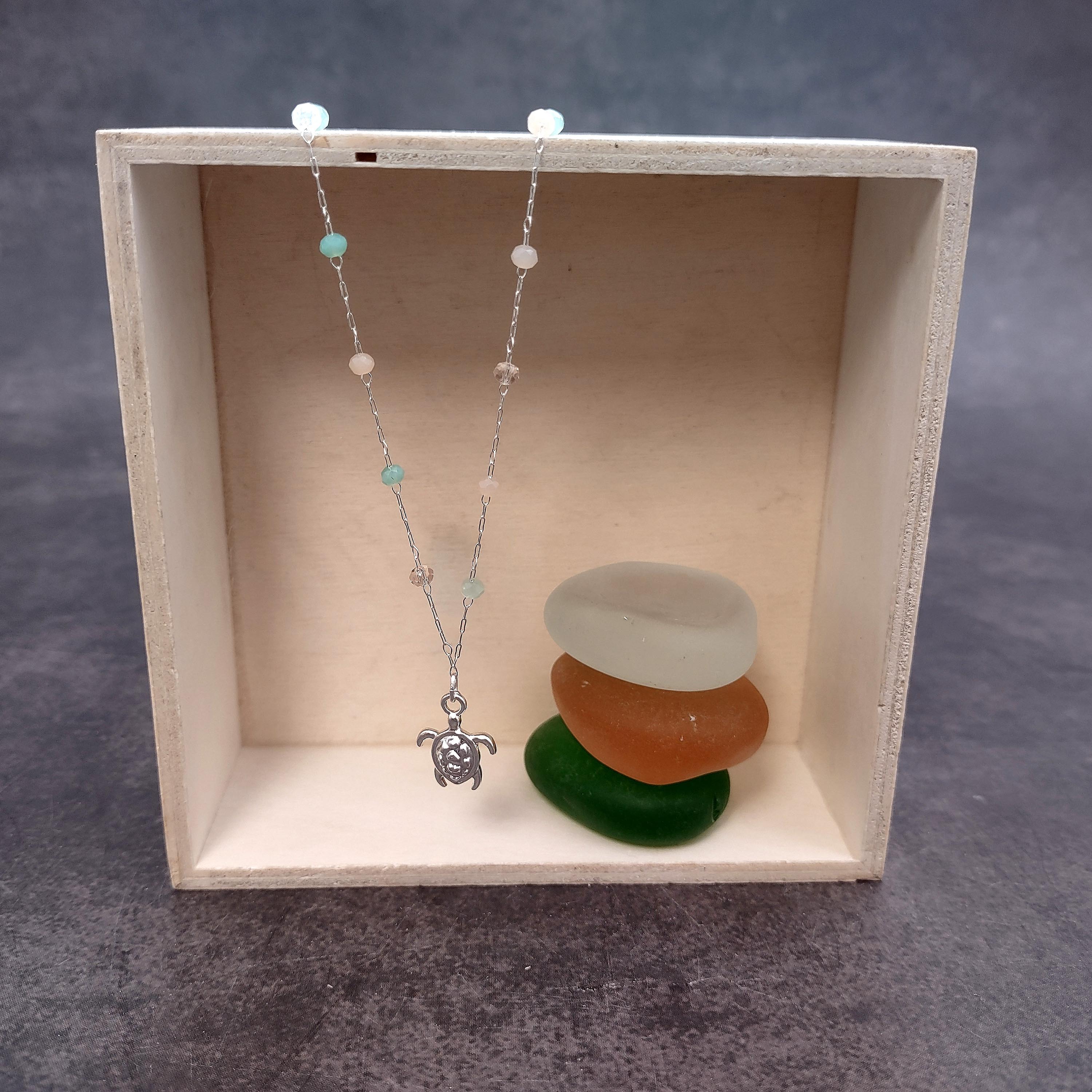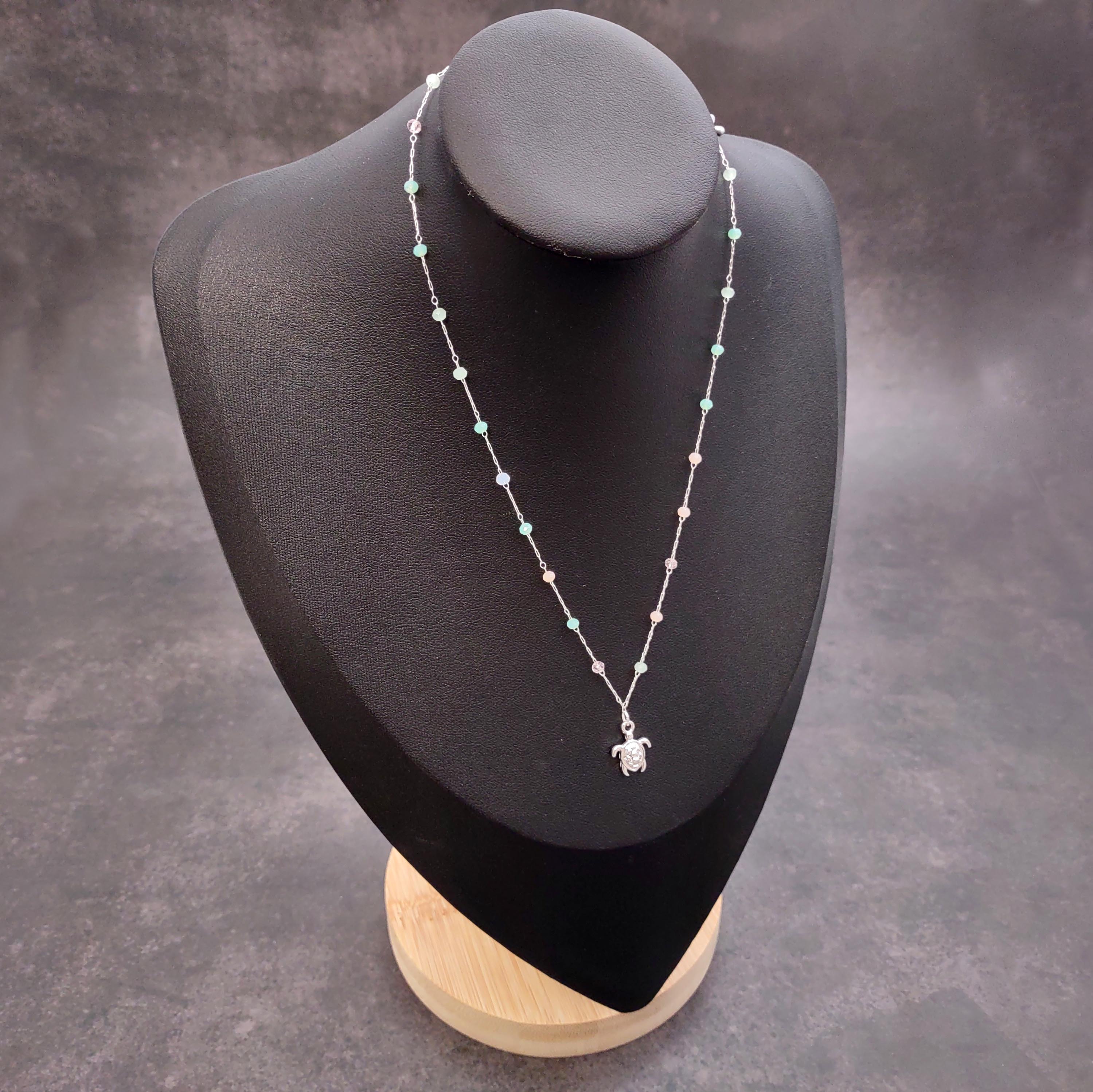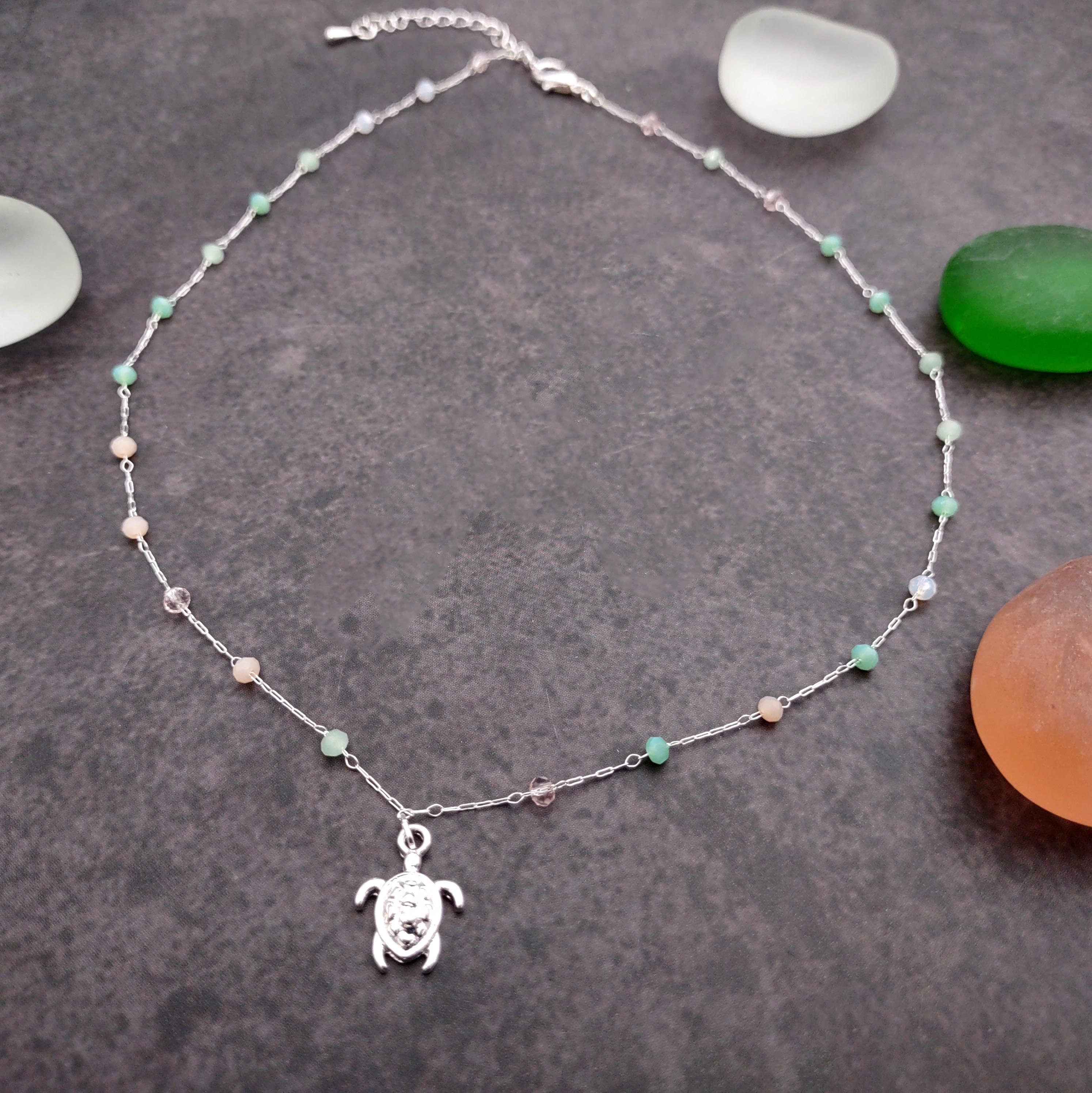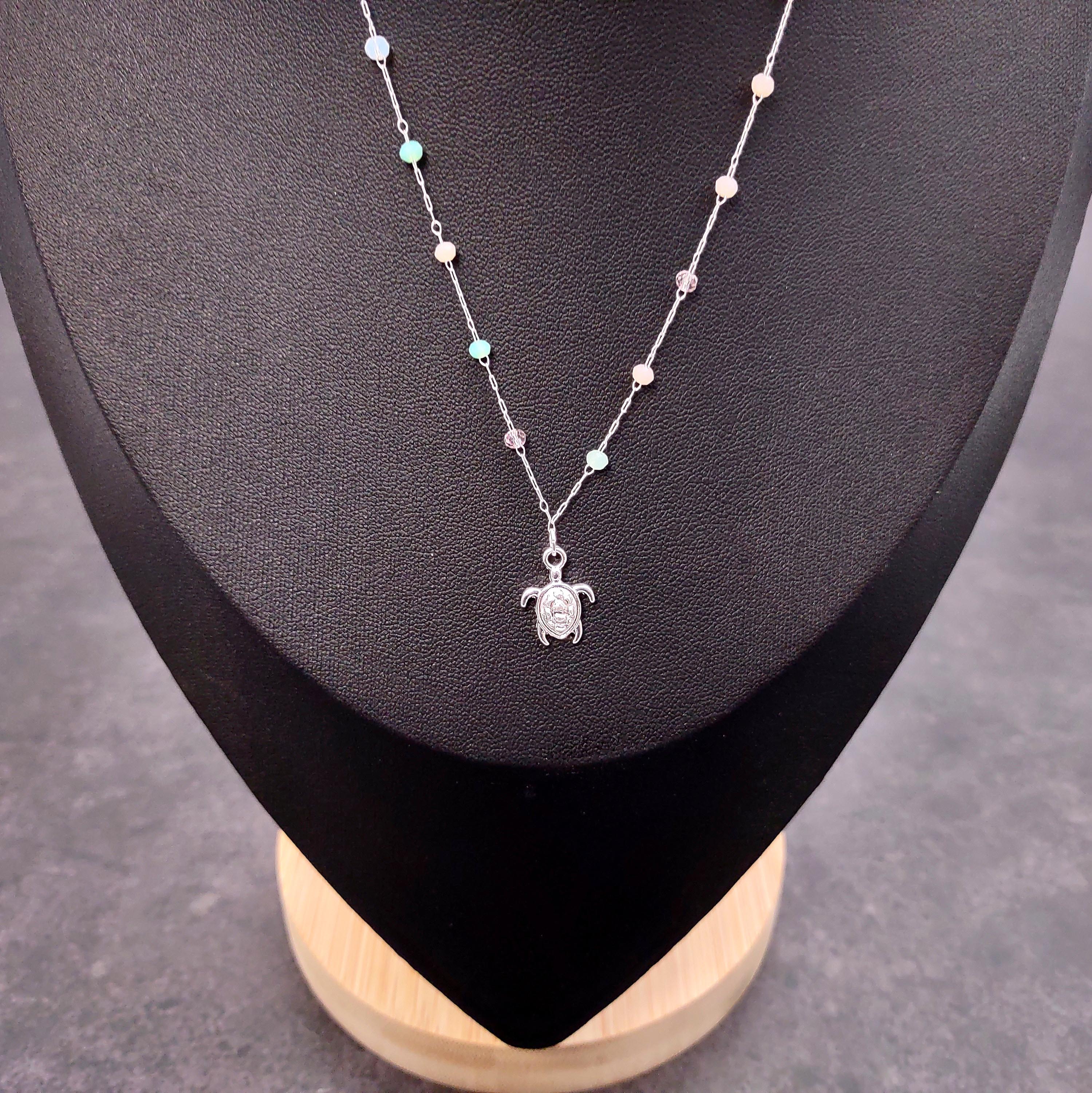 Sea Turtle Charm Necklace Delicate Green Peach White Beads (approx. 14+ inches AROUND) Silver Sea Turtle Necklace great for gifting! - 1 necklace per order - CIRCUMFERENCE is approx 14+ inches (adjustable) - Chain and Pendant is silver tone, NOT real silver or silver plated.Add a coastal touch to your everyday style with this Sea Turtle Charm Necklace, featuring evenly spaced peach, green, and white beads for a light and balanced look. The sea turtle charm at the center represents peace, guidance, and a love for the ocean. Lightweight and comfortable, it pairs easily with casual outfits, vacation wear, or your daily jewelry favorites.Wear it on its own for a simple, relaxed look or layer it with other necklaces for a beachy, stacked style. Ideal for anyone who enjoys ocean-inspired accessories and soft coastal colors. It also makes a thoughtful gift for birthdays, beach trips, or just because.---Our shells, coral, starfish, urchins and ocean finds are natural, unique and one of a kind and will have minor wear and variances from nature.Our listing photos show examples of the type of shell, coral, starfish or other nautical item you will receive, not an exact match.Please be aware that colors may vary from shell to shell and monitor to monitor. At this time we do not offer international shipping on our shells, coral and nautical décor.This item is Not Returnable, Please review our return policy for details.Looking for a larger quantity or to buy in bulk? Please send us an email or message!~~~Seashell Supply & Emporium provides a wide variety of seashells, corals, beach glass and more.Our customers include collectors, teachers, crafters, designers, and event planners. Seashell Supply & Emporium sources popular, beautiful, and unique natural treasures from around the world legally through our many United States based suppliers. We deliver exceptional service, straightforward communication, careful packing, and attention to detail.Weddings, craft projects, jewelry, art, inspired creations, and home décor are the destination of many of our Seashell & Coral supply products.Seashell Supply & Emporium's merchandise brings the joy and beauty of the ocean to our many new and returning online customers.Customers often search for: sea turtle necklace, sea turtle charm, everyday jewelry, green beads, peach beads, layering necklace, white beaded, dainty beach style, fashion jewelry, silver tone jewelry, beach lover gift, charm necklace, sea turtle gift