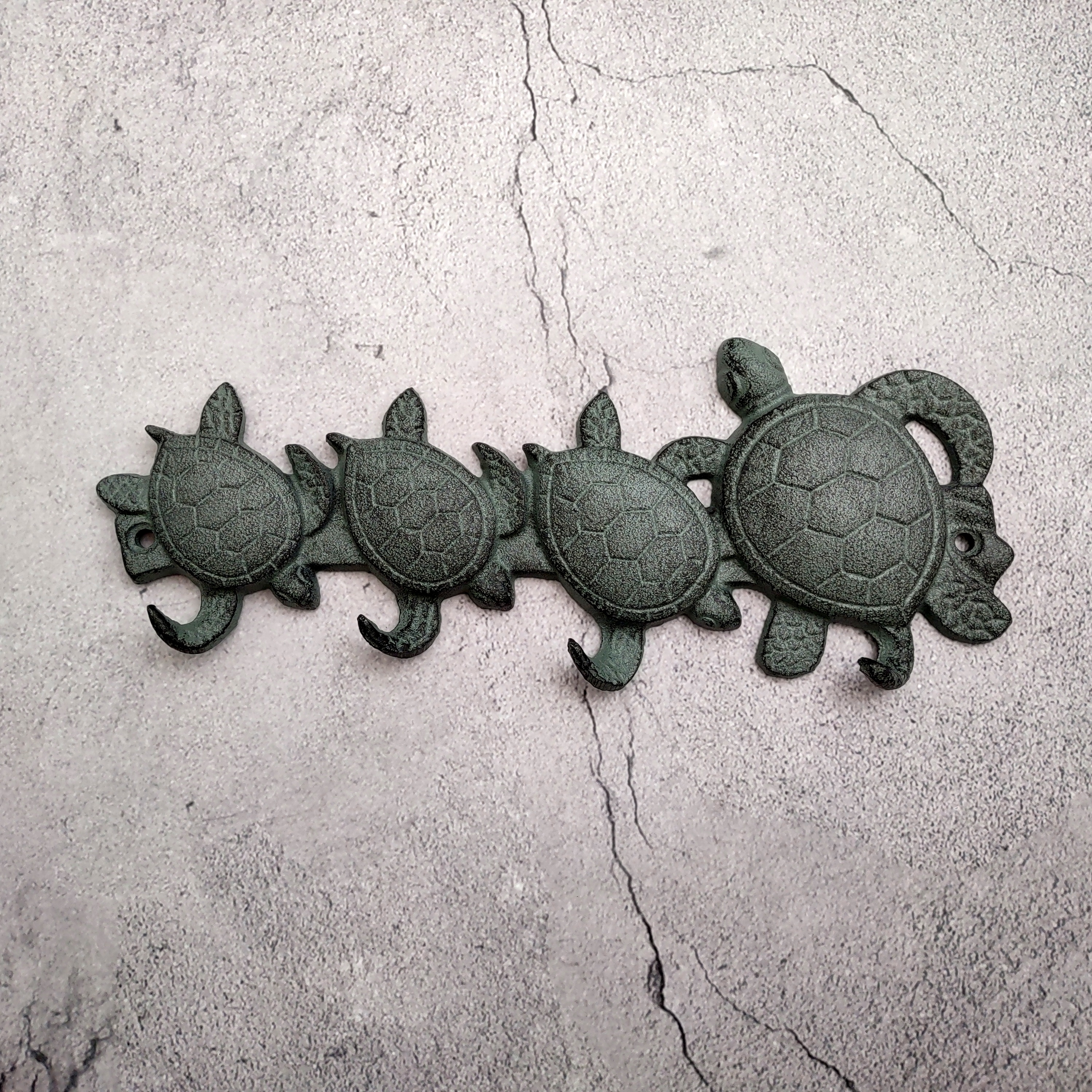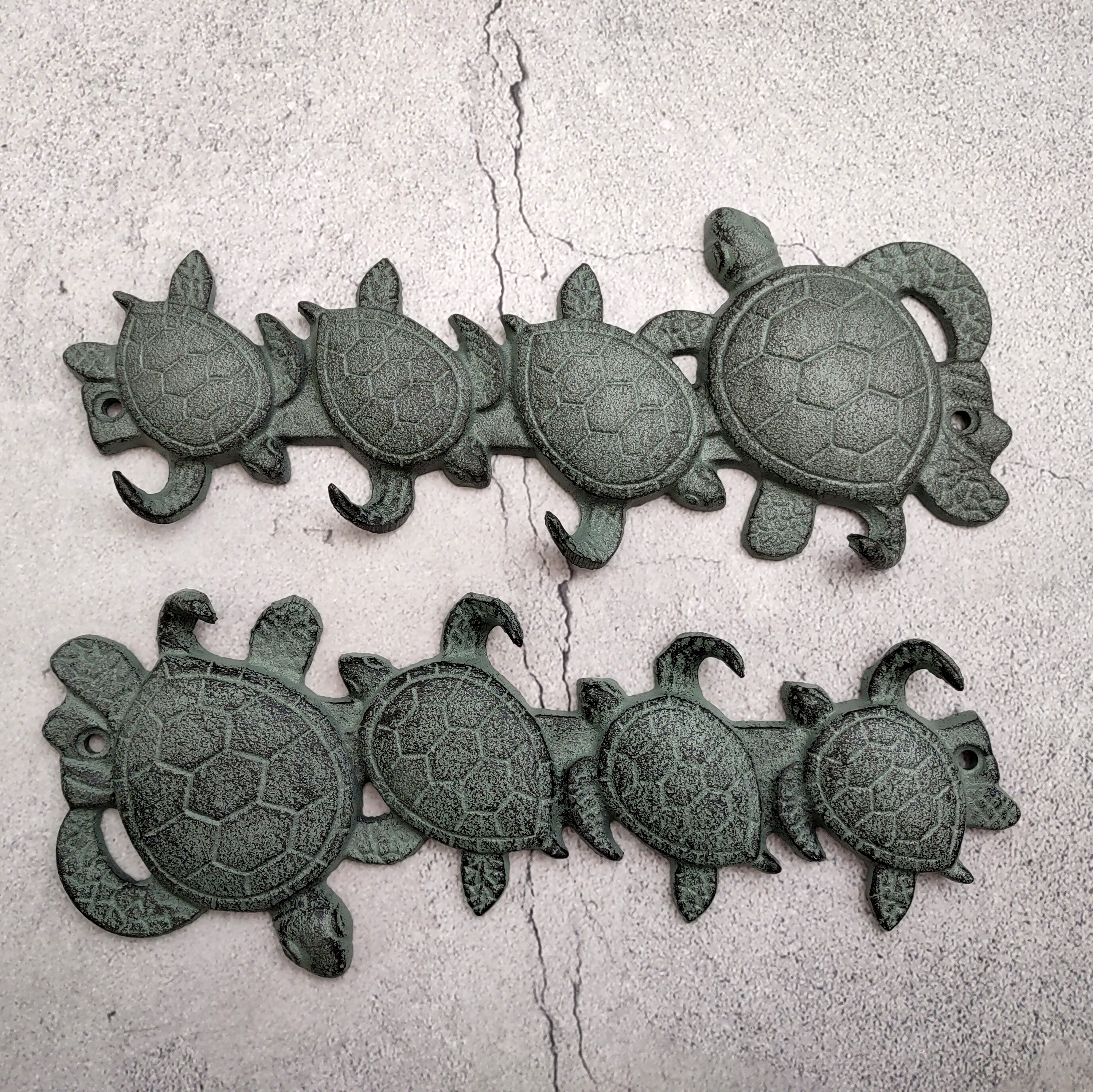 Add a charming coastal touch to your home with our Sea Turtle Family Cast Iron Hook featuring a antiqued green patina finish. This adorable nautical-style wall hook showcases a family of four sea turtles, ideal for enhancing any beach-themed decor. Made from durable, heavy-duty cast iron, this hook is suitable for hanging keys, coats, towels, or other accessories.