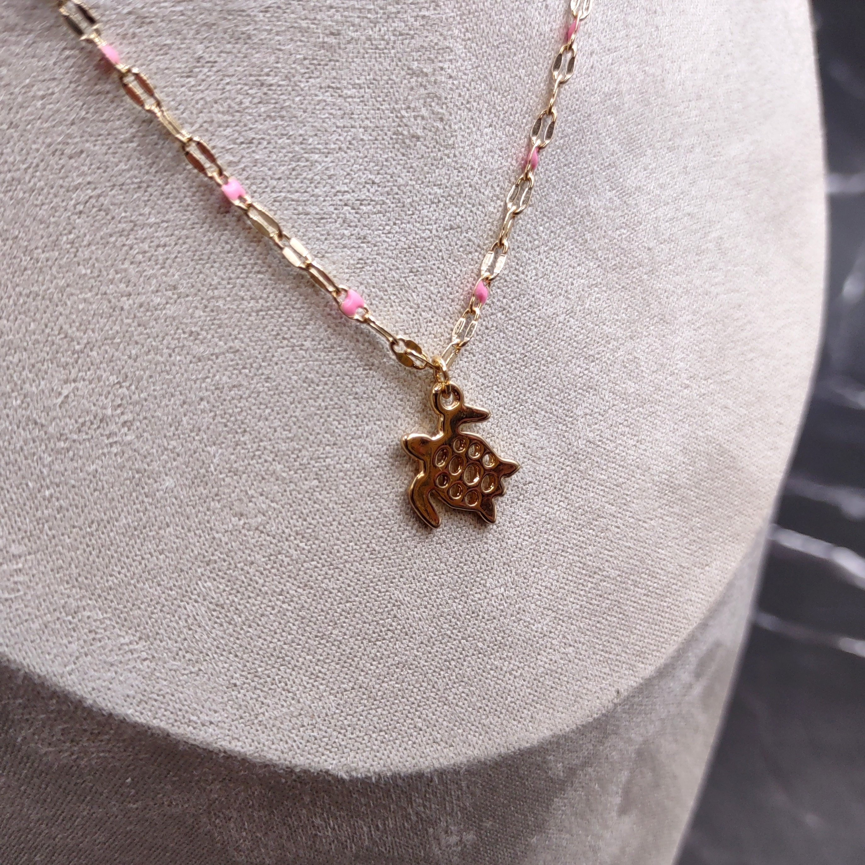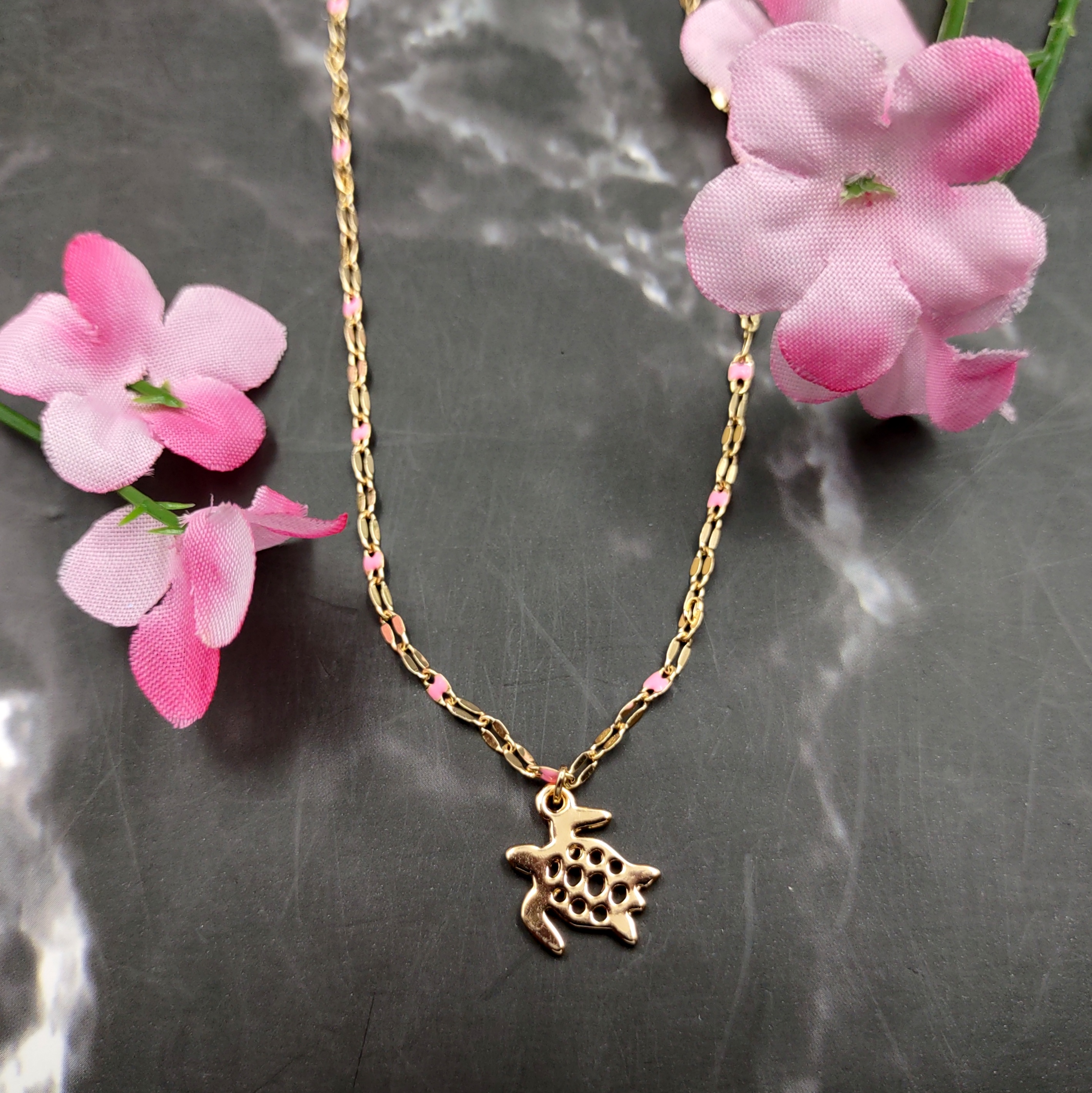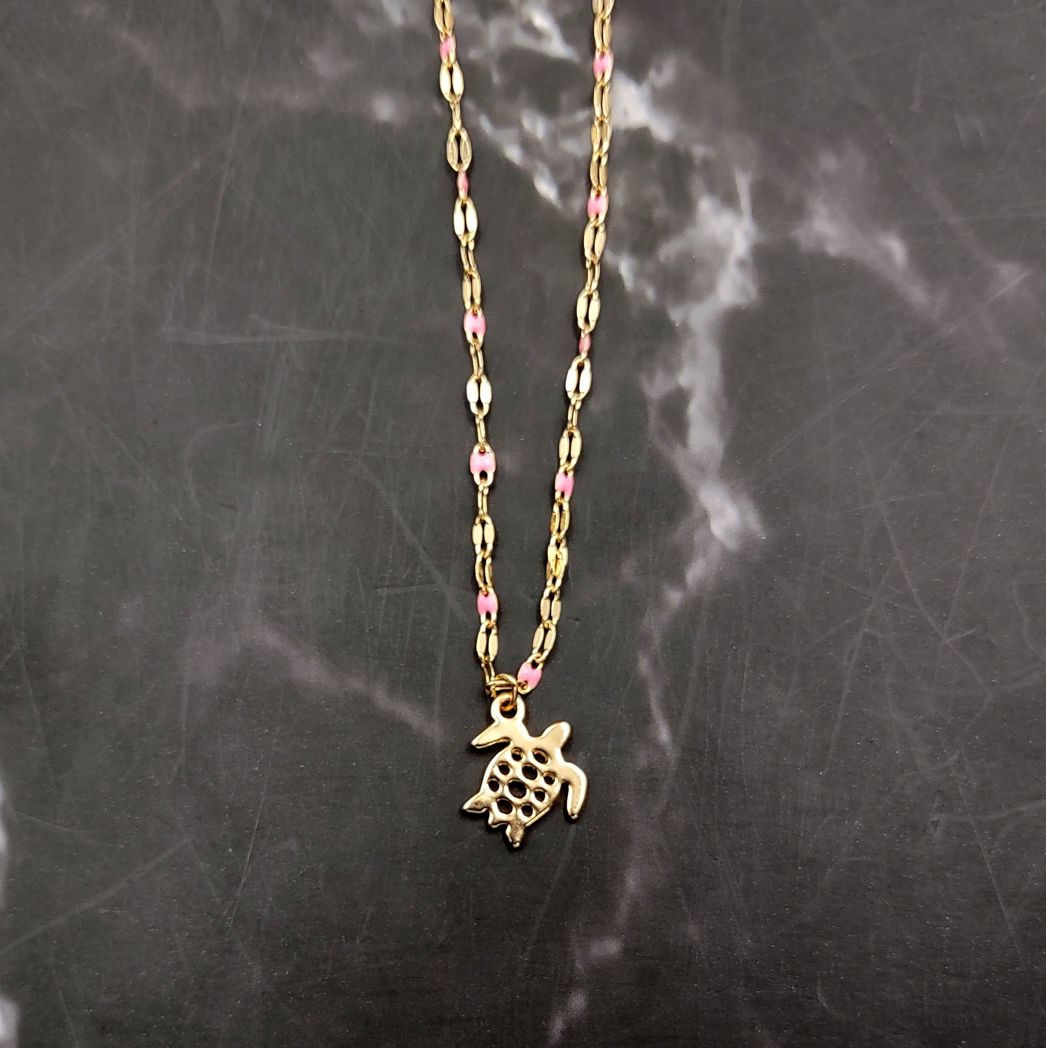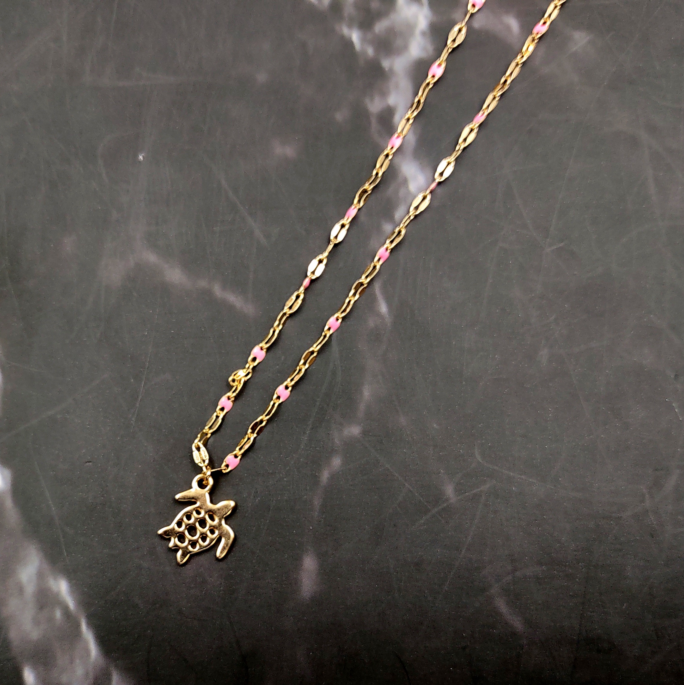 Customers often search for: gold turtle charm, sea turtle necklace, ocean jewelry, beach necklace, coastal jewelry, turtle pendant, pink accent chain, nautical jewelry, turtle gift, ocean charm, boho jewelry, sea turtle jewelry, fashion jewelry
