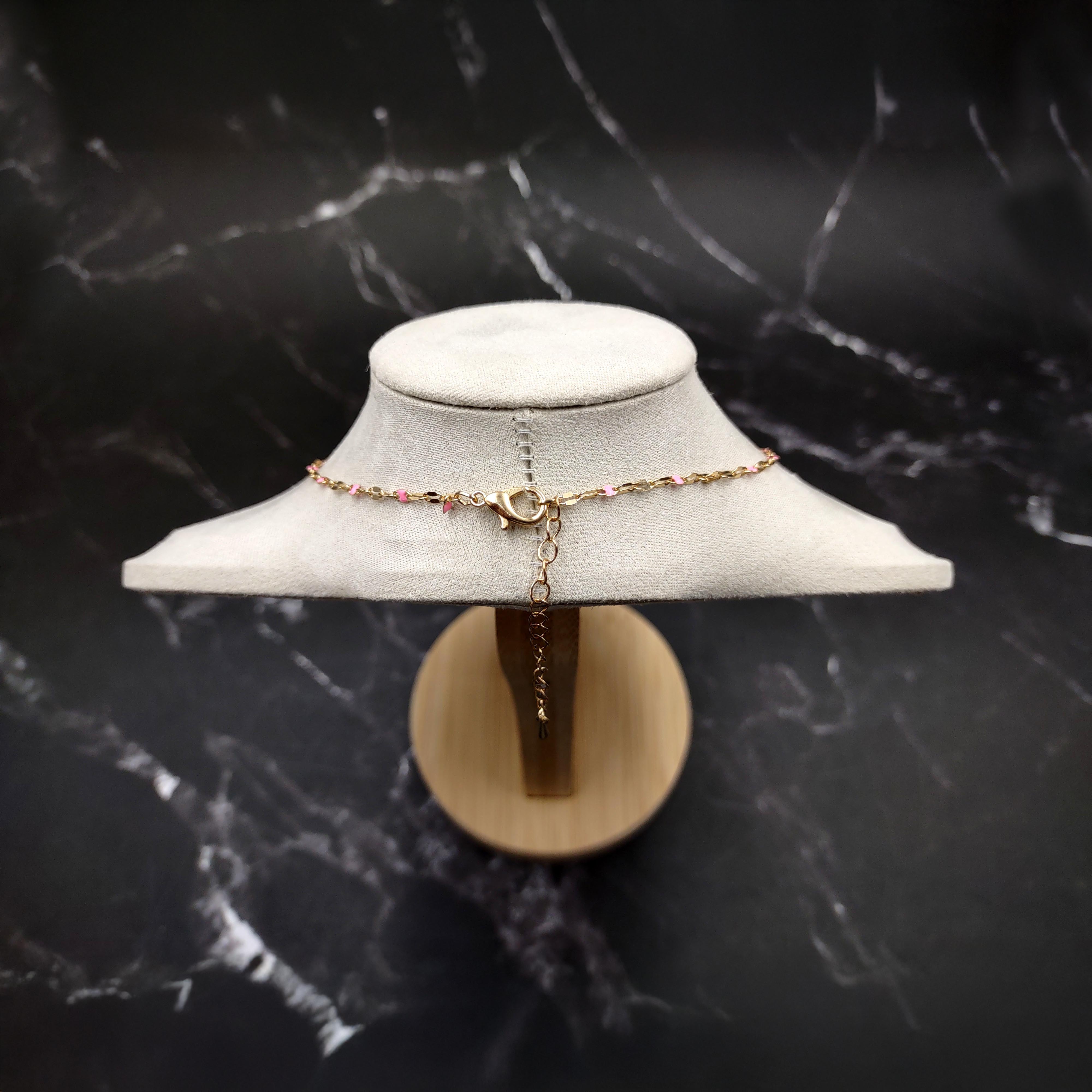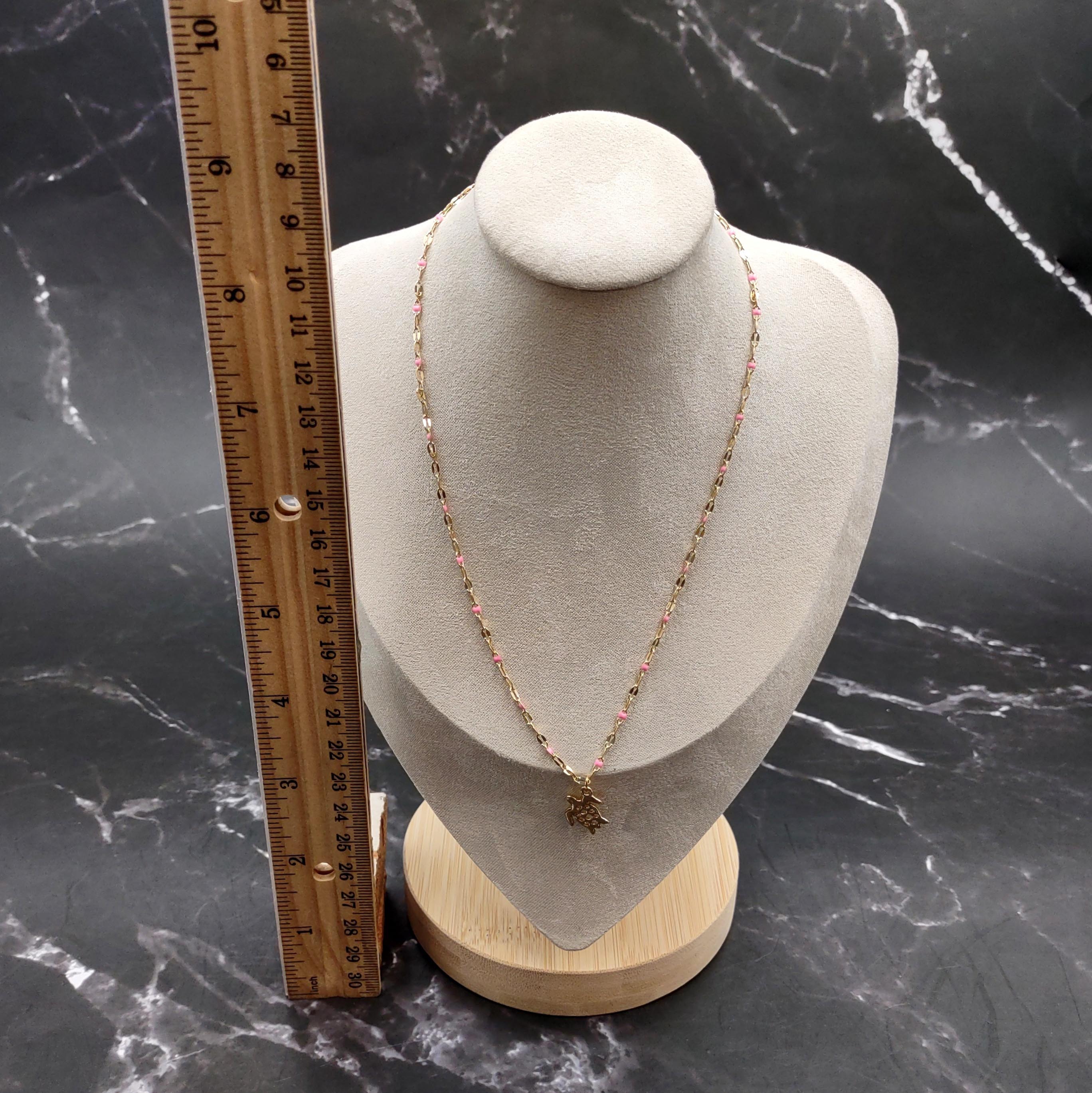 Designed for everyday wear, the lightweight 16+ inch chain sits comfortably around the neck, adding a subtle coastal shimmer to any outfit. The warm gold tone paired with the delicate pink accents creates a timeless, feminine look that feels both fresh and refined.