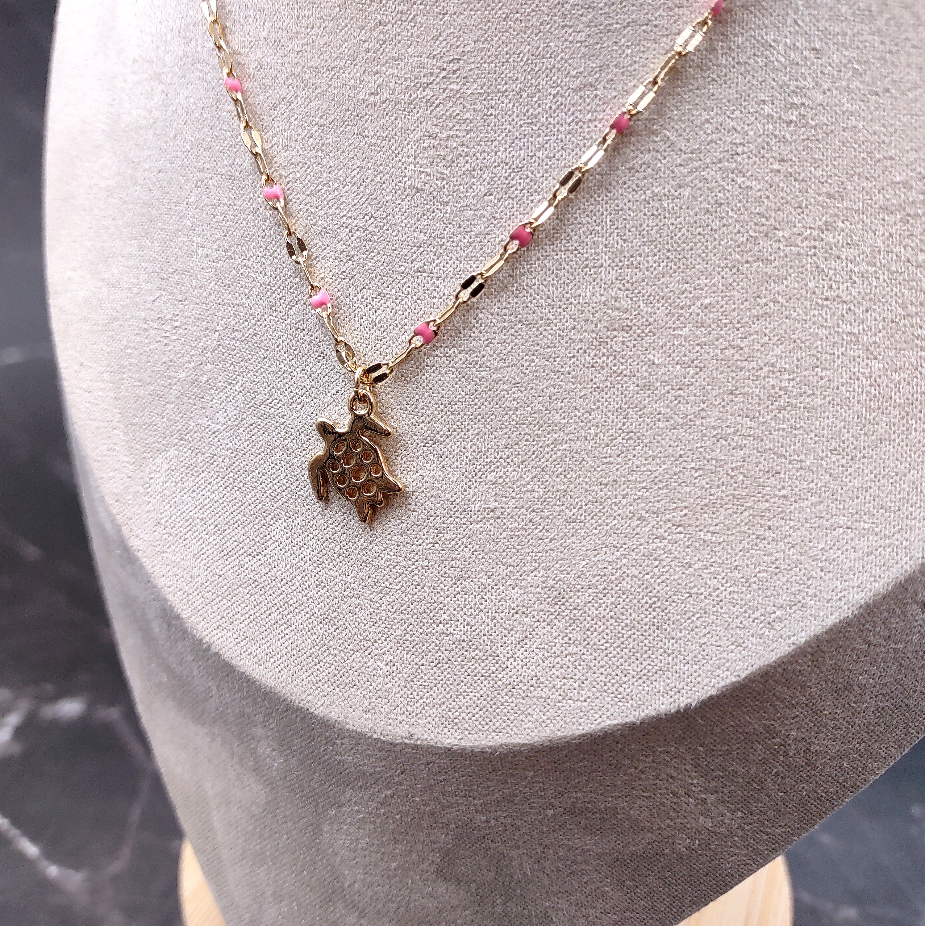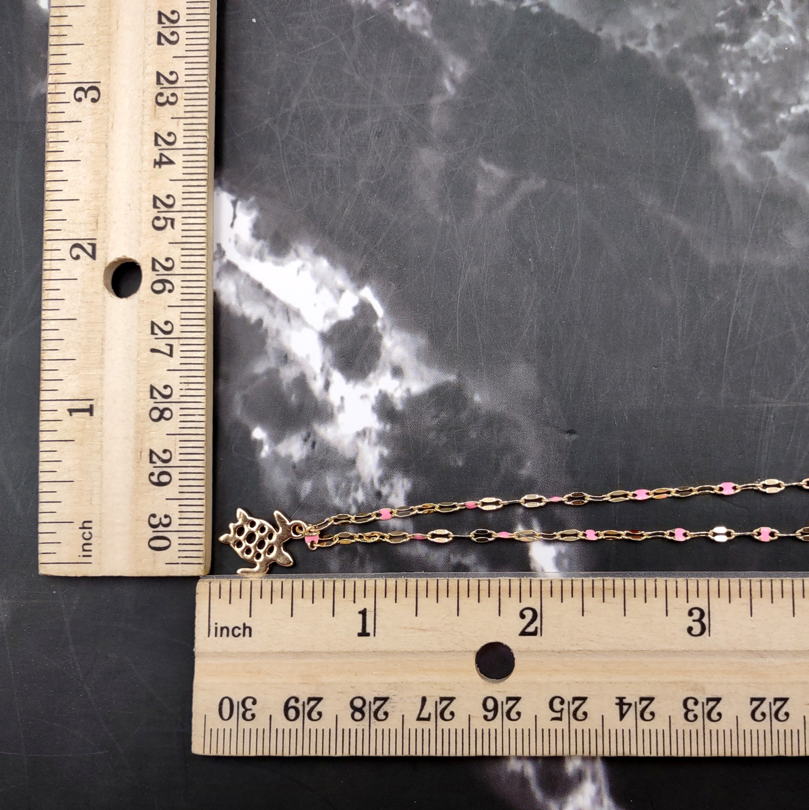 Bring a touch of ocean charm to your look with our Thin Gold Tone Sea Turtle Necklace. Handcrafted with a dainty gold tone chain accented by soft pink enamel links and a small sea turtle pendant, this piece beautifully captures the gentle spirit of the sea.
