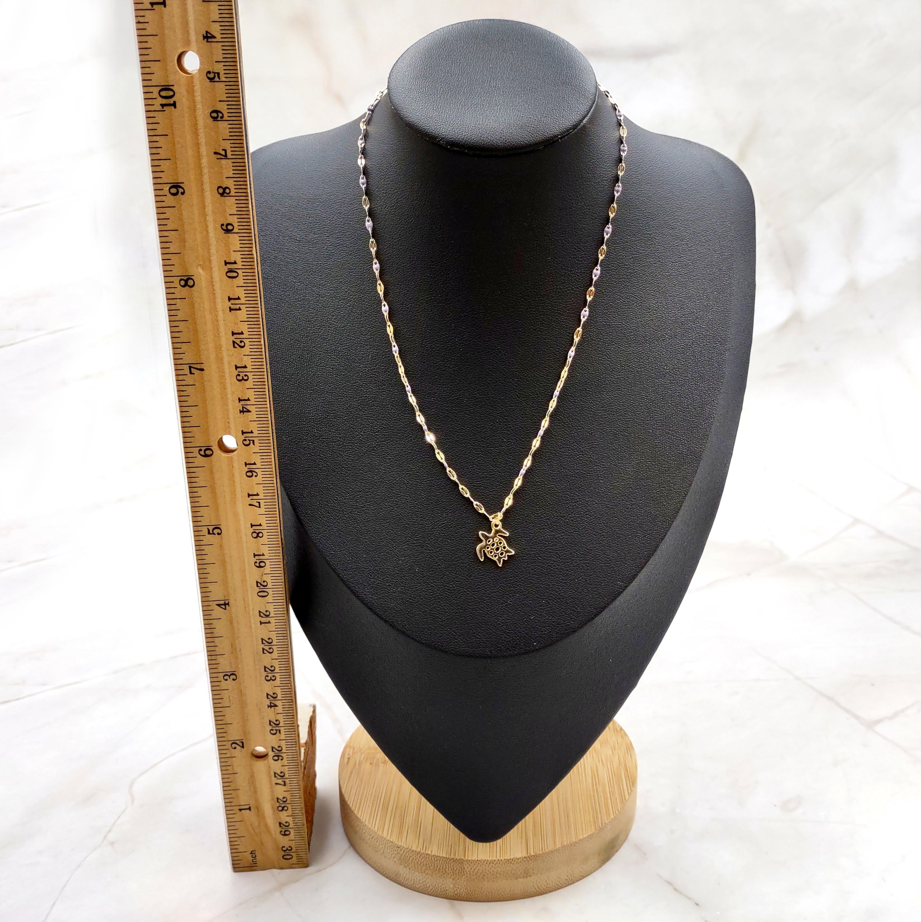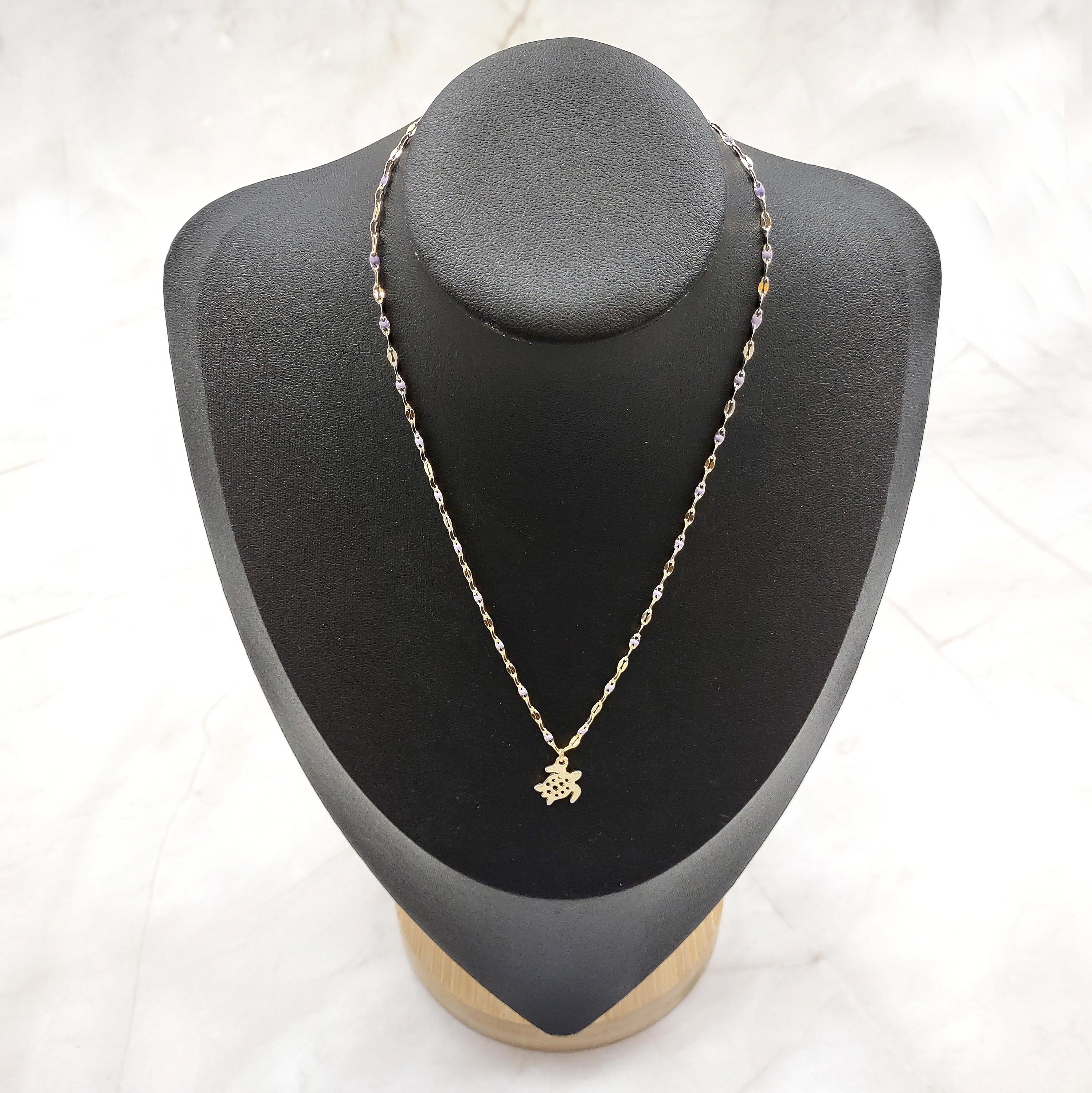 Add a touch of seaside charm with our Thin Gold Tone Sea Turtle Necklace. This elegant piece features a delicate gold tone chain accented with purple enamel links and a small sea turtle pendant, perfect for anyone who loves ocean-inspired jewelry.