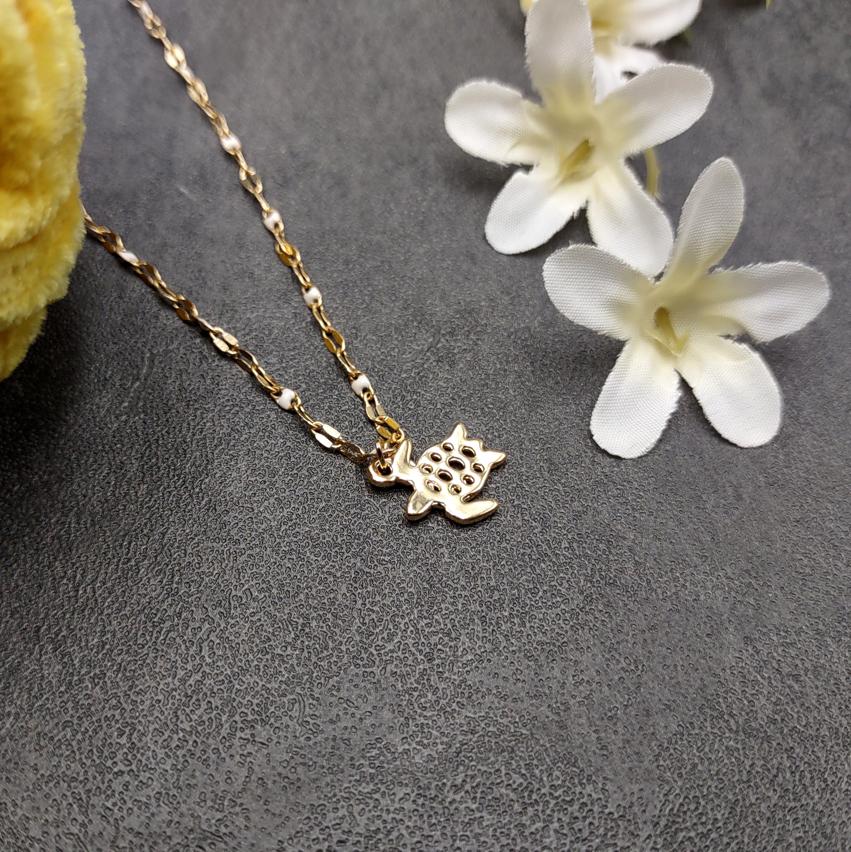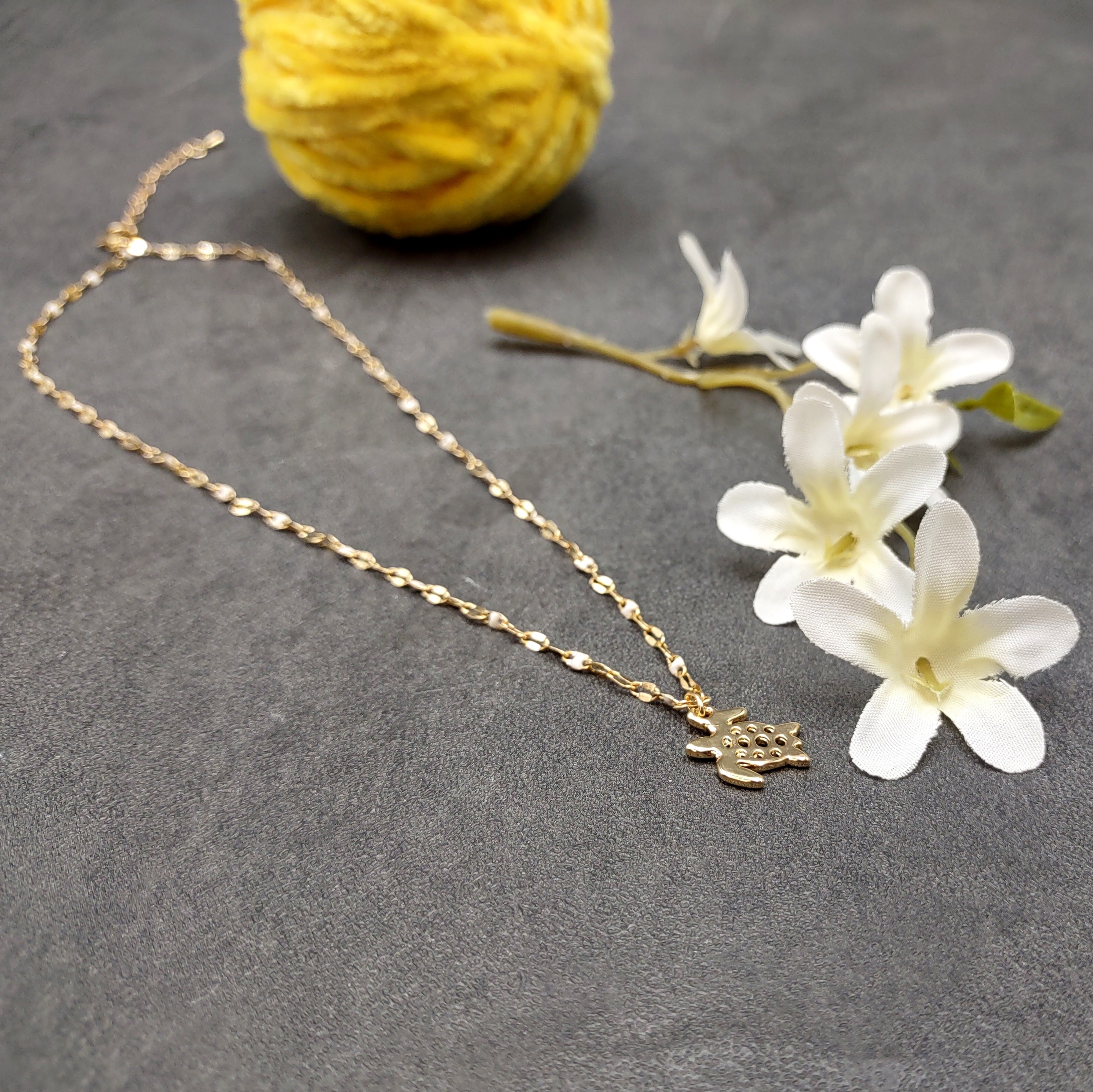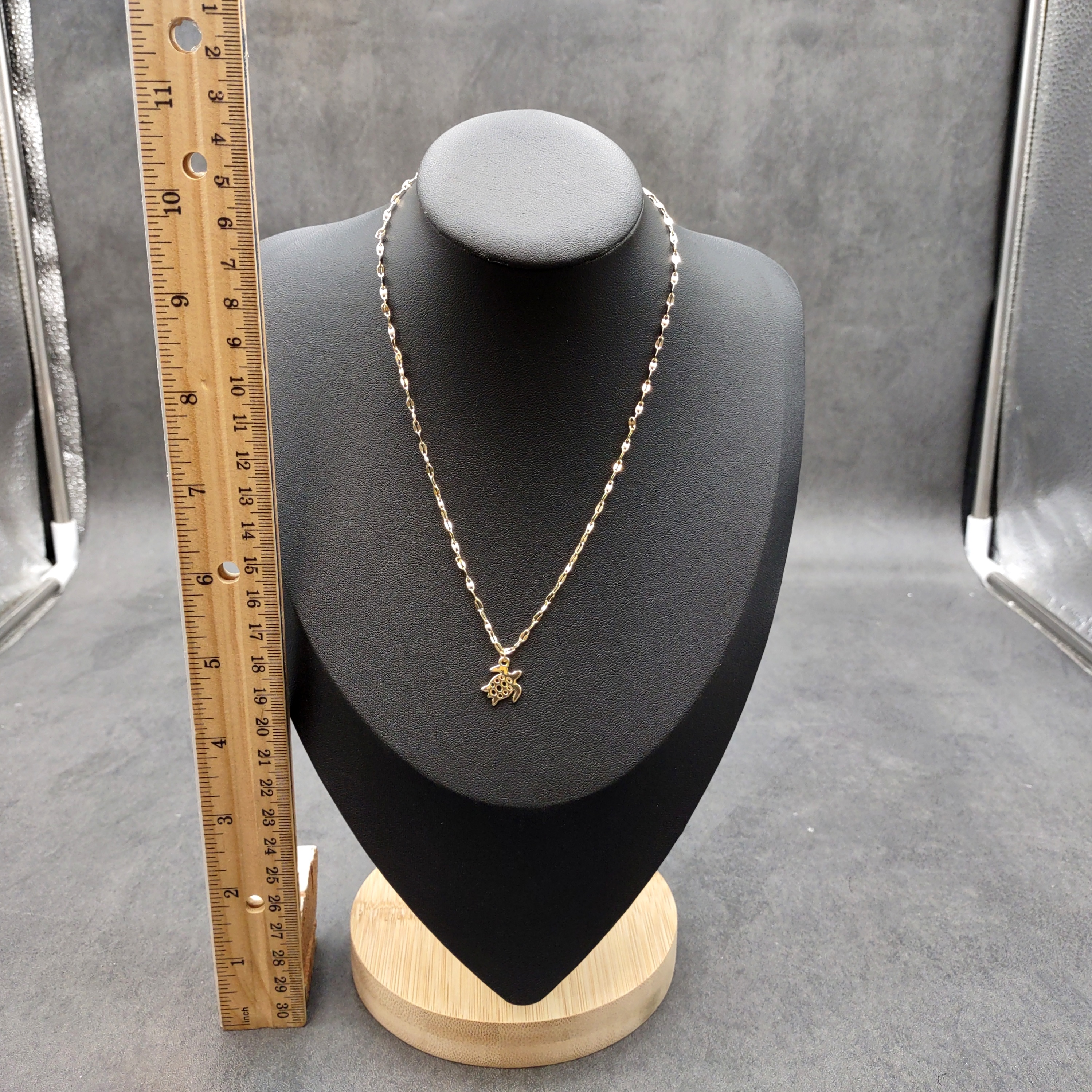 Add a touch of seaside charm with our Thin Gold Tone Sea Turtle Necklace. This elegant piece features a delicate gold tone chain accented with white enamel links and a small sea turtle pendant, perfect for anyone who loves ocean-inspired jewelry.