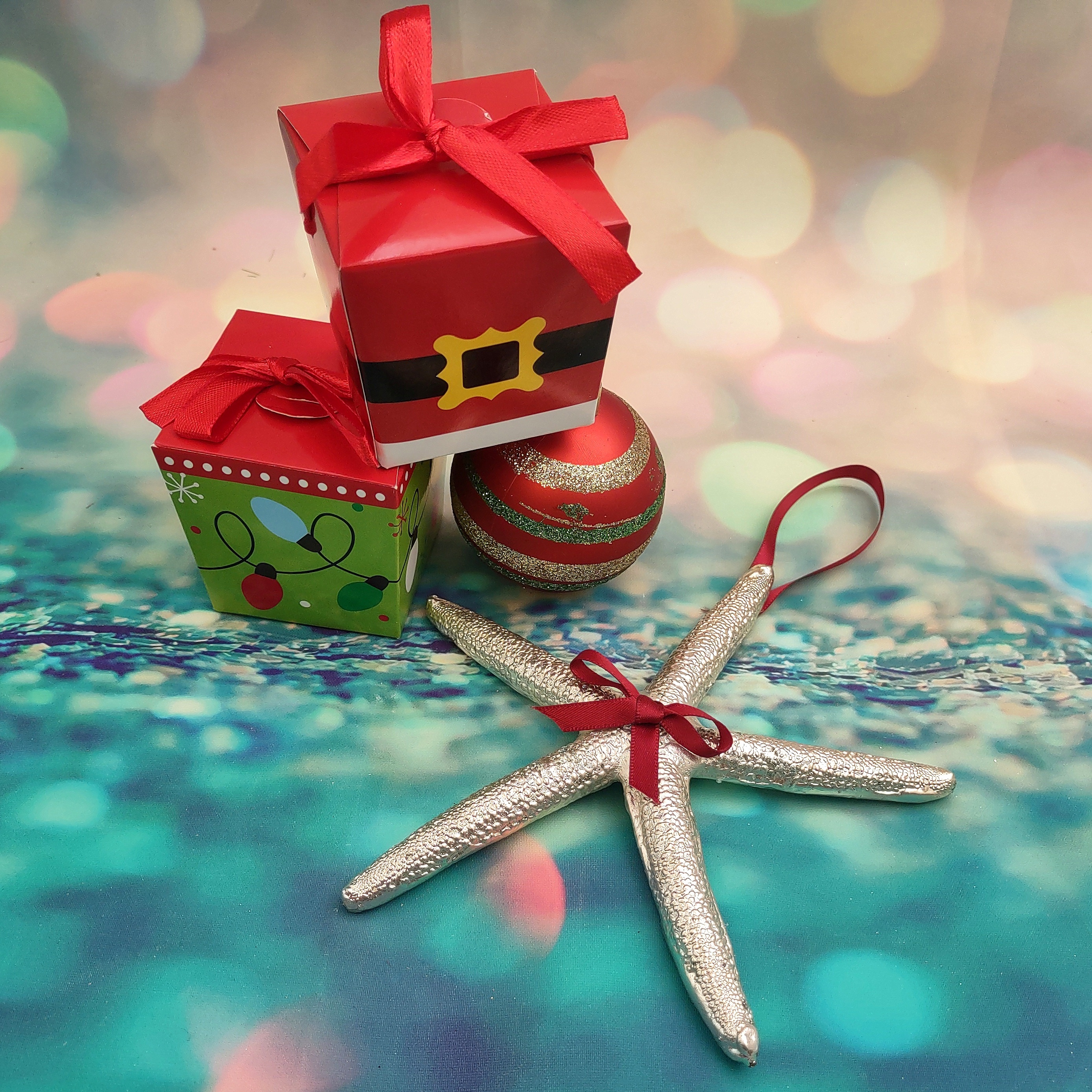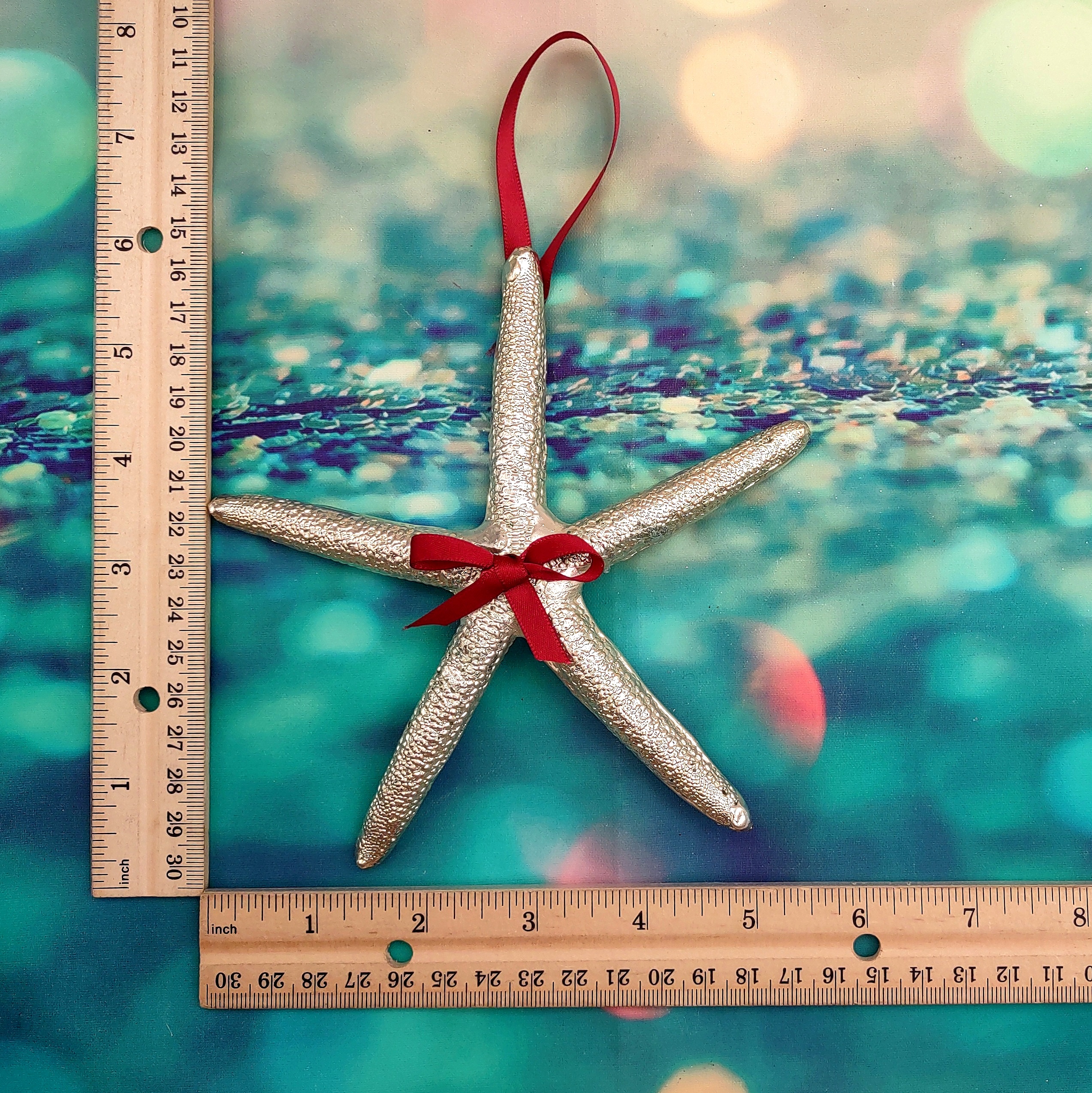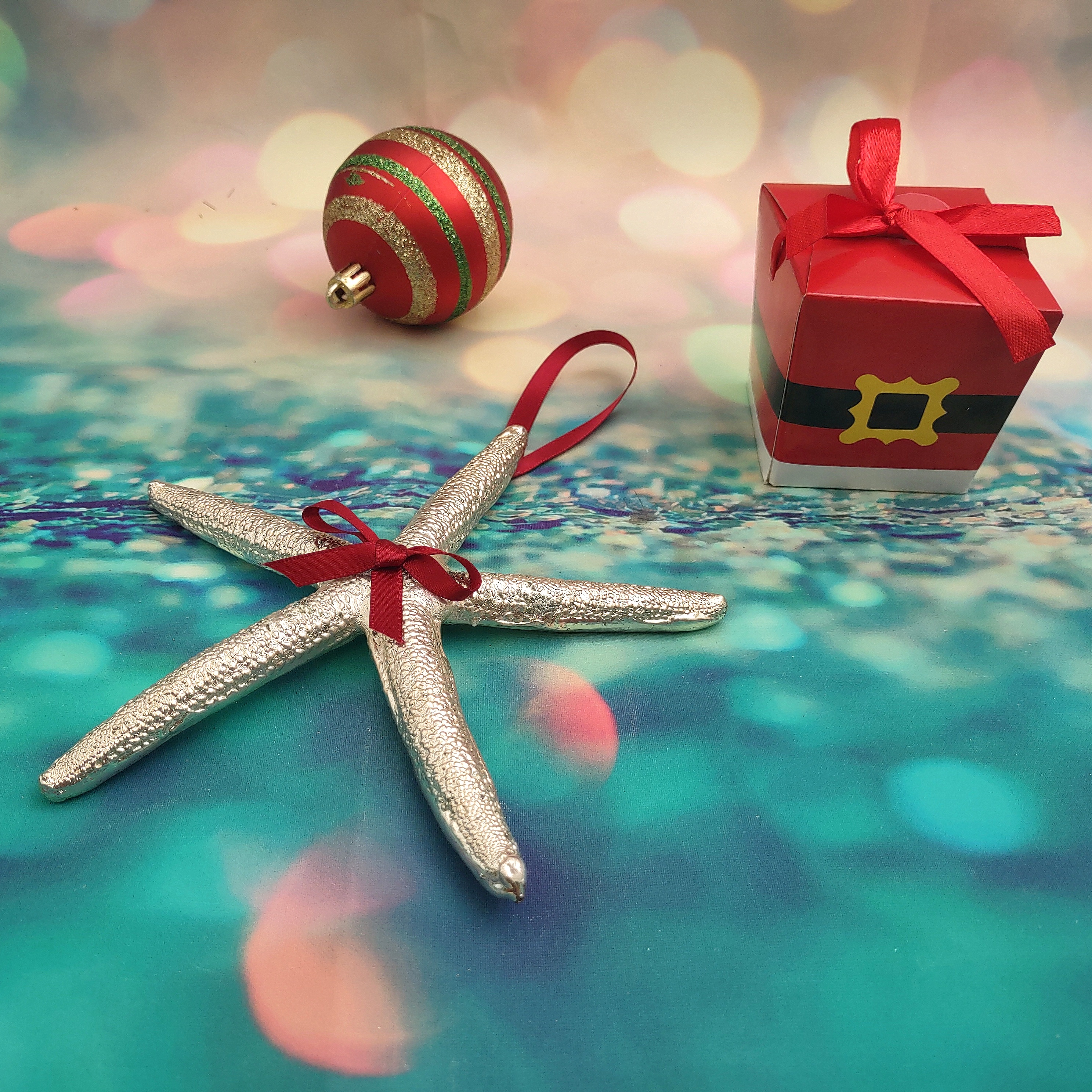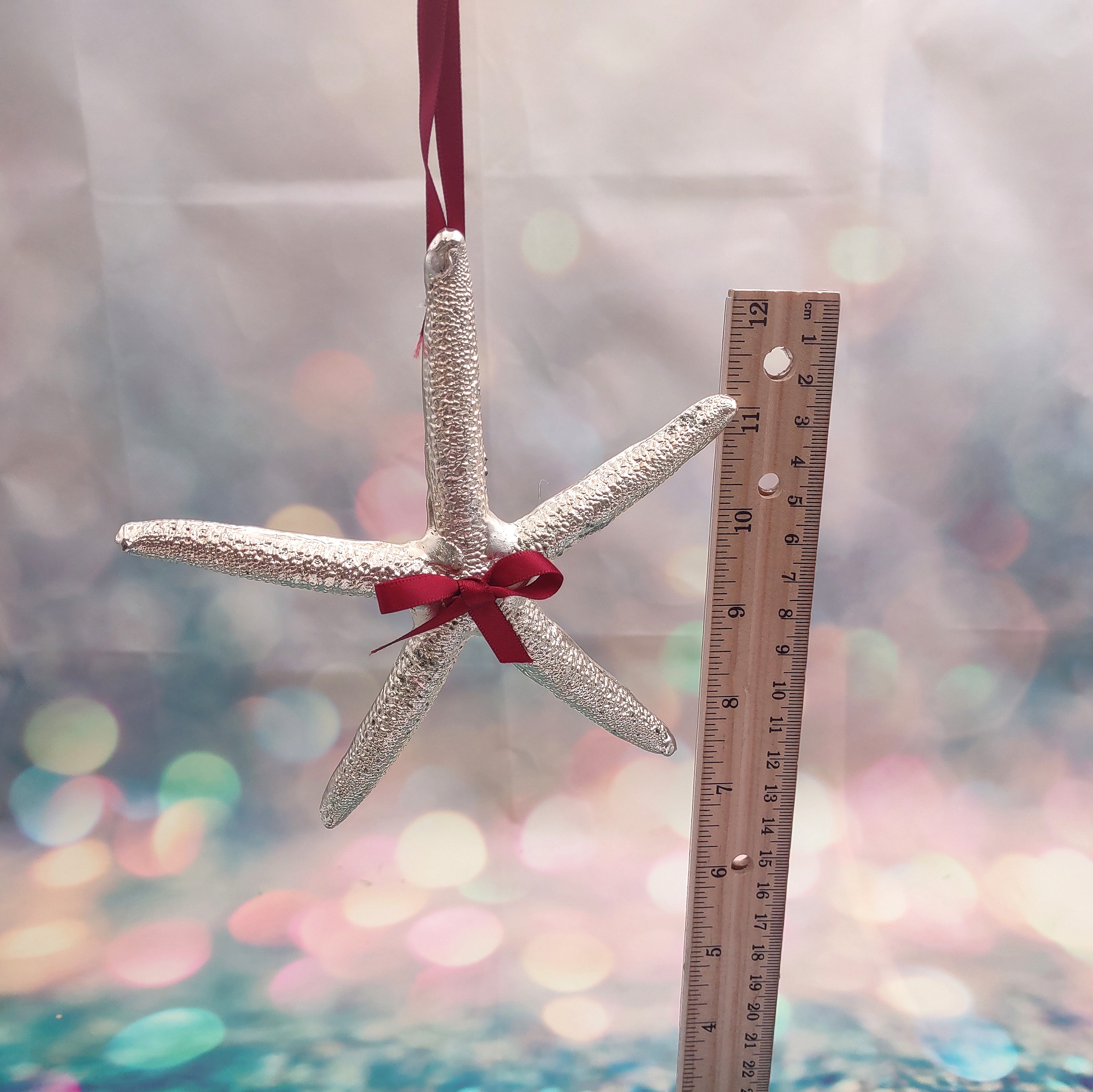 Customers often search for: 4 5 6 inch starfish, Christmas Ornament, hanging starfish, Holiday star fish, natural silver star, red ribbon starfish, seasonal starfish, shell decoration, shell for xmas tree, silver dip starfish, Silver Plate Linckia, silver polish shell, star xmas ornament
