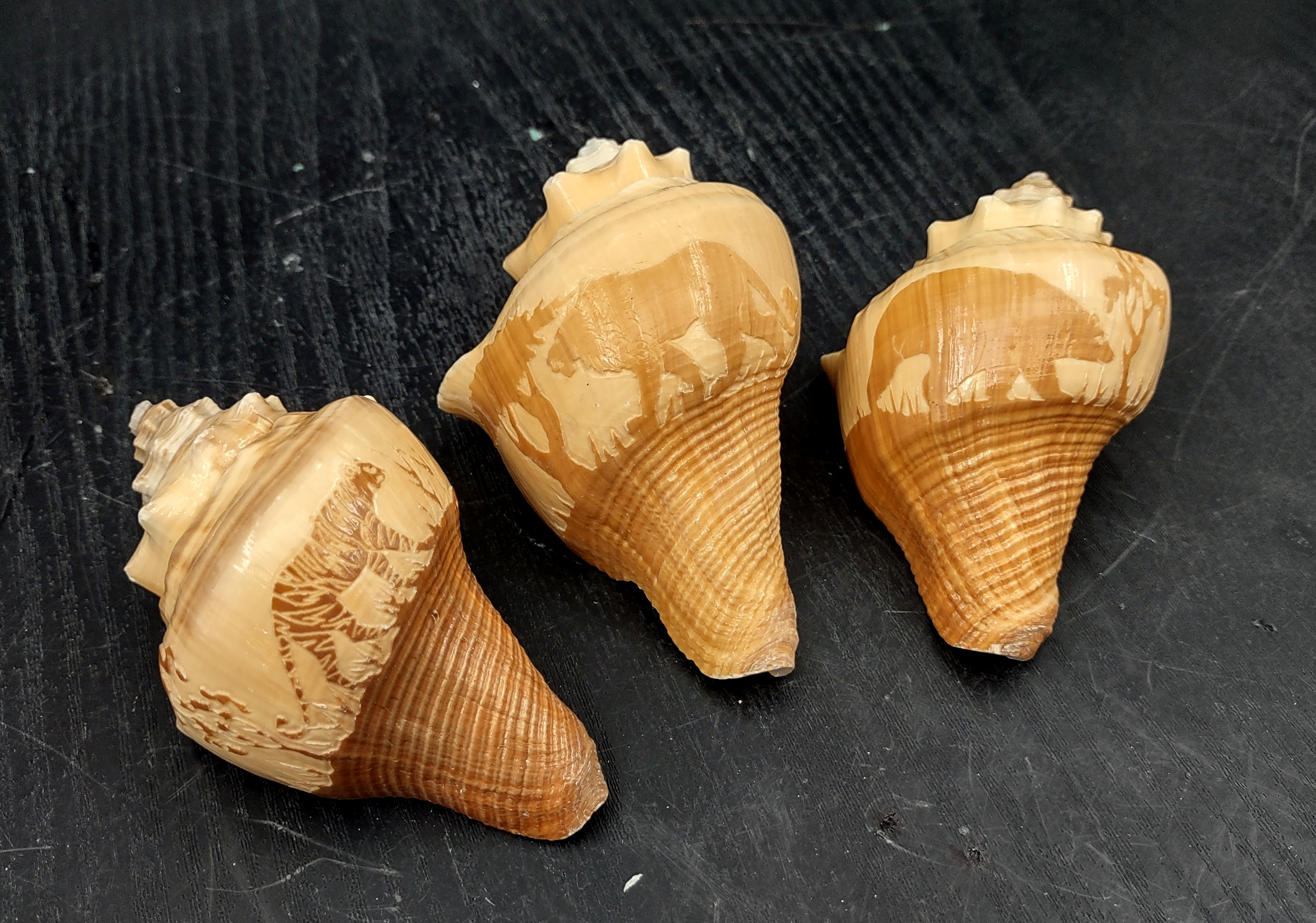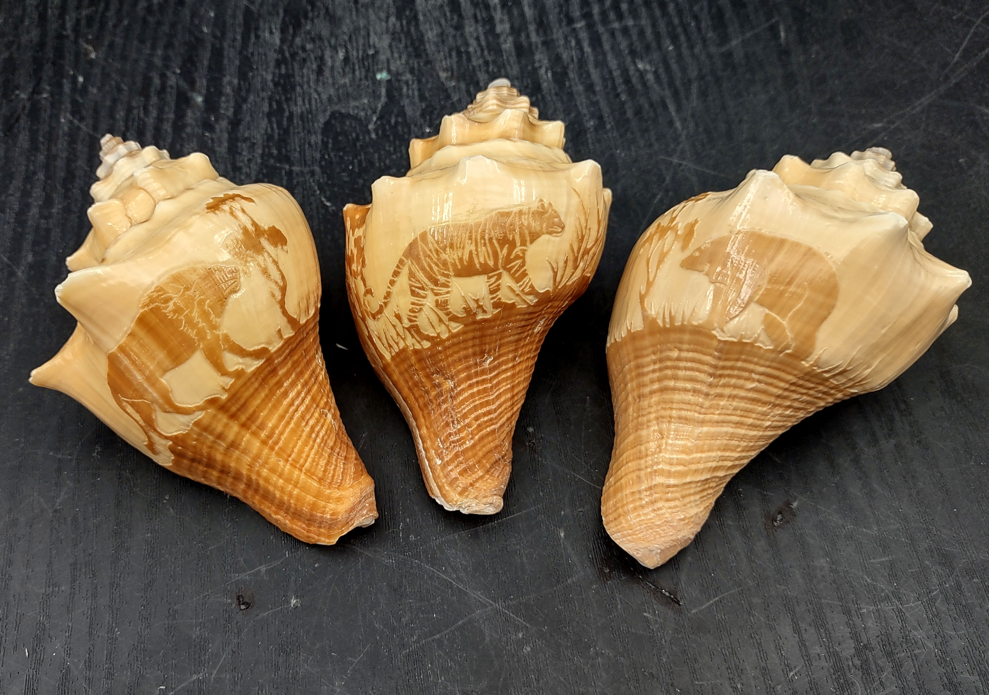 This is a set of three carved conch seashells. The original color of the sea shell is dark and light brown, and the carvings include a lion, a tiger and a bear design.