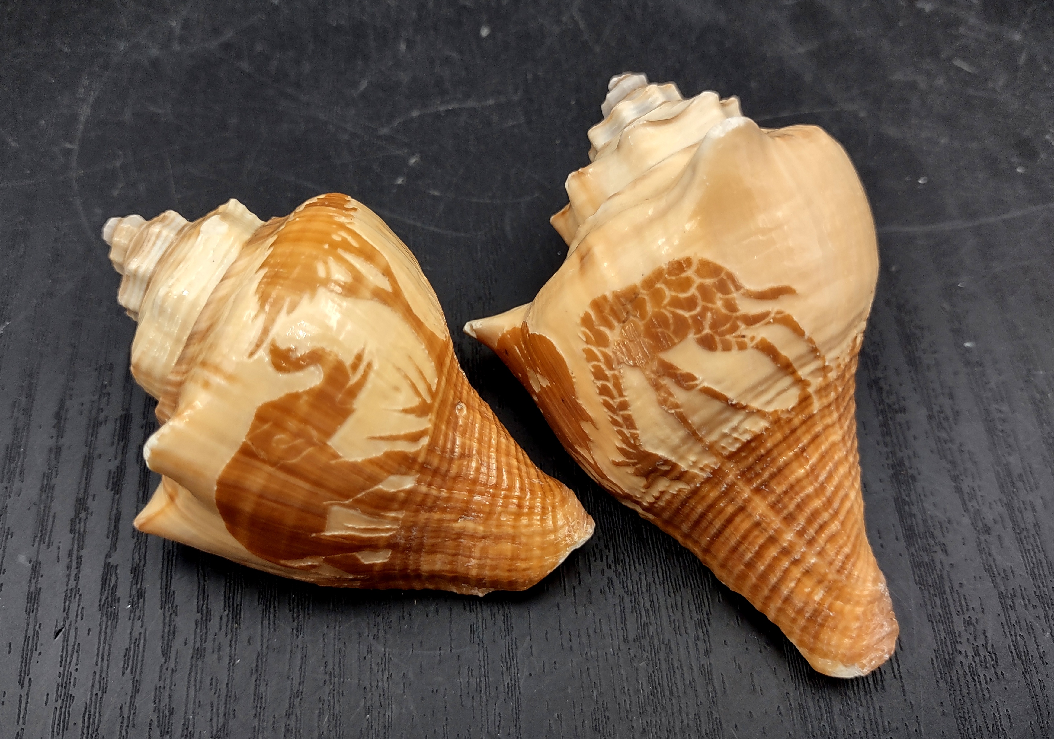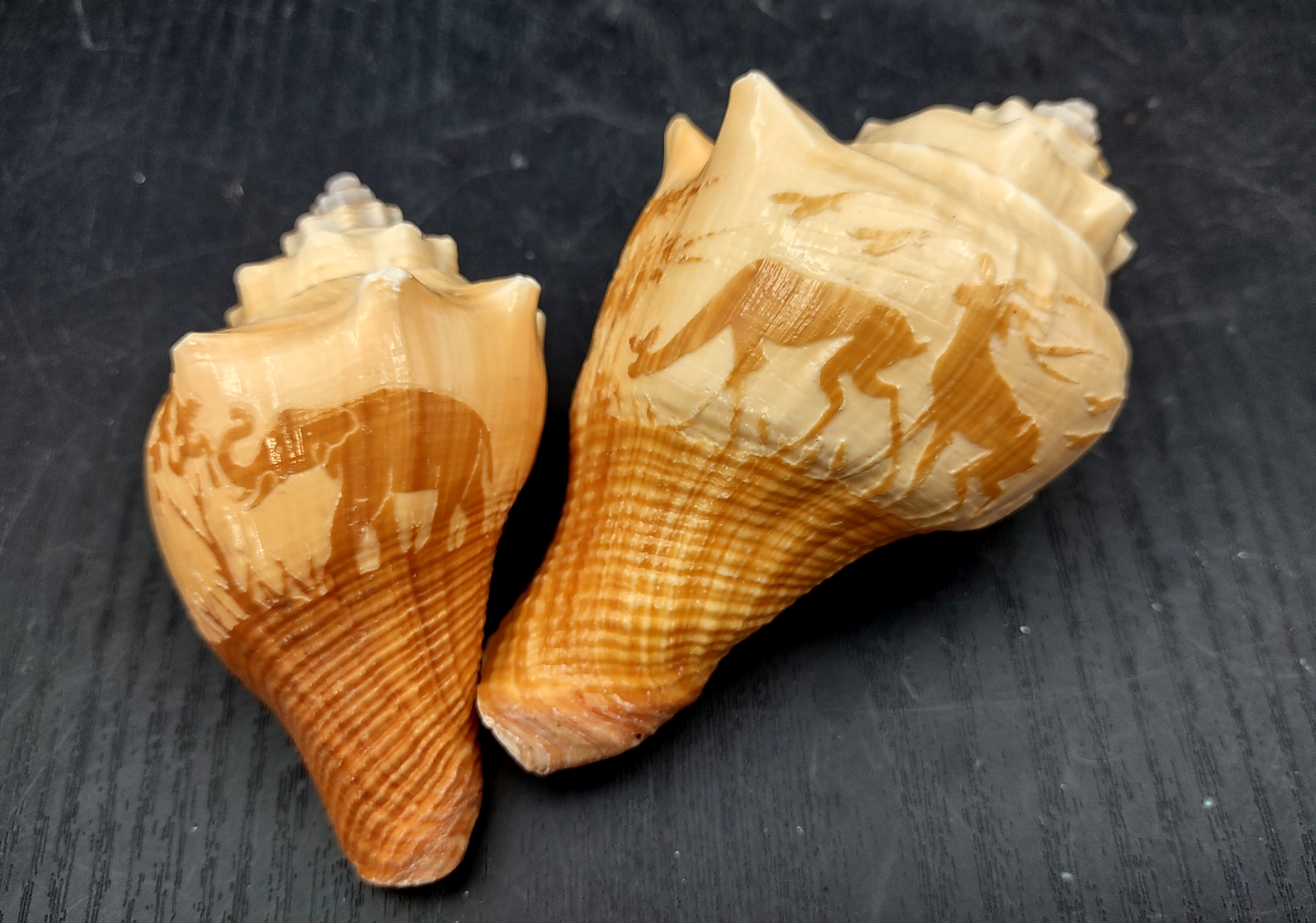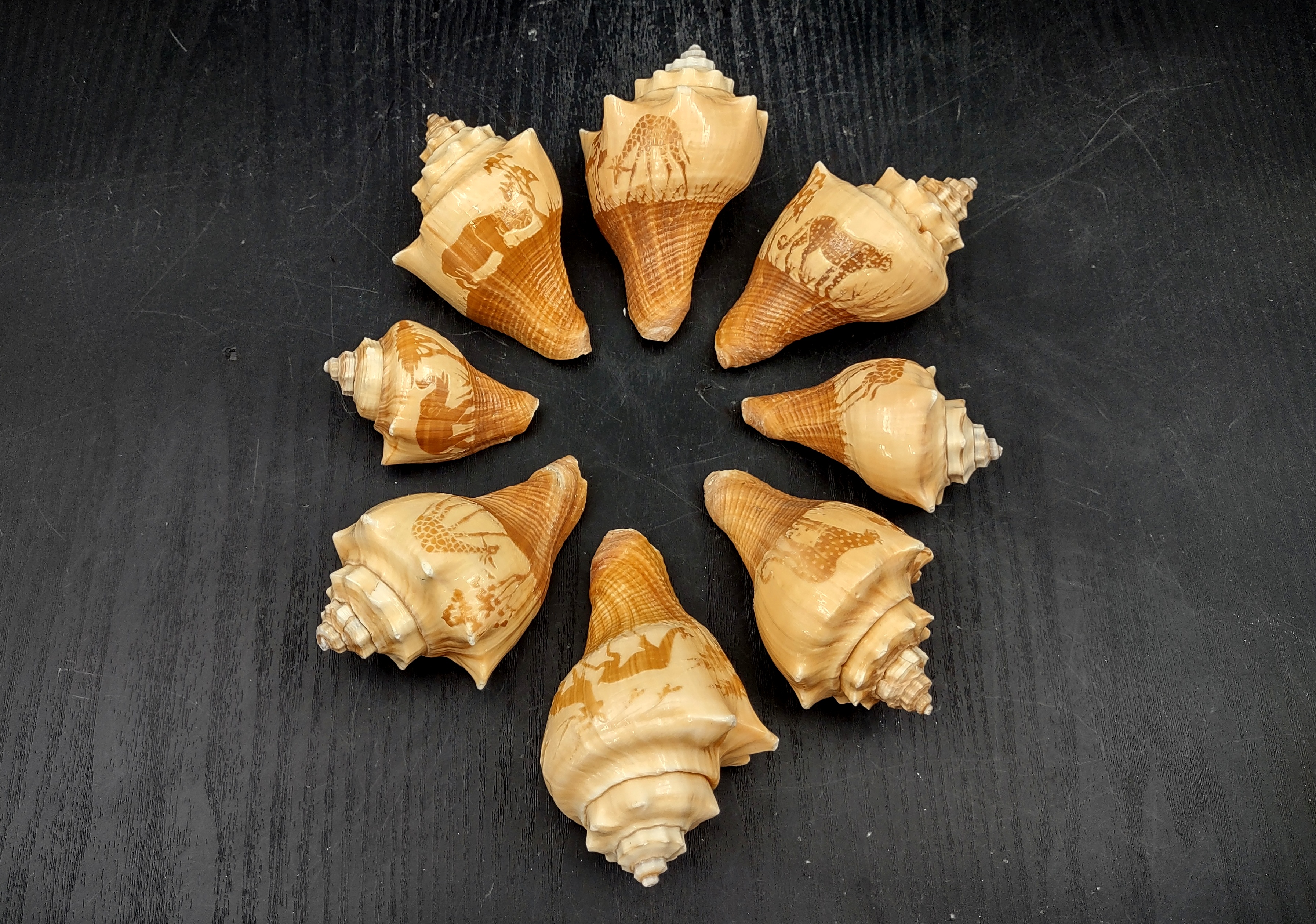 This is a set of five carved conch seashells. The original color of the sea shell is dark and light brown, and the carvings include various designs, including Elephant, Antelope, Hippo, Cheetah, Giraffes. Carved Conch Seashell Decorative sets are admired for their intricately designed surfaces and artistic potential. Perfect for starting coastal sculptures or crafting bespoke ornaments, they elevate home and office decor with a touch of artisanal flair, inspiring personalized expressions of style and creativity.