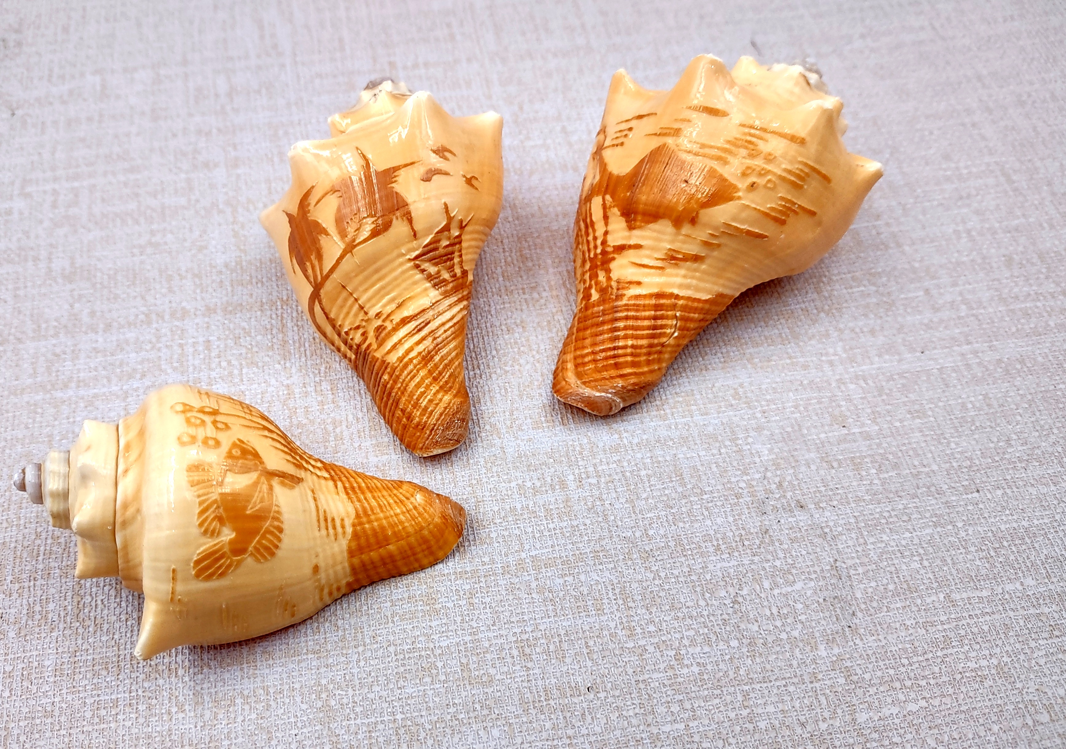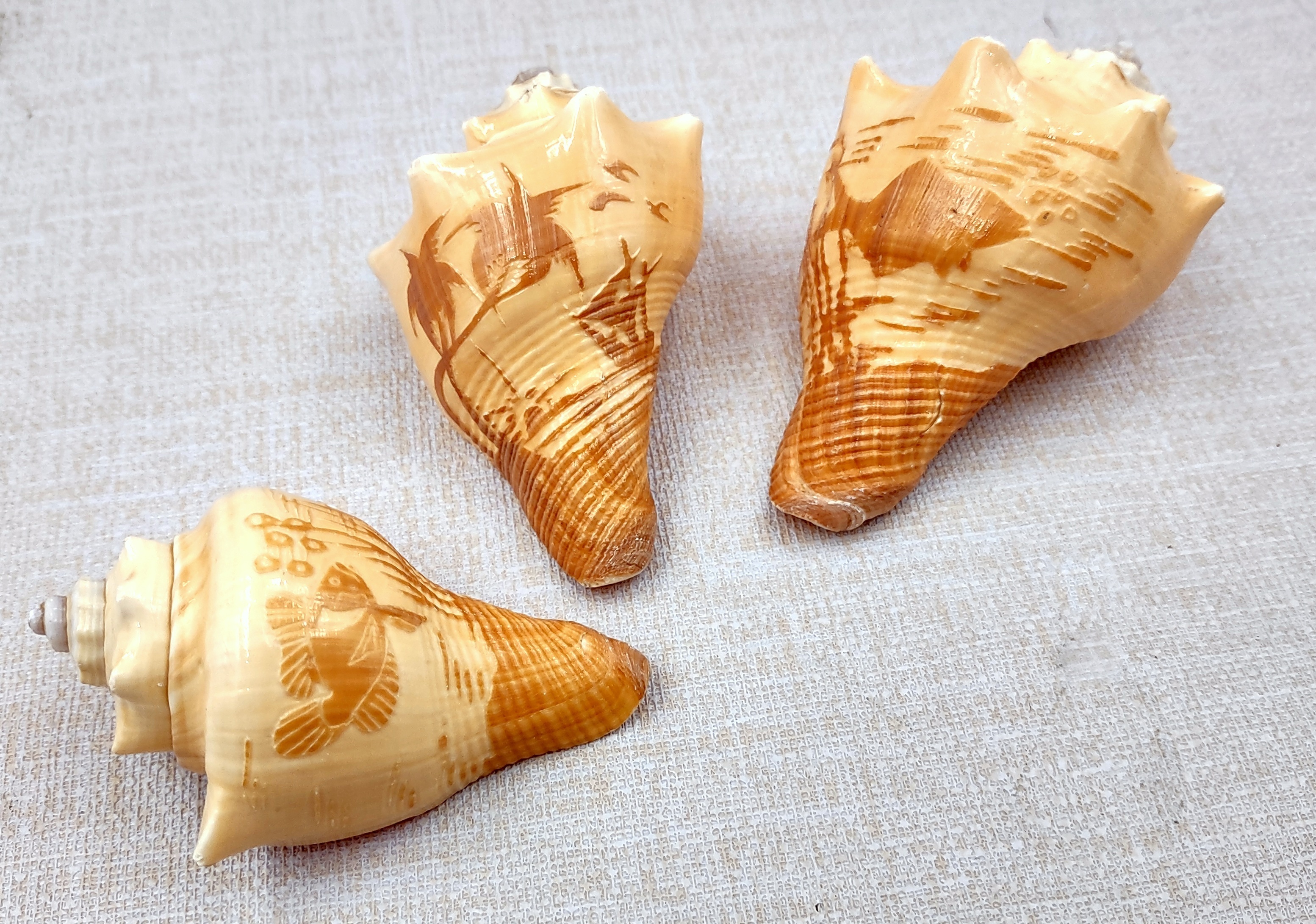 Carved Conch Seashell Decorative Set Two Fish And Sunset (3 shells approx. 3+ inches) Carved Conch shells for coastal crafting & gifting!