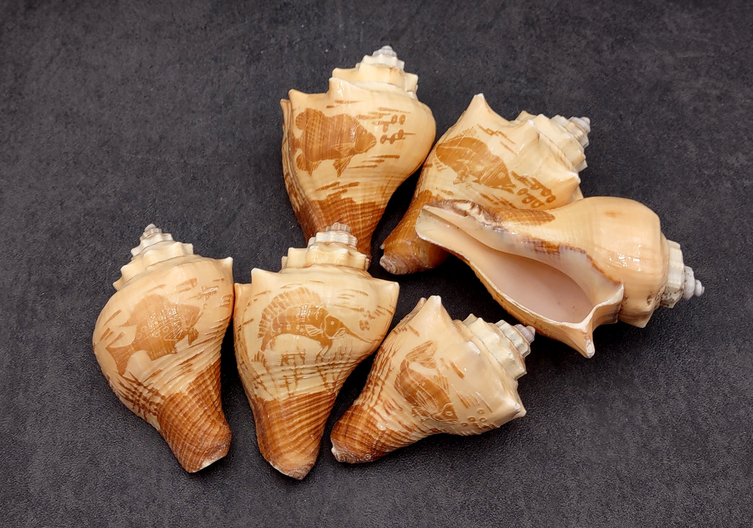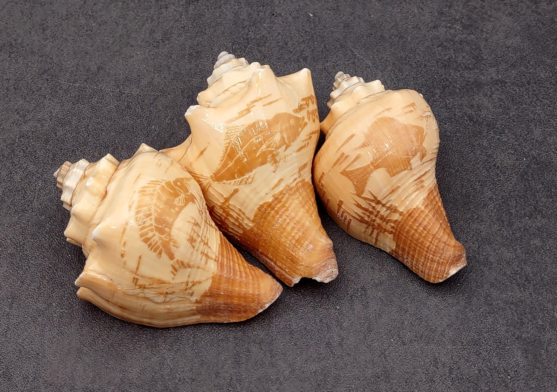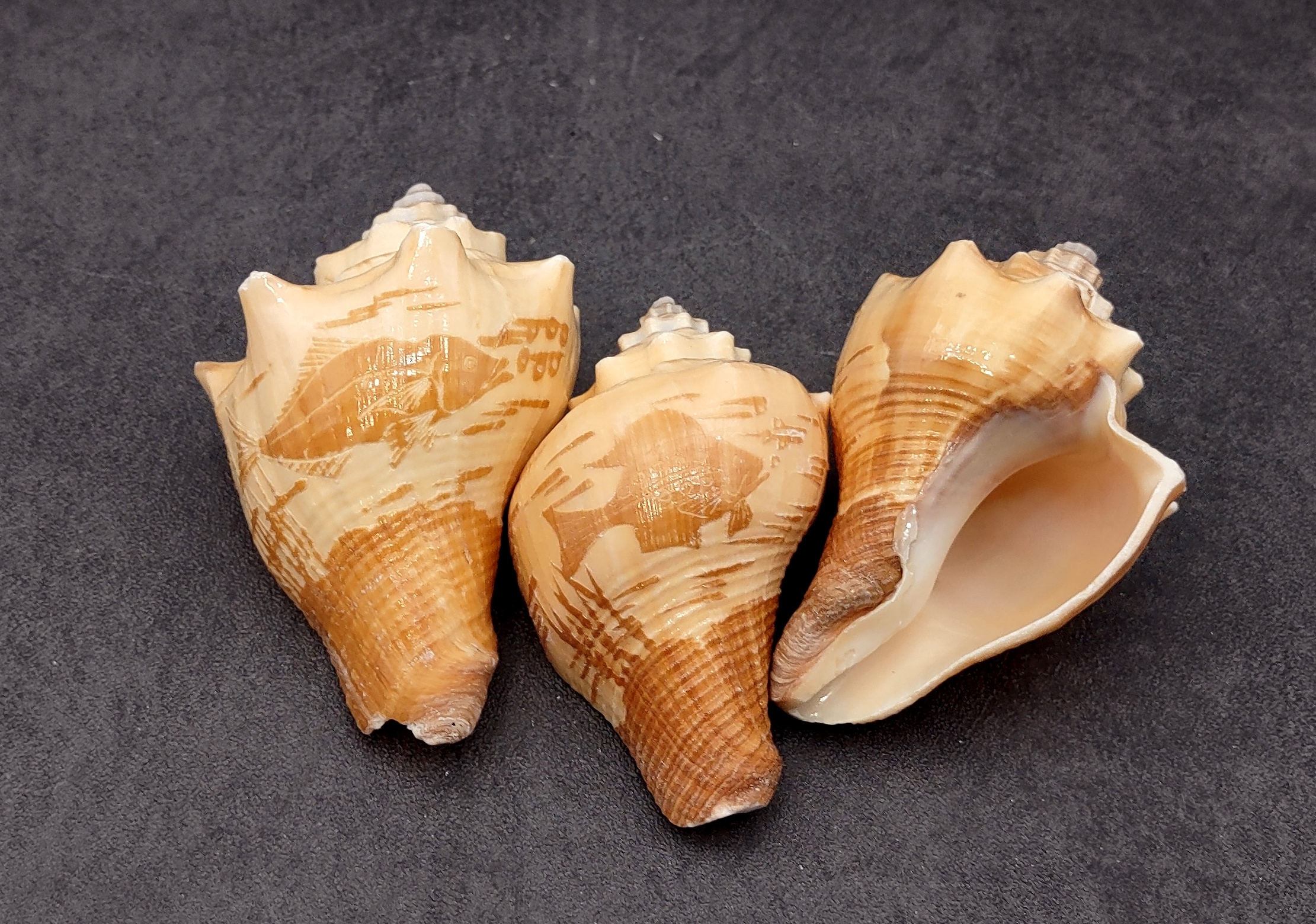This is a set of three carved conch seashells. The original color of the sea shell is dark and light brown, and the carvings with a fish design.