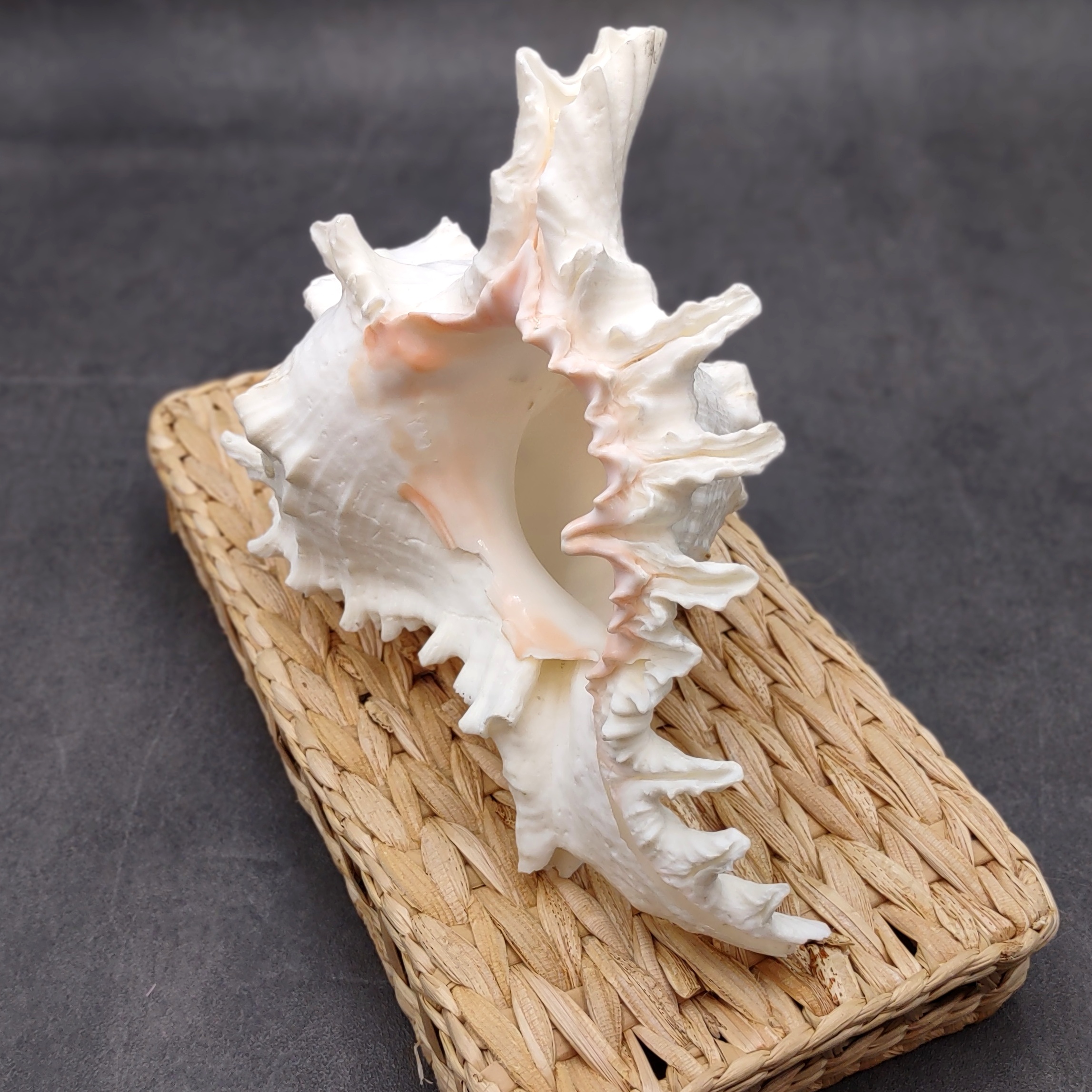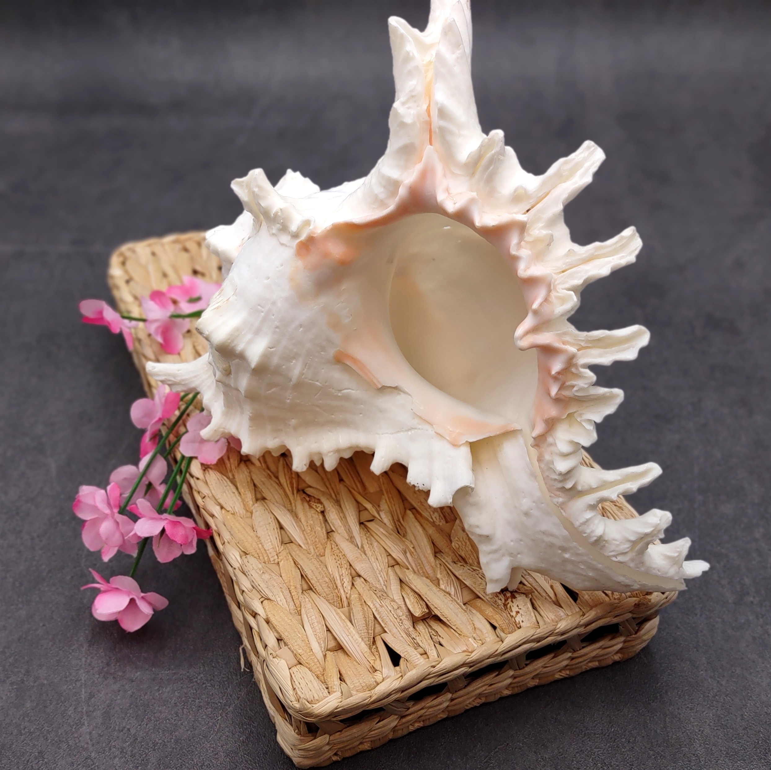 White Murex Seashell Horn Trumpet Musical Instrument (approx. 7+ inches) is a natural ocean shell often used as a functional blowing horn and decorative display piece. Each shell features a sturdy structure and natural spiral form that produces a deep, resonant tone when blown, making it a unique musical instrument for performers, collectors, and cultural or ceremonial use.
