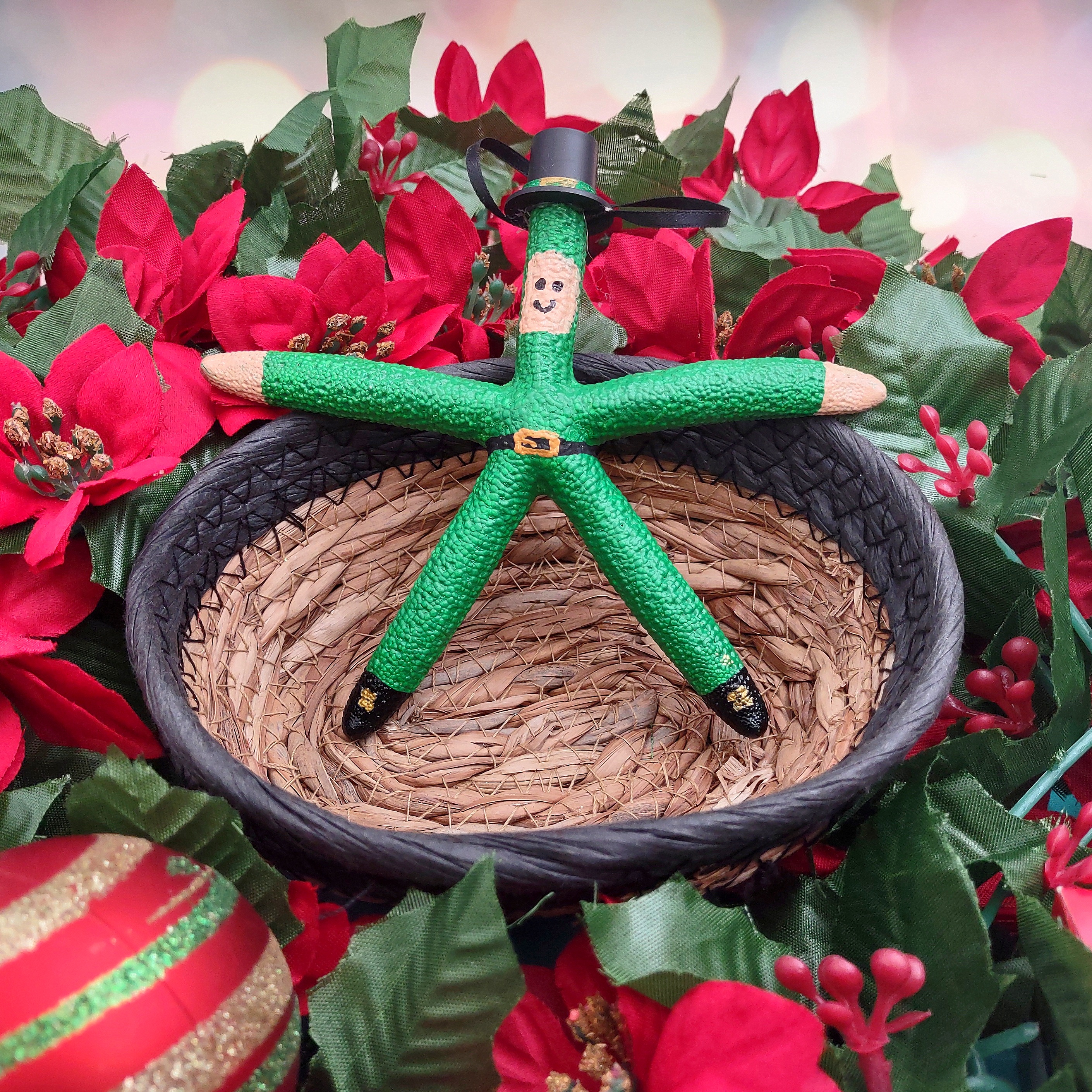 White linckia finger starfish is cleverly decorated as a green painted leprechaun. It is adorned with a black top hat and gold buckled black painted belt. There is a small black ribbon on hat that you can use to hang from a christmas tree, a wall hook, or give as a gift! Perfect for your holiday decor.