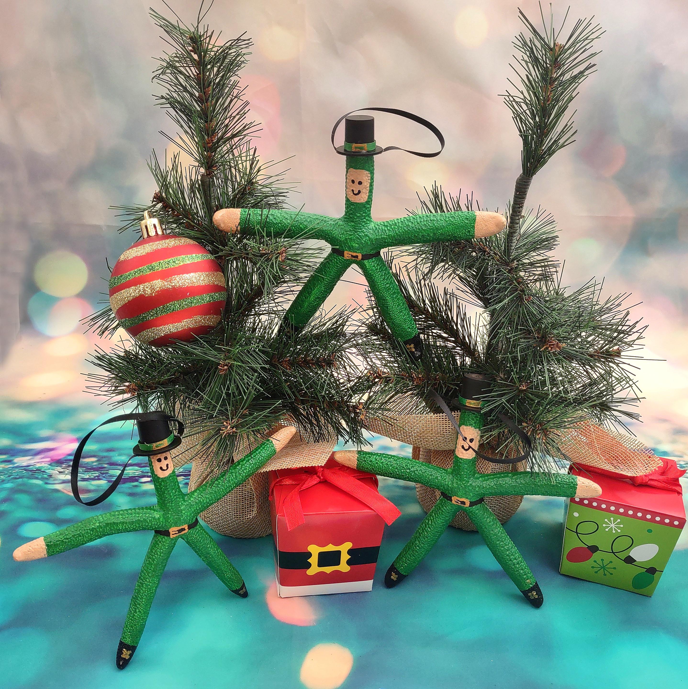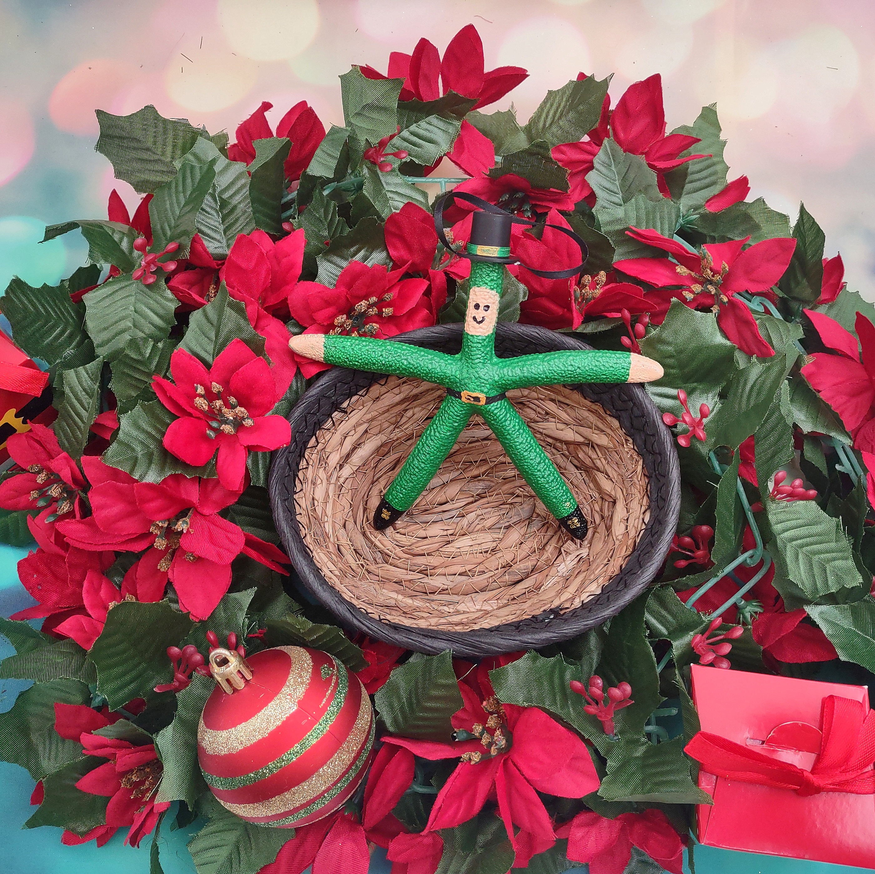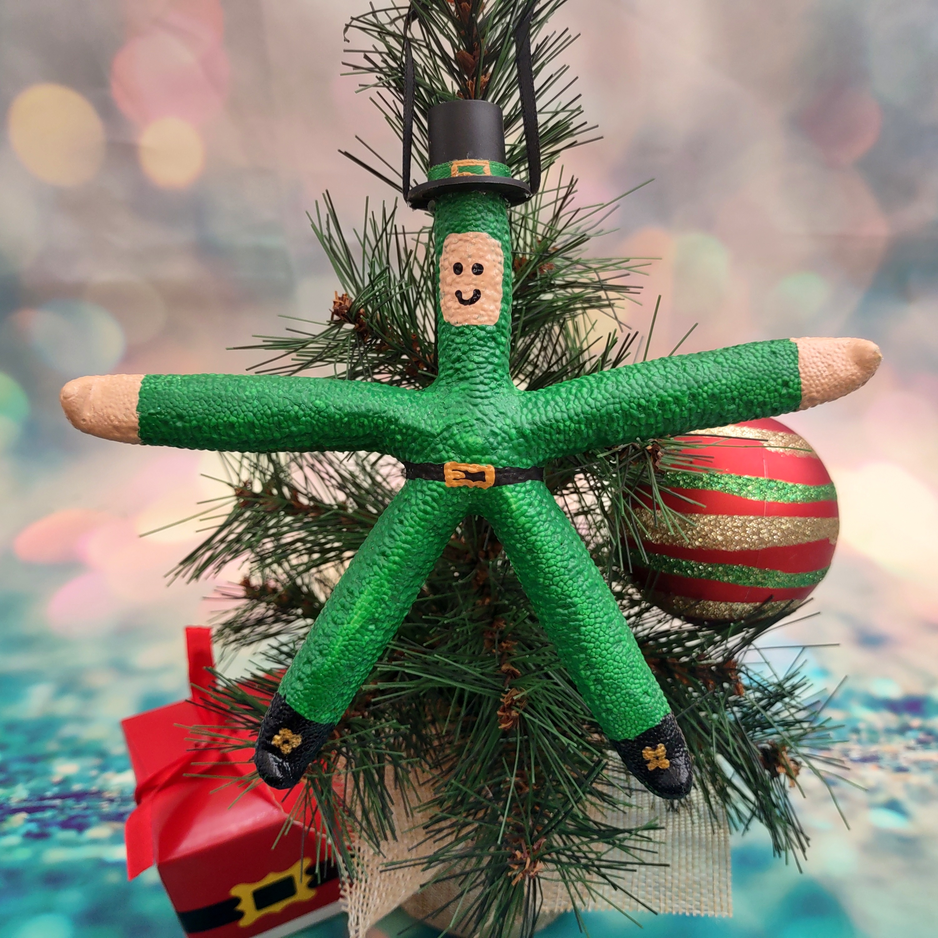 White linckia finger starfish is cleverly decorated as a green painted leprechaun. It is adorned with a black top hat and gold buckled black painted belt. There is a small black ribbon on hat that you can use to hang from a christmas tree, a wall hook, or give as a gift! Perfect for your holiday decor.